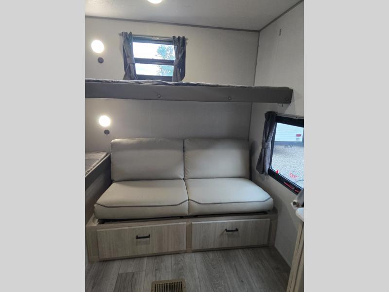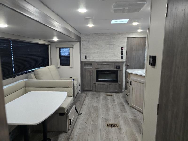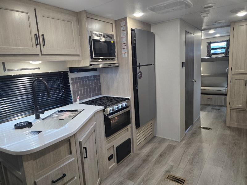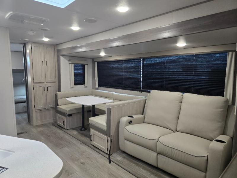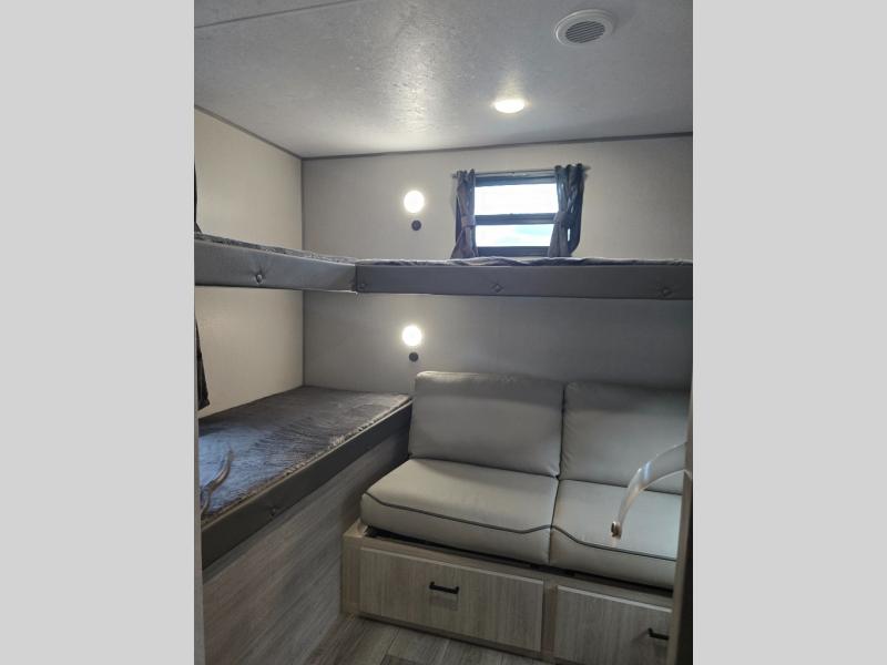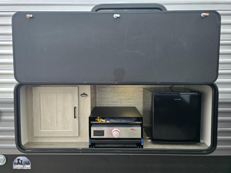 Not only will you be comfortable in this trailer, your friends will have comfort and privacy thanks to having their own bunkhouse, and you'll have a front bedroom where you can sleep like royalty! There are three bunk beds and a jack knife sofa with storage totes below plus a TV cabinet if you want to add a television here. The combined living and kitchen is spacious thanks to the slide out U-shaped dinette and sofa with drink holders. You can even add the fireplace option if you want that feature. The cook will have full amenities to whip up meals including overhead cabinets for dishes and snacks. And the exterior camper kitchen allows the cook to visit with everyone outside under the 18' electric awning that includes multicolor LED lights with a remote.