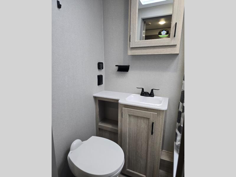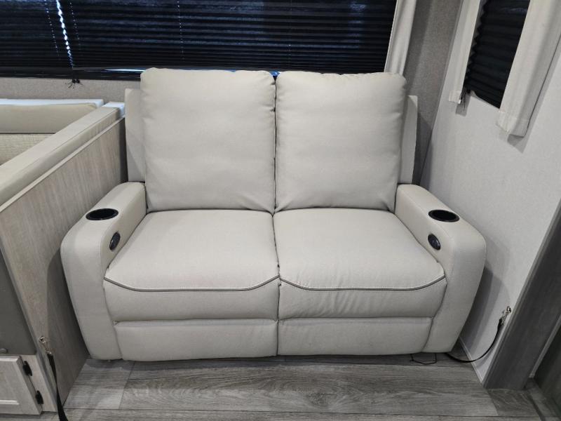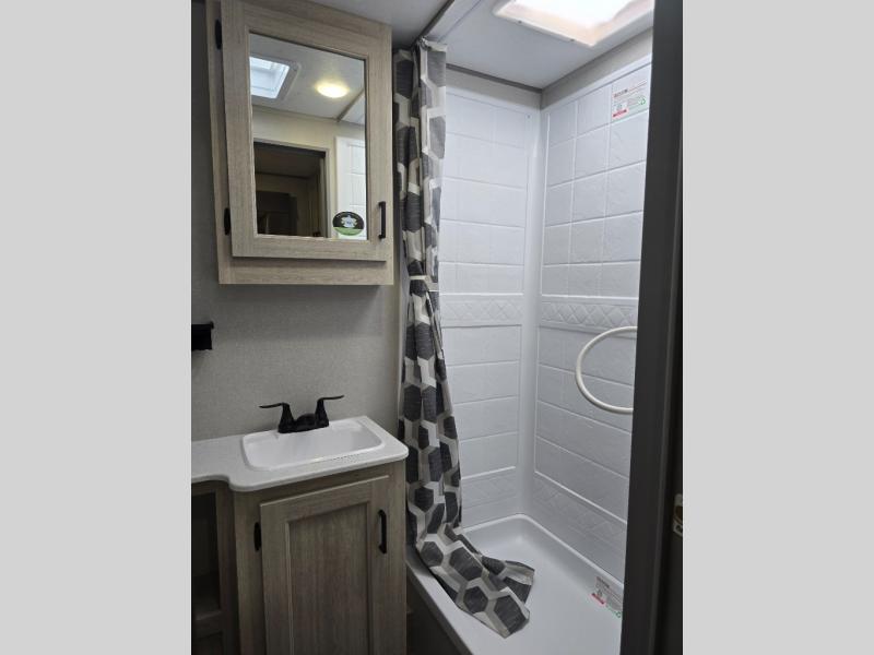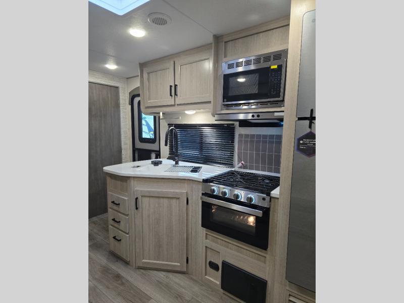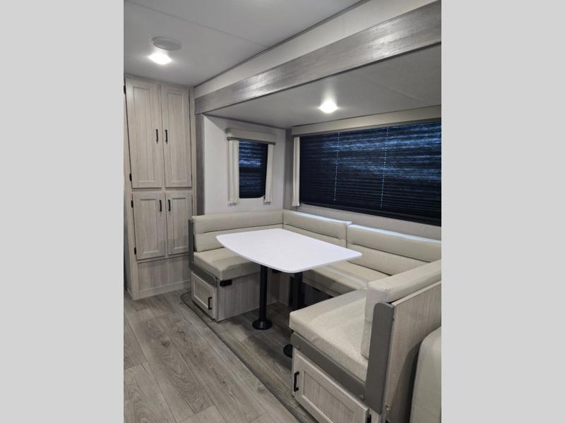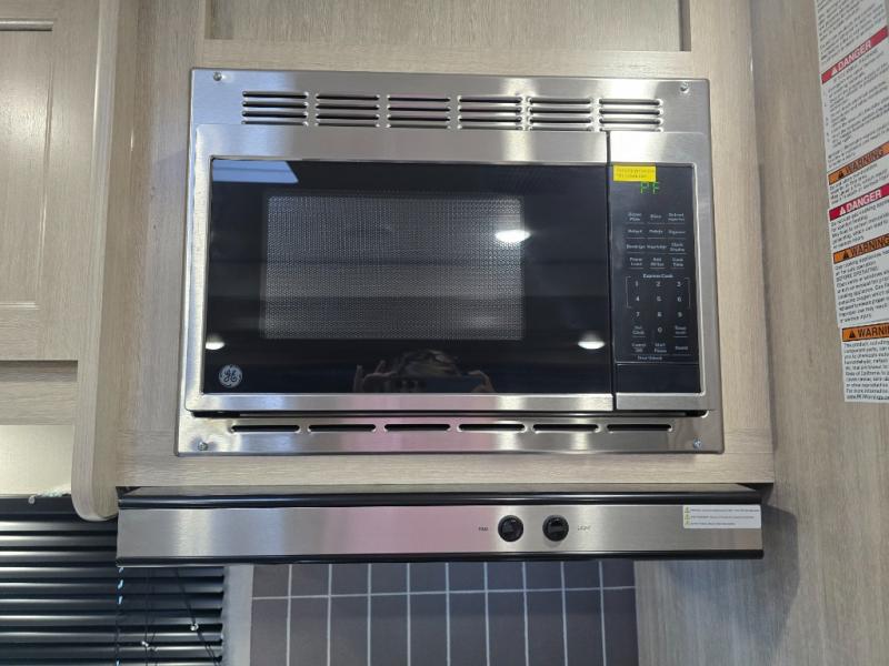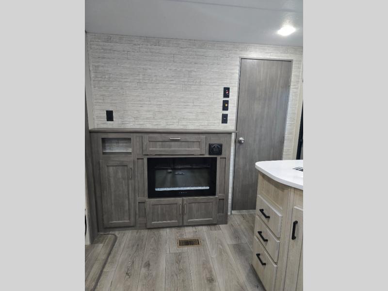 Not only will you be comfortable in this trailer, your friends will have comfort and privacy thanks to having their own bunkhouse, and you'll have a front bedroom where you can sleep like royalty! There are three bunk beds and a jack knife sofa with storage totes below plus a TV cabinet if you want to add a television here. The combined living and kitchen is spacious thanks to the slide out U-shaped dinette and sofa with drink holders. You can even add the fireplace option if you want that feature. The cook will have full amenities to whip up meals including overhead cabinets for dishes and snacks. And the exterior camper kitchen allows the cook to visit with everyone outside under the 18' electric awning that includes multicolor LED lights with a remote.