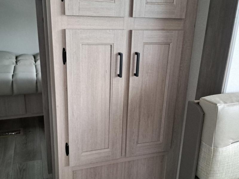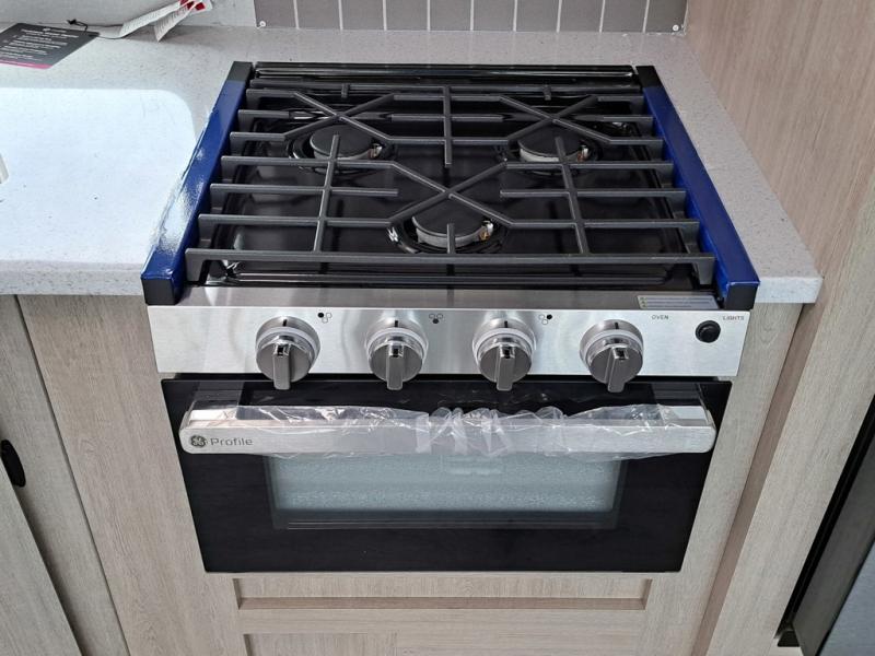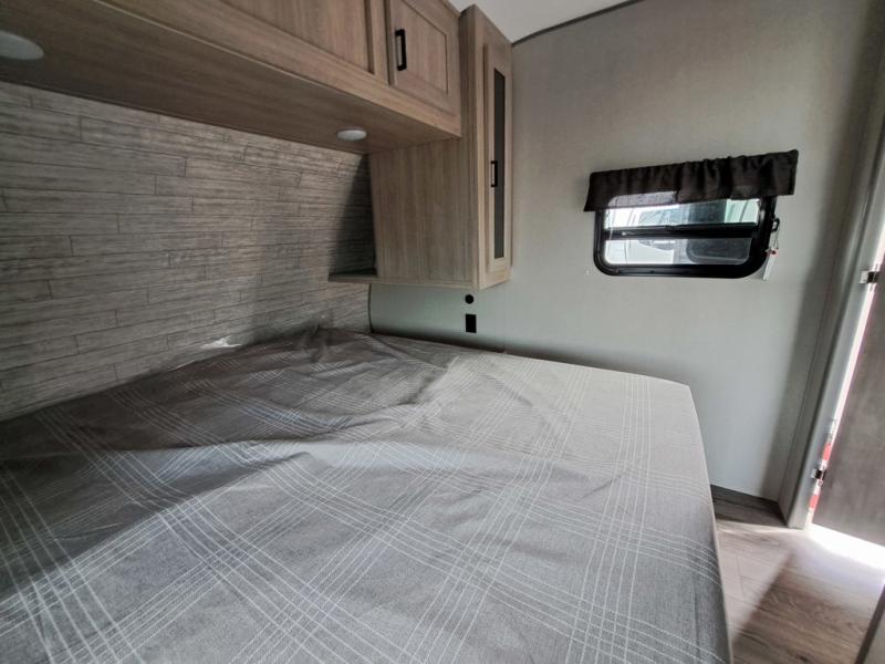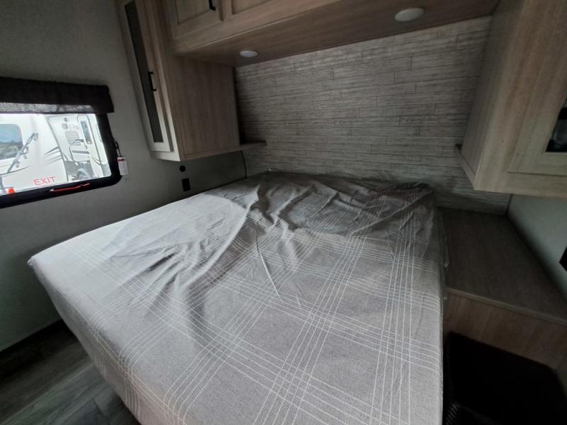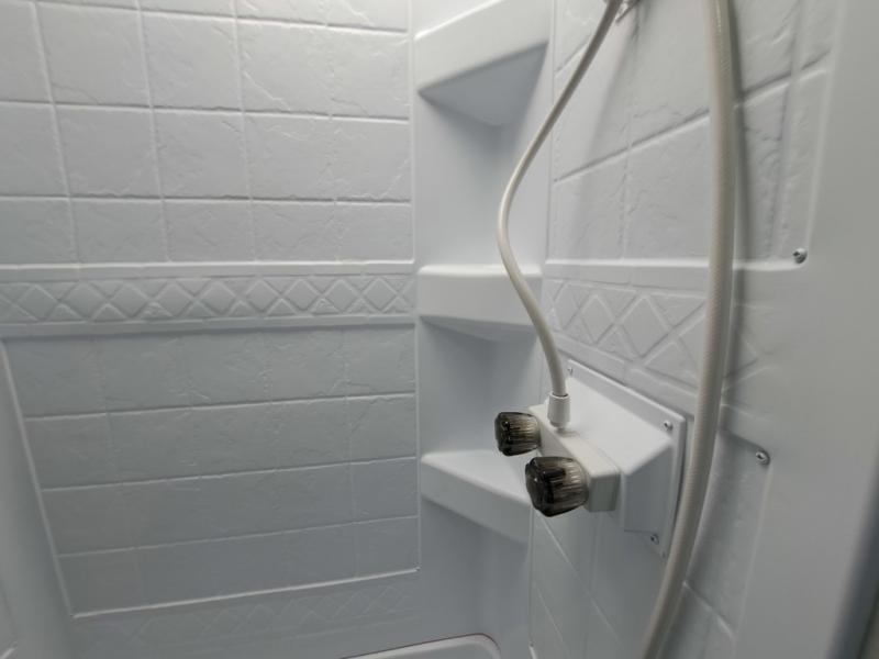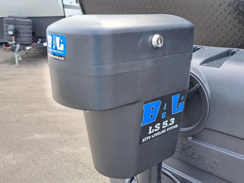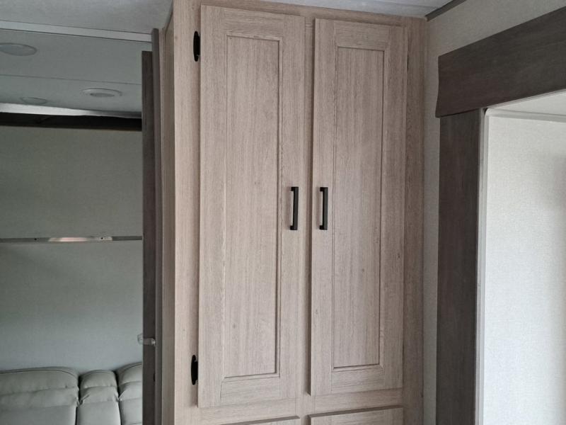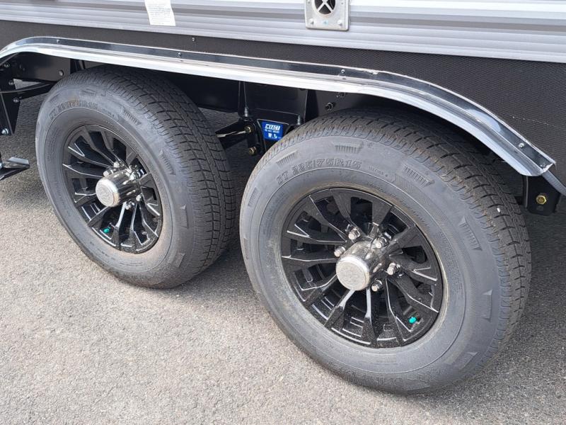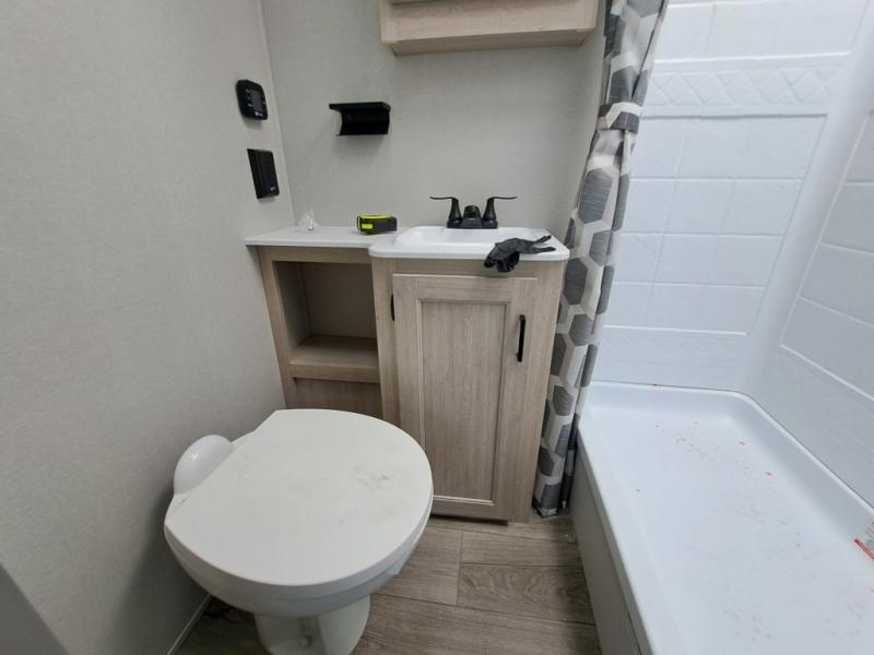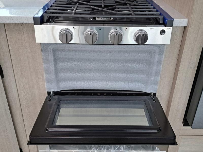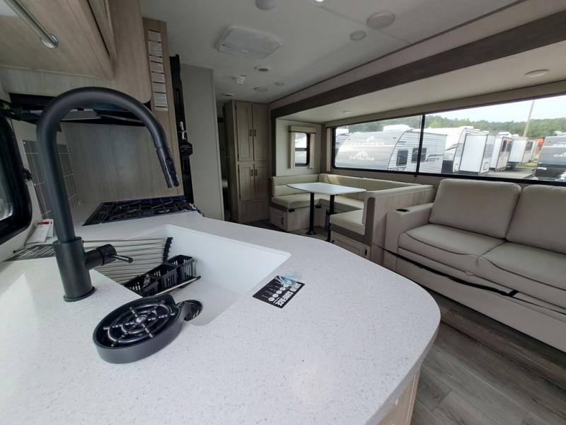 Not only will you be comfortable in this trailer, your friends will have comfort and privacy thanks to having their own bunkhouse, and you'll have a front bedroom where you can sleep like royalty! There are three bunk beds and a jack knife sofa with storage totes below plus a TV cabinet if you want to add a television here. The combined living and kitchen is spacious thanks to the slide out U-shaped dinette and sofa with drink holders. You can even add the fireplace option if you want that feature. The cook will have full amenities to whip up meals including overhead cabinets for dishes and snacks. And the exterior camper kitchen allows the cook to visit with everyone outside under the 18' electric awning that includes multicolor LED lights with a remote.