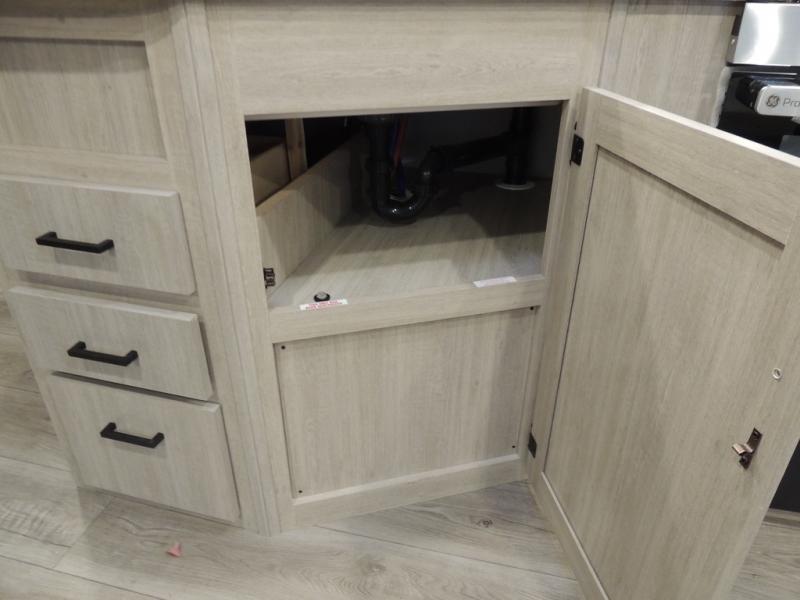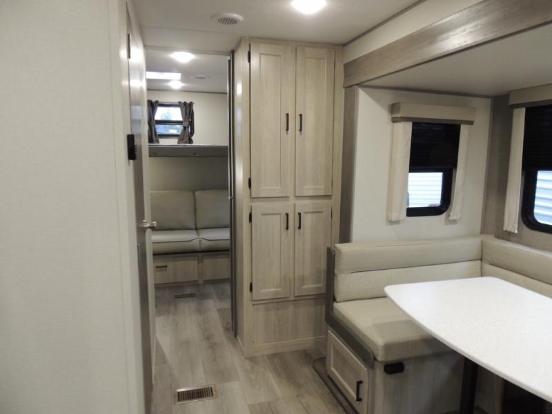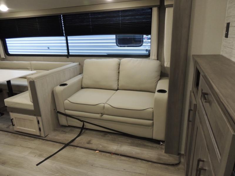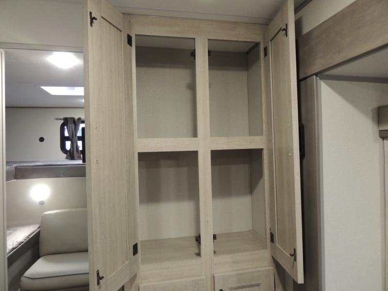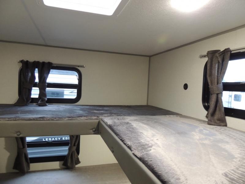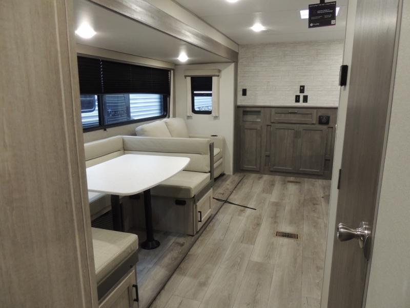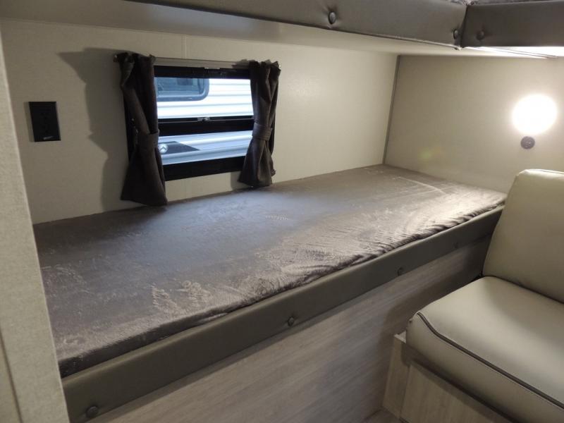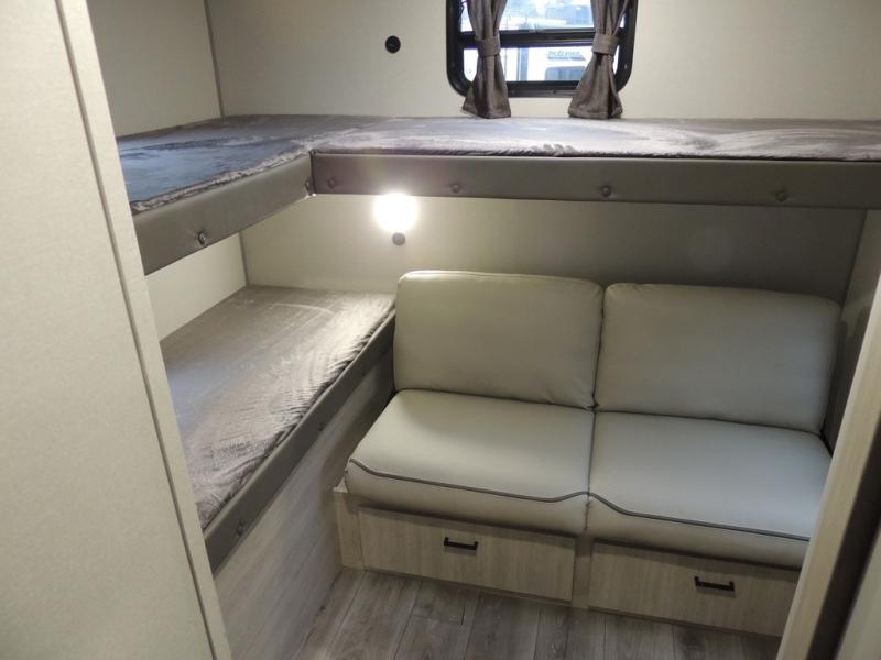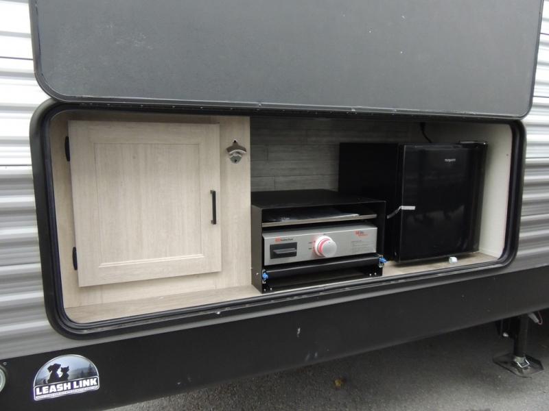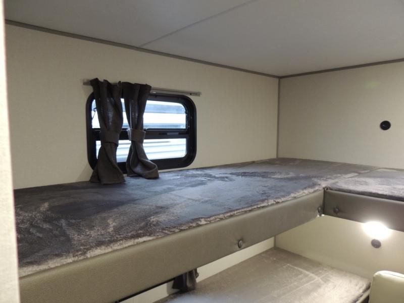 Not only will you be comfortable in this trailer, your friends will have comfort and privacy thanks to having their own bunkhouse, and you'll have a front bedroom where you can sleep like royalty! There are three bunk beds and a jack knife sofa with storage totes below plus a TV cabinet if you want to add a television here. The combined living and kitchen is spacious thanks to the slide out U-shaped dinette and sofa with drink holders. You can even add the fireplace option if you want that feature. The cook will have full amenities to whip up meals including overhead cabinets for dishes and snacks. And the exterior camper kitchen allows the cook to visit with everyone outside under the 18' electric awning that includes multicolor LED lights with a remote.