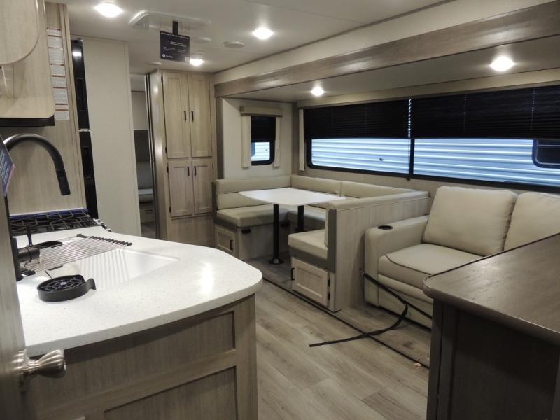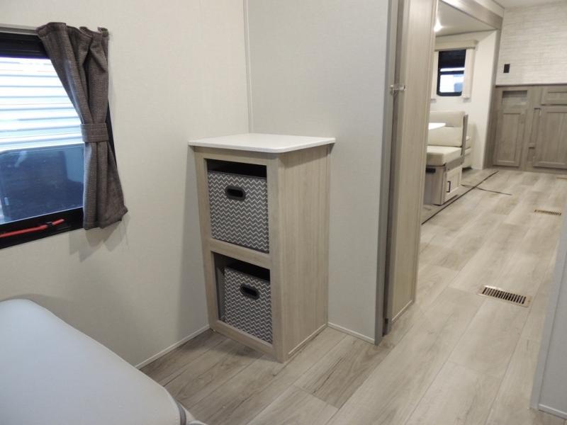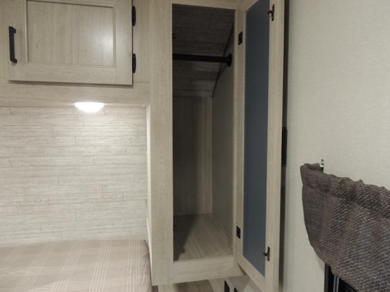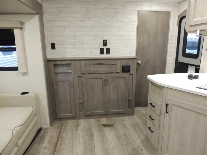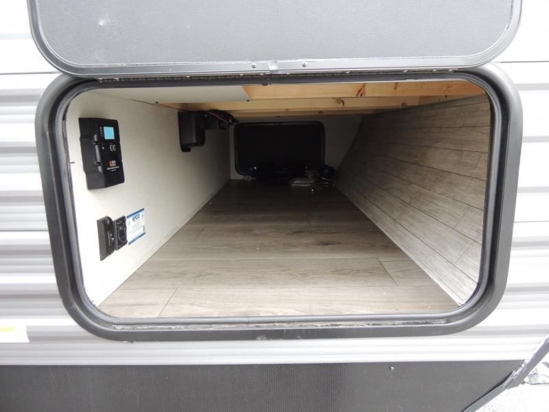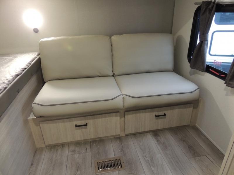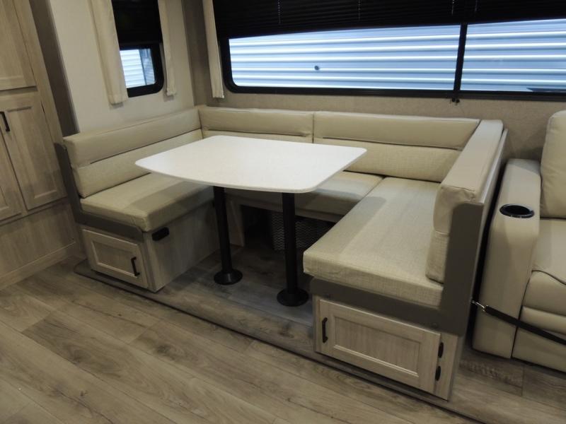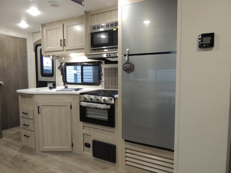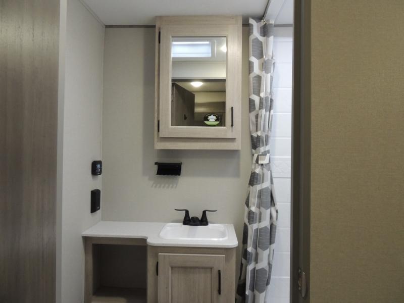 Not only will you be comfortable in this trailer, your friends will have comfort and privacy thanks to having their own bunkhouse, and you'll have a front bedroom where you can sleep like royalty! There are three bunk beds and a jack knife sofa with storage totes below plus a TV cabinet if you want to add a television here. The combined living and kitchen is spacious thanks to the slide out U-shaped dinette and sofa with drink holders. You can even add the fireplace option if you want that feature. The cook will have full amenities to whip up meals including overhead cabinets for dishes and snacks. And the exterior camper kitchen allows the cook to visit with everyone outside under the 18' electric awning that includes multicolor LED lights with a remote.