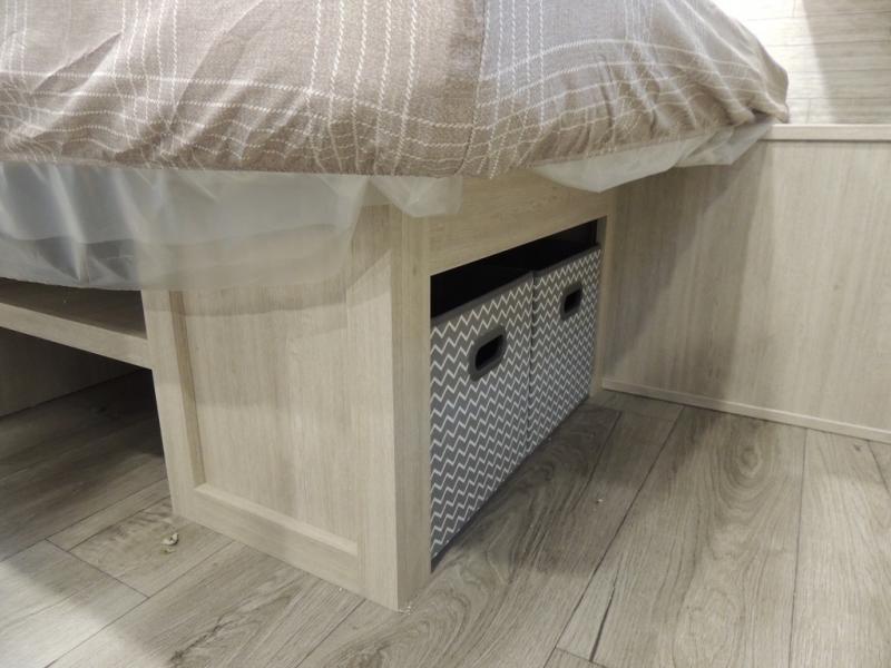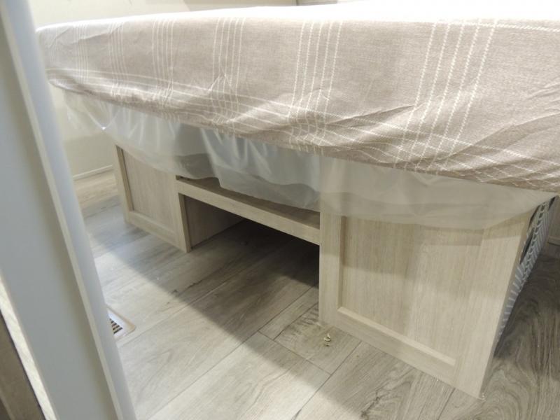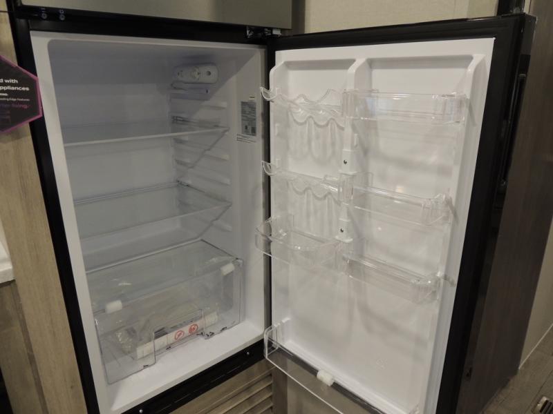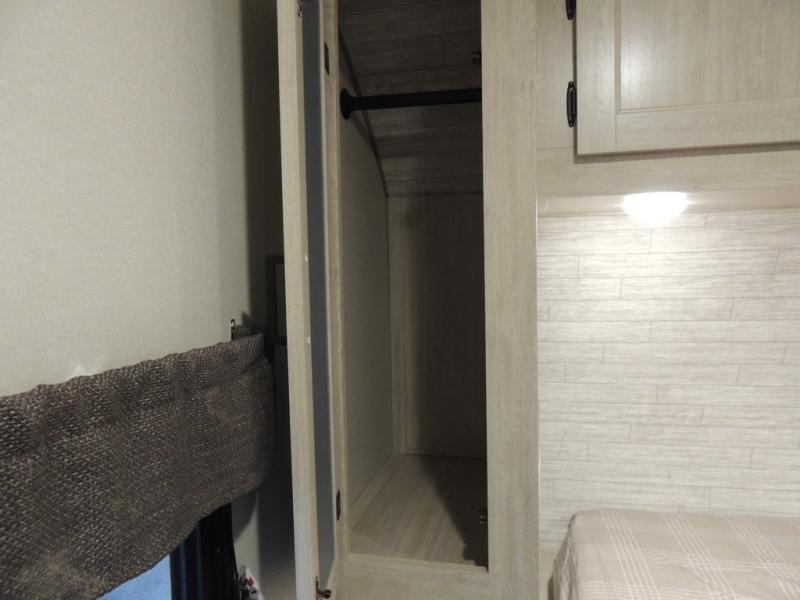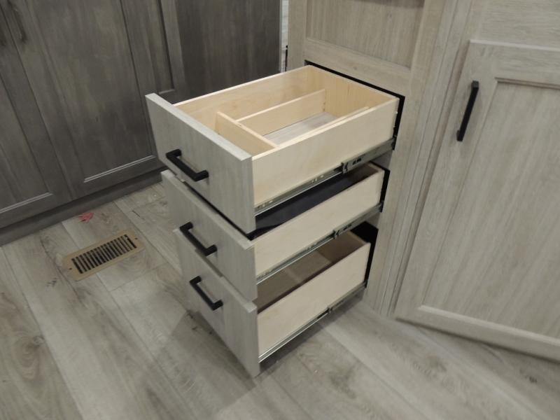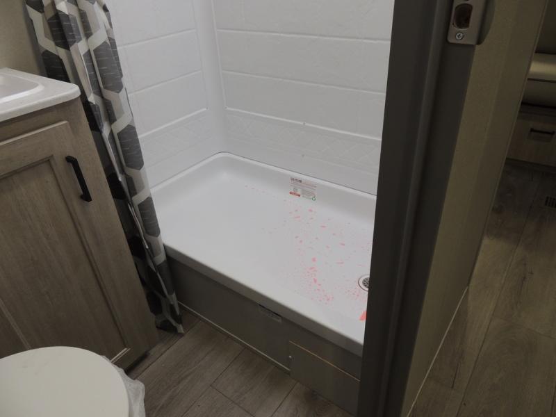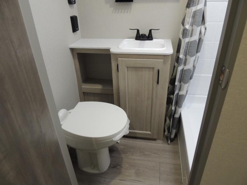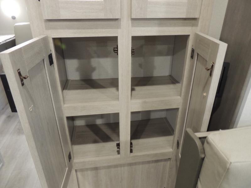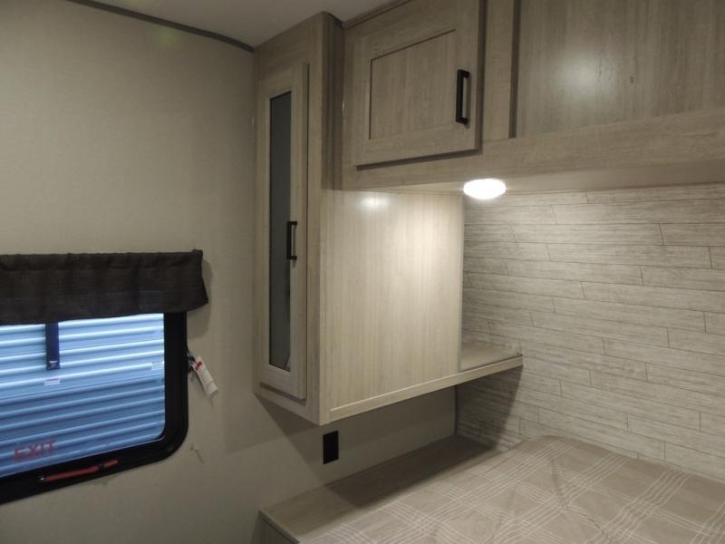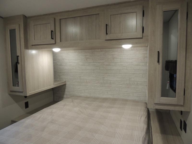 Not only will you be comfortable in this trailer, your friends will have comfort and privacy thanks to having their own bunkhouse, and you'll have a front bedroom where you can sleep like royalty! There are three bunk beds and a jack knife sofa with storage totes below plus a TV cabinet if you want to add a television here. The combined living and kitchen is spacious thanks to the slide out U-shaped dinette and sofa with drink holders. You can even add the fireplace option if you want that feature. The cook will have full amenities to whip up meals including overhead cabinets for dishes and snacks. And the exterior camper kitchen allows the cook to visit with everyone outside under the 18' electric awning that includes multicolor LED lights with a remote.