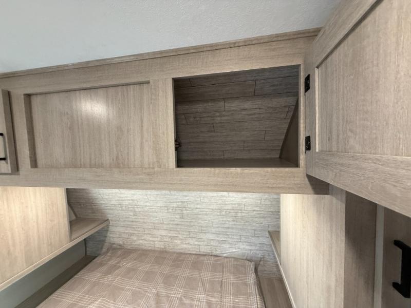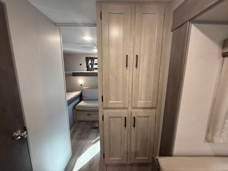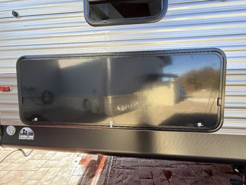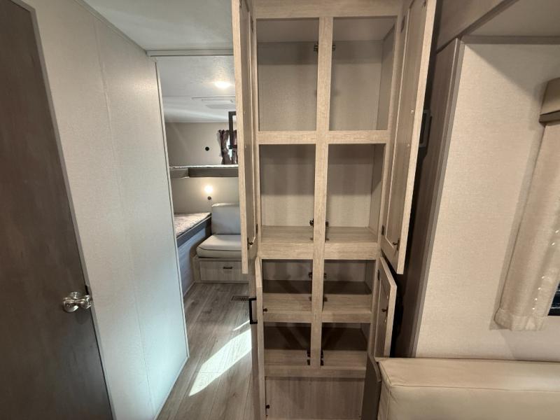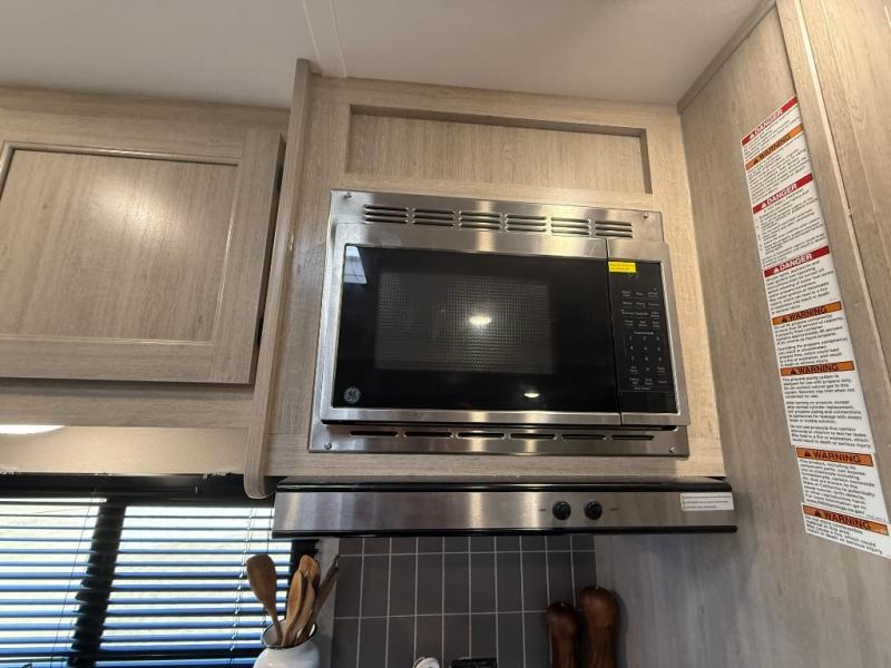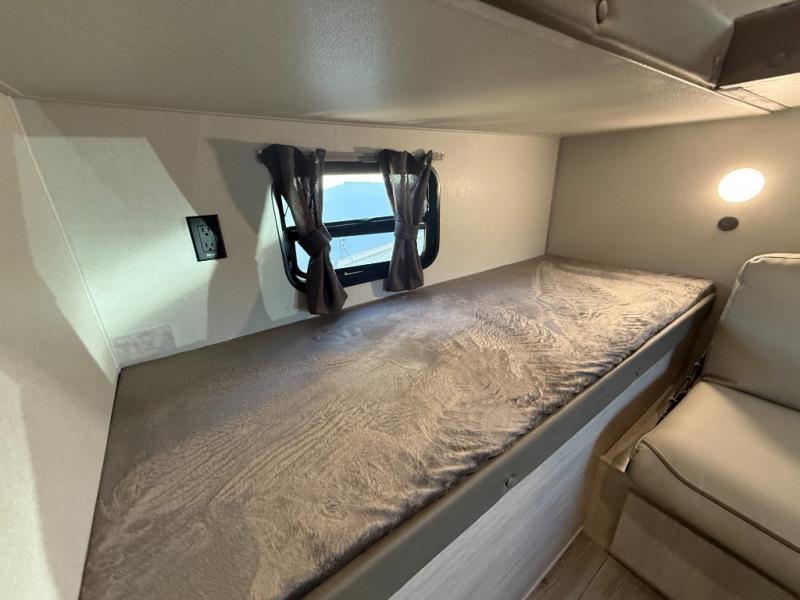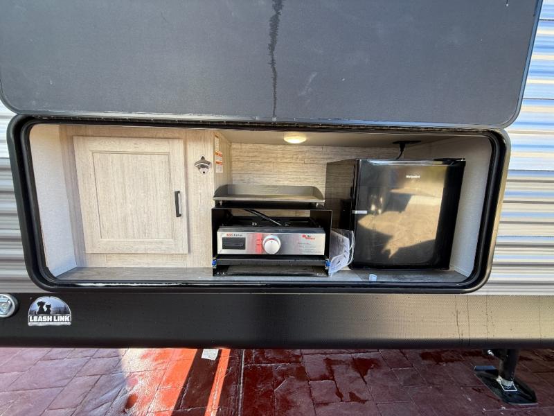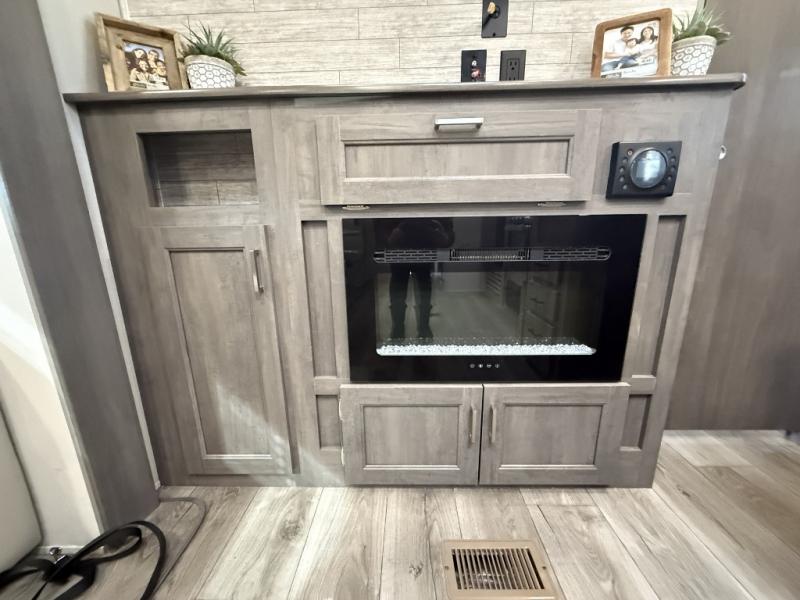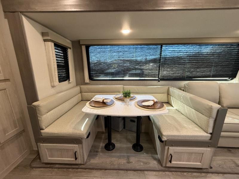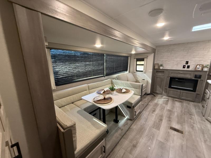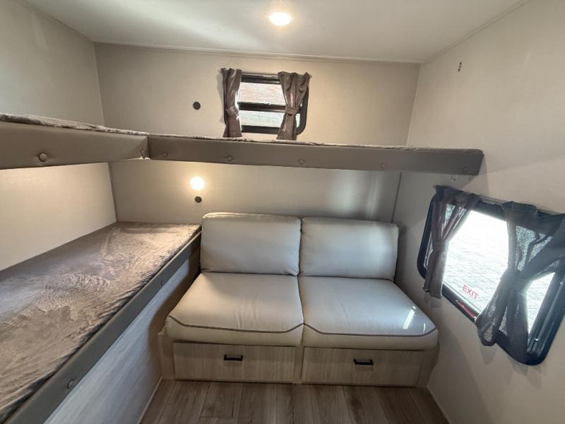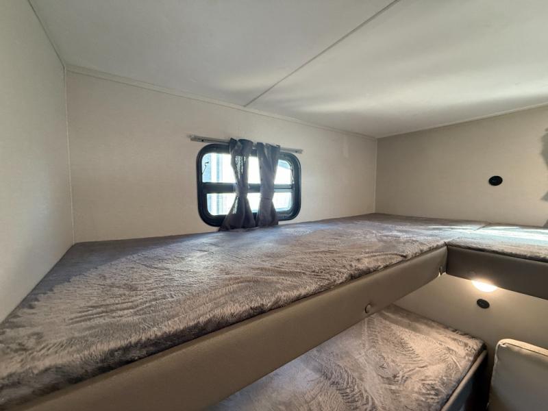 Not only will you be comfortable in this trailer, but your friends will also have comfort and privacy thanks to having their own bunkhouse, and you'll have a front bedroom where you can sleep like royalty! There are three bunk beds and a jack knife sofa with storage totes below plus a TV cabinet if you want to add a television here. The combined living and kitchen is spacious thanks to the slide out U-shaped dinette and sofa with drink holders. You can even add the fireplace option if you want that feature. The cook will have full amenities to whip up meals including overhead cabinets for dishes and snacks. And the exterior camper kitchen allows the cook to visit with everyone outside under the 18' electric awning that includes multicolor LED lights with a remote.