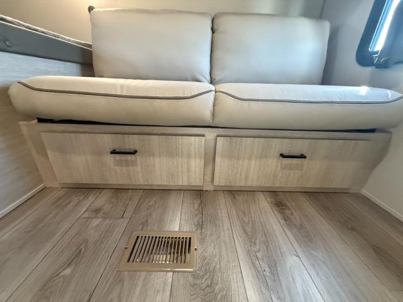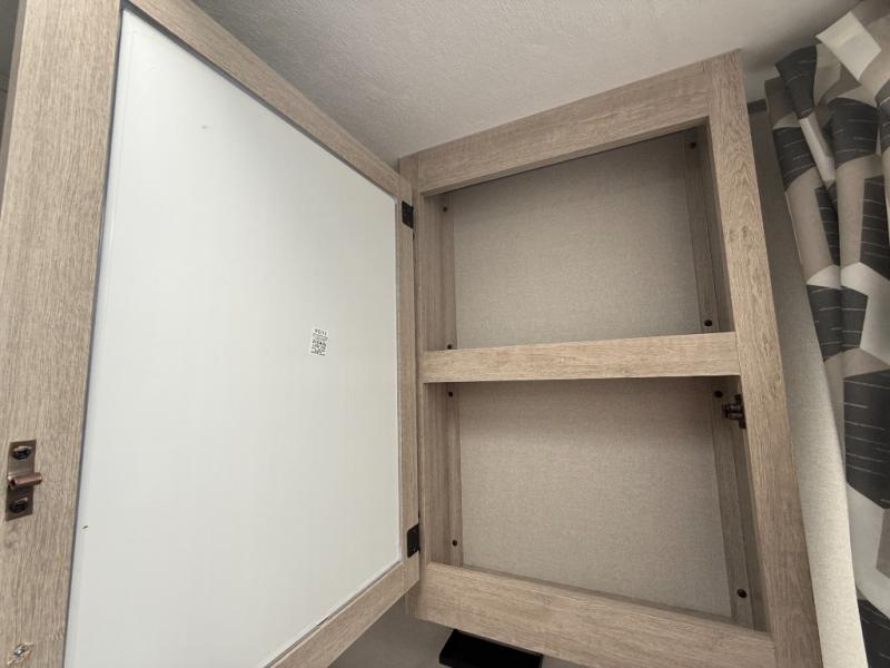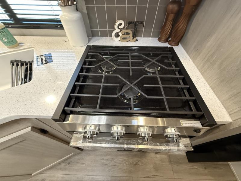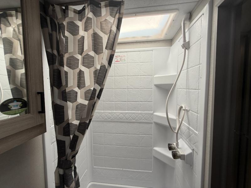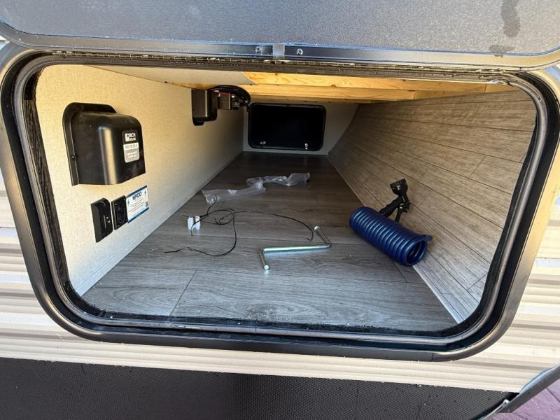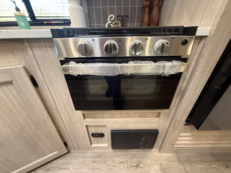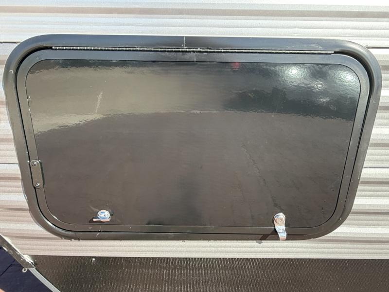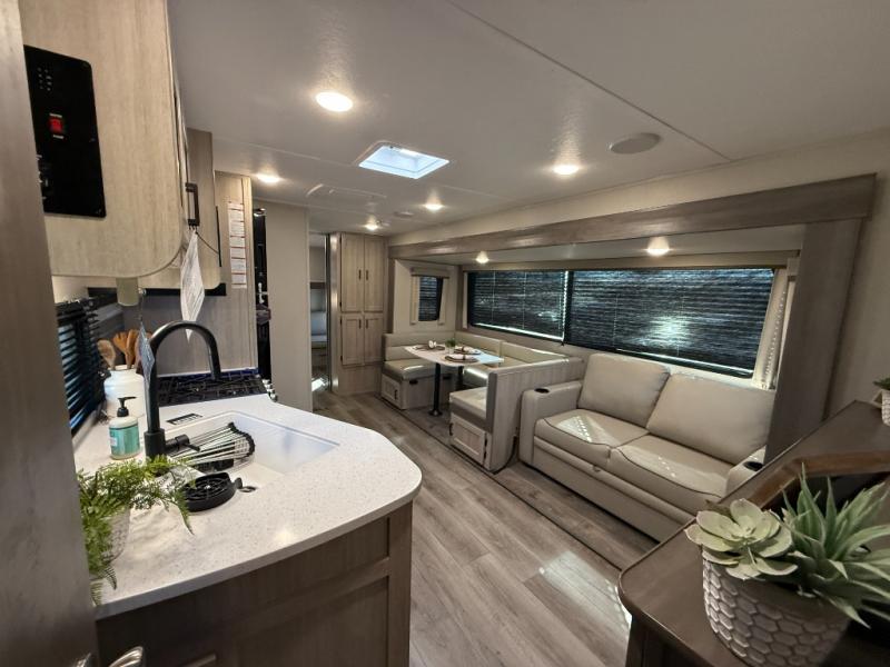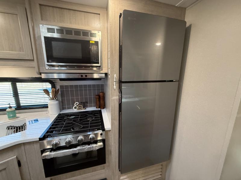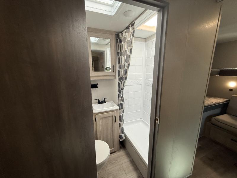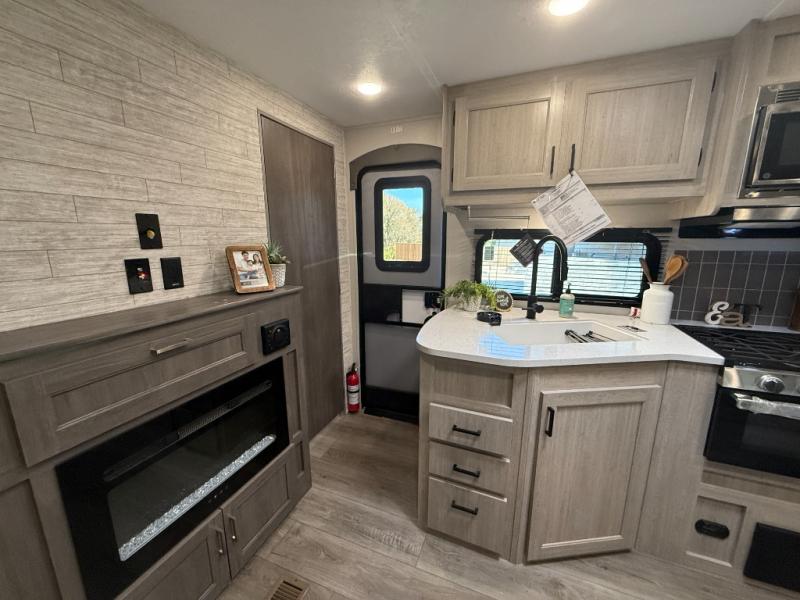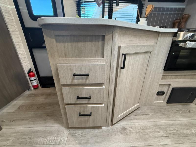 Not only will you be comfortable in this trailer, but your friends will also have comfort and privacy thanks to having their own bunkhouse, and you'll have a front bedroom where you can sleep like royalty! There are three bunk beds and a jack knife sofa with storage totes below plus a TV cabinet if you want to add a television here. The combined living and kitchen is spacious thanks to the slide out U-shaped dinette and sofa with drink holders. You can even add the fireplace option if you want that feature. The cook will have full amenities to whip up meals including overhead cabinets for dishes and snacks. And the exterior camper kitchen allows the cook to visit with everyone outside under the 18' electric awning that includes multicolor LED lights with a remote.