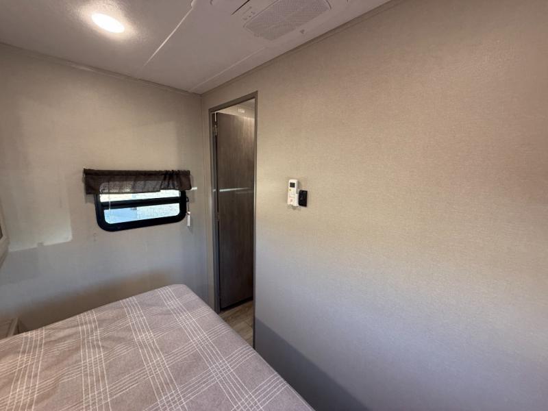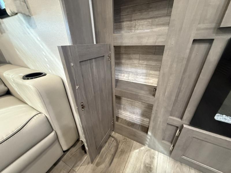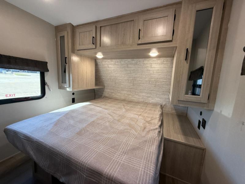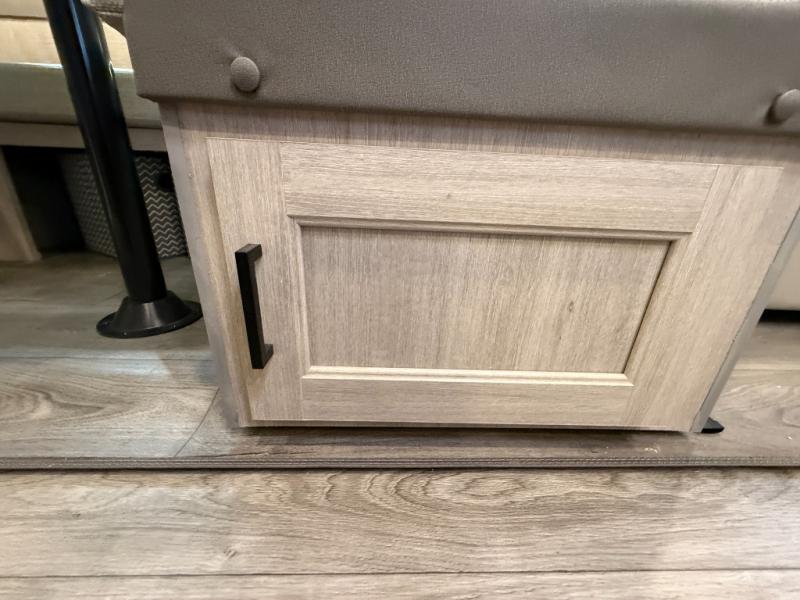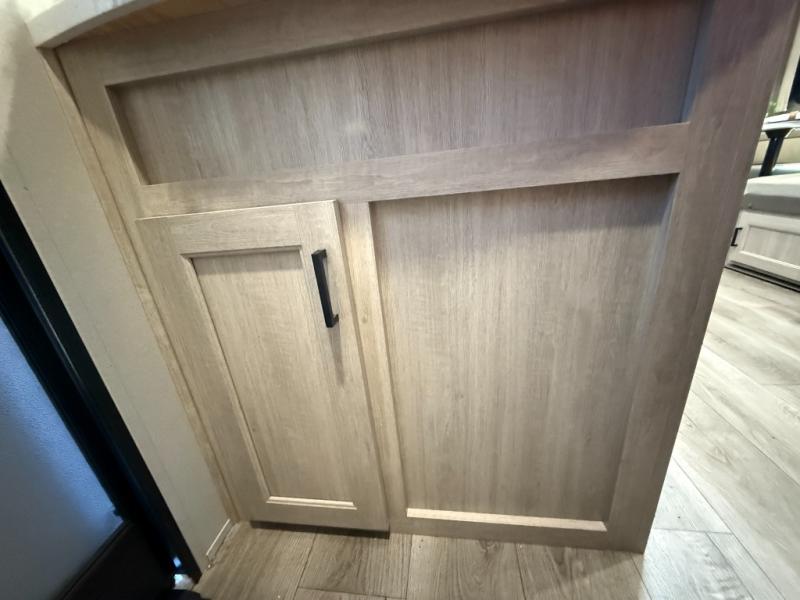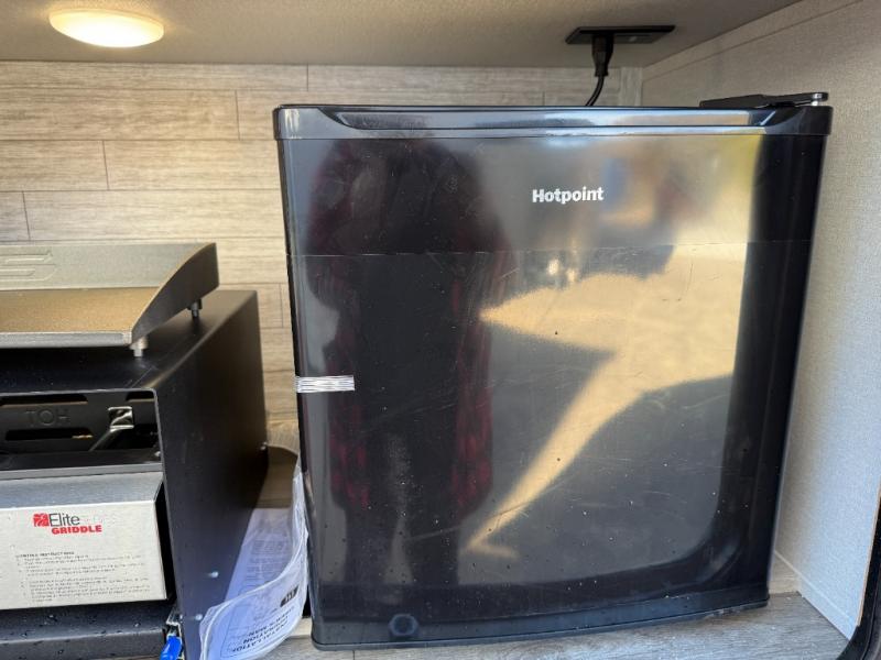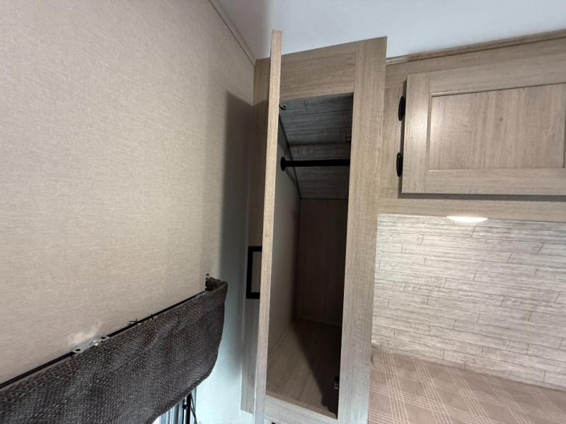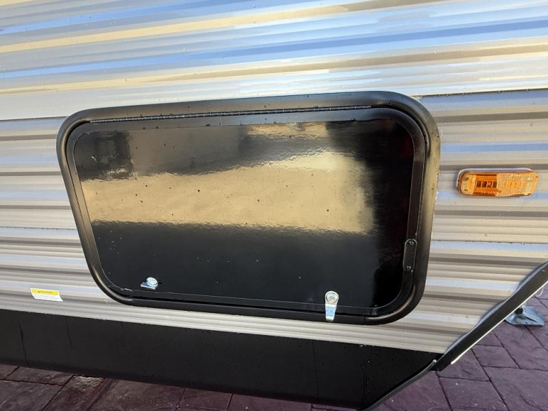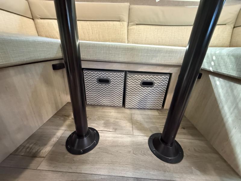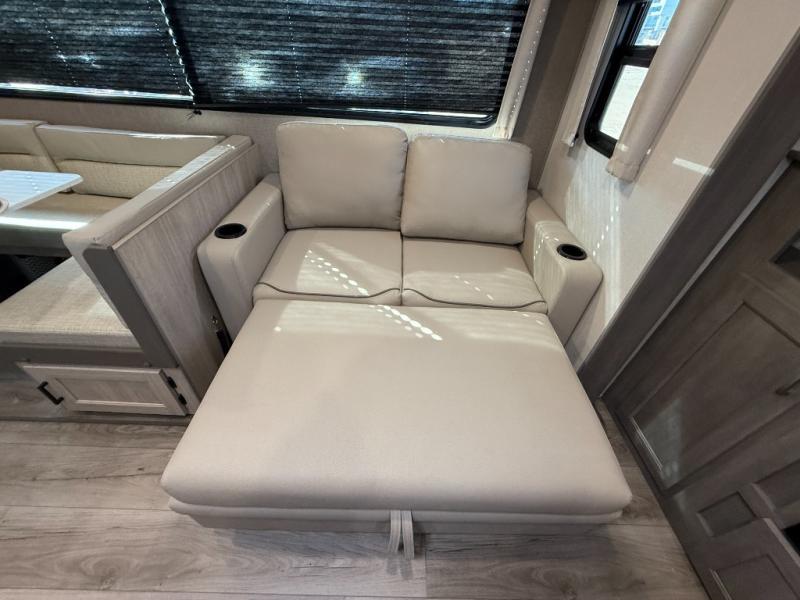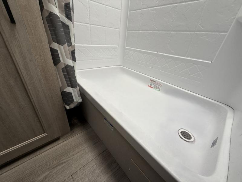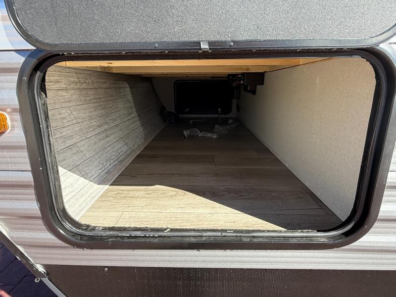 Not only will you be comfortable in this trailer, but your friends will also have comfort and privacy thanks to having their own bunkhouse, and you'll have a front bedroom where you can sleep like royalty! There are three bunk beds and a jack knife sofa with storage totes below plus a TV cabinet if you want to add a television here. The combined living and kitchen is spacious thanks to the slide out U-shaped dinette and sofa with drink holders. You can even add the fireplace option if you want that feature. The cook will have full amenities to whip up meals including overhead cabinets for dishes and snacks. And the exterior camper kitchen allows the cook to visit with everyone outside under the 18' electric awning that includes multicolor LED lights with a remote.