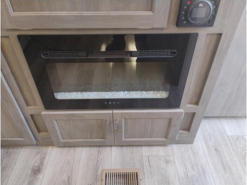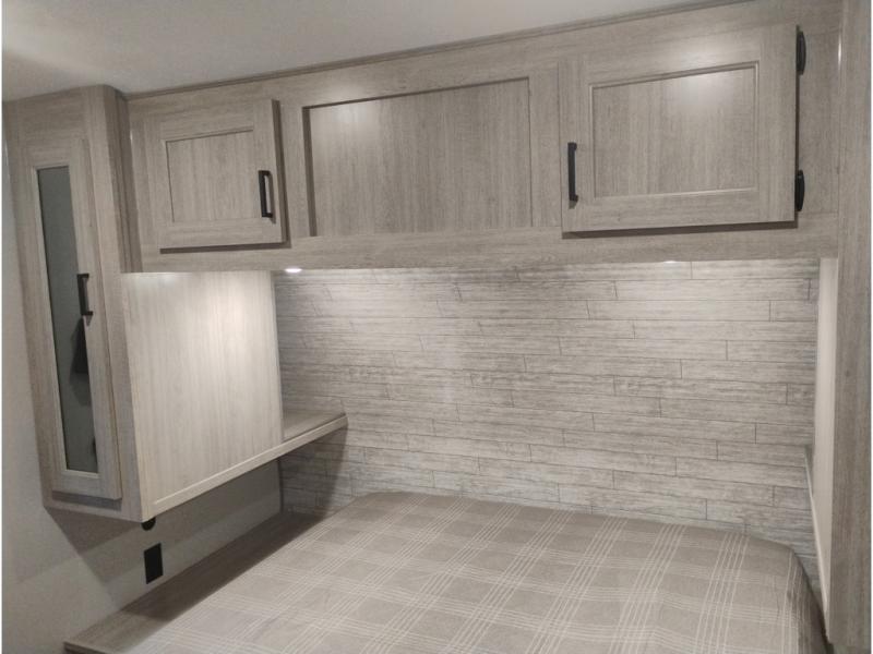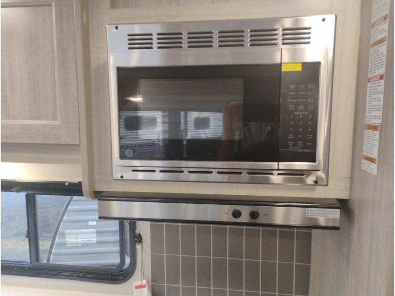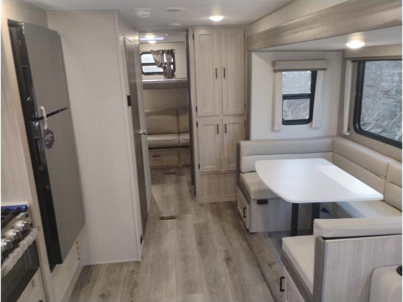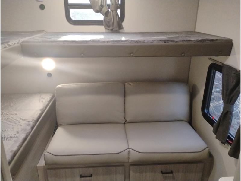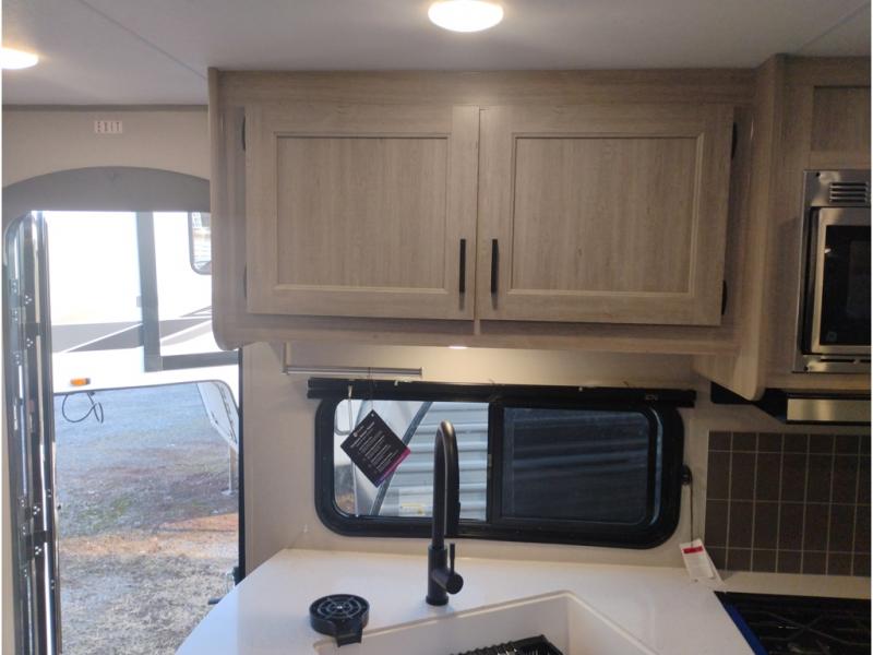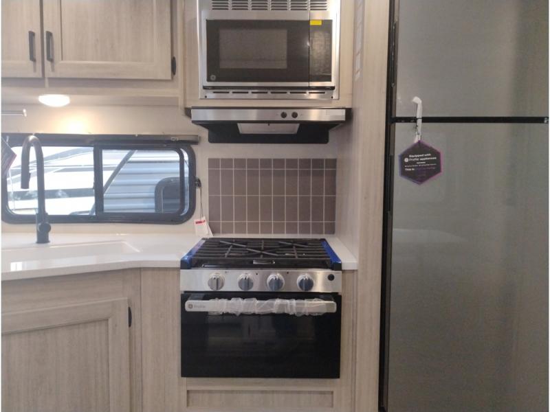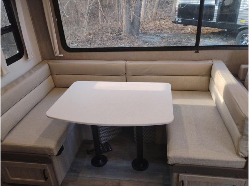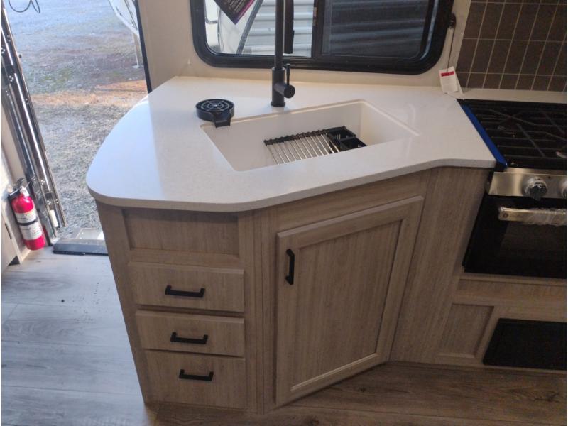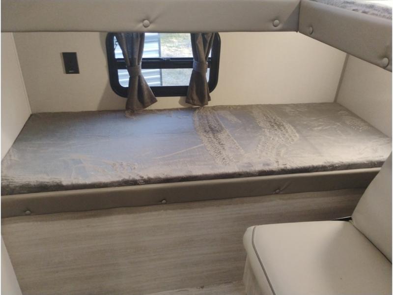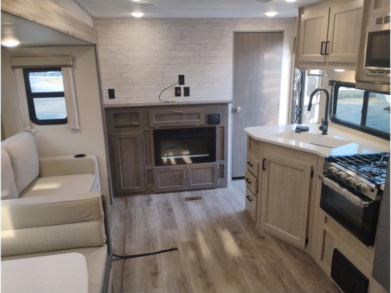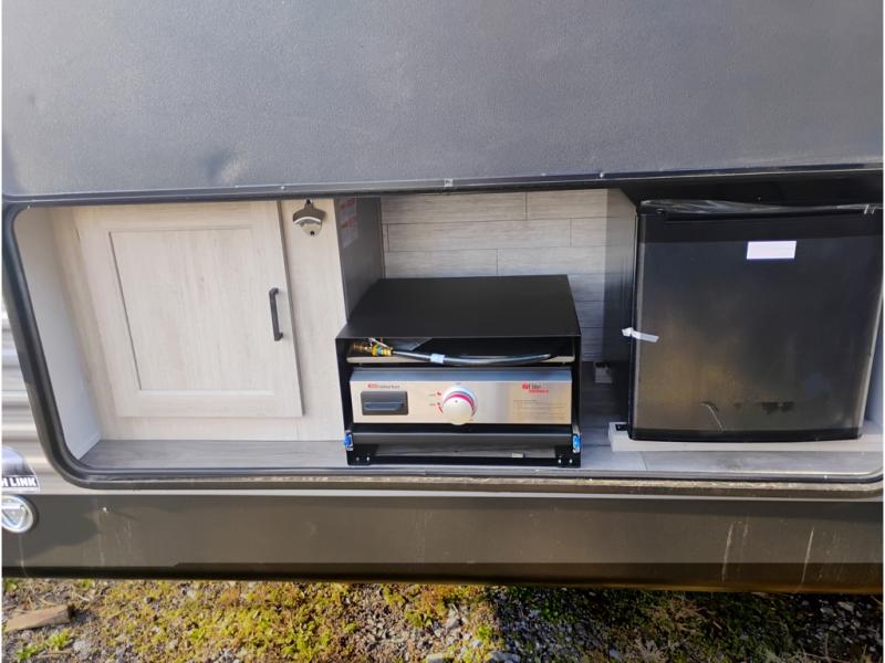 Not only will you be comfortable in this trailer, but your friends will also have comfort and privacy thanks to having their own bunkhouse, and you'll have a front bedroom where you can sleep like royalty! There are three bunk beds and a jack knife sofa with storage totes below plus a TV cabinet if you want to add a television here. The combined living and kitchen is spacious thanks to the slide out U-shaped dinette and sofa with drink holders. You can even add the fireplace option if you want that feature. The cook will have full amenities to whip up meals including overhead cabinets for dishes and snacks. And the exterior camper kitchen allows the cook to visit with everyone outside under the 18' electric awning that includes multicolor LED lights with a remote.