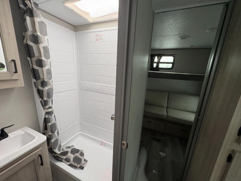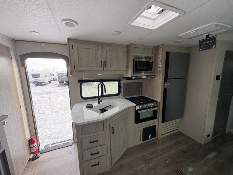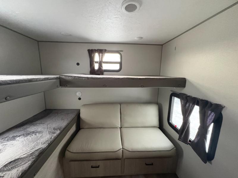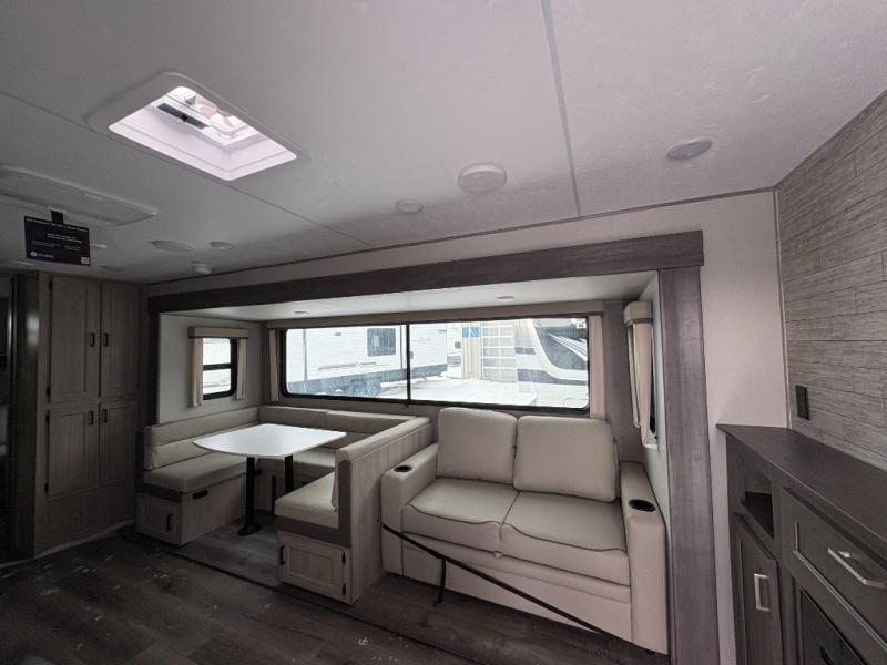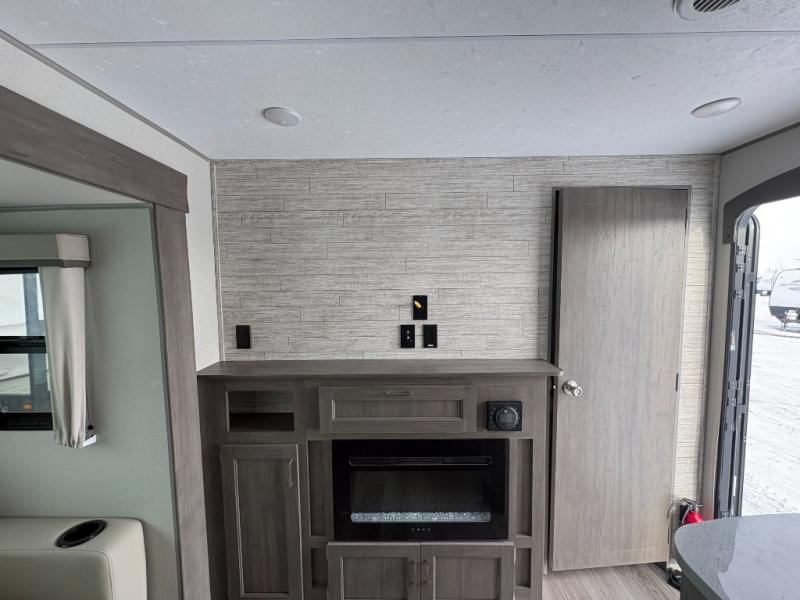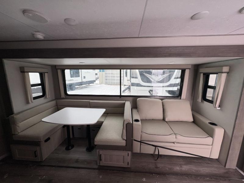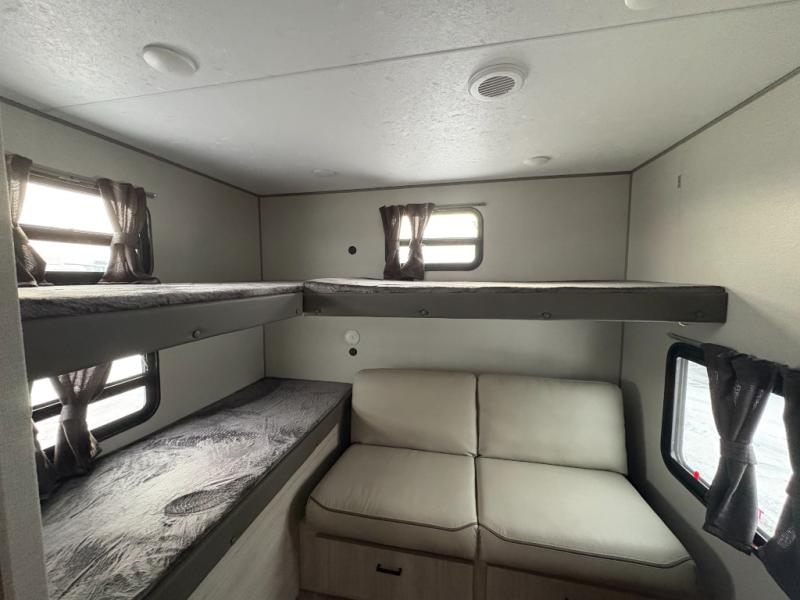 Not only will you be comfortable in this trailer, but your friends will also have comfort and privacy thanks to having their own bunkhouse, and you'll have a front bedroom where you can sleep like royalty! There are three bunk beds and a jack knife sofa with storage totes below plus a TV cabinet if you want to add a television here. The combined living and kitchen is spacious thanks to the slide out U-shaped dinette and sofa with drink holders. You can even add the fireplace option if you want that feature. The cook will have full amenities to whip up meals including overhead cabinets for dishes and snacks. And the exterior camper kitchen allows the cook to visit with everyone outside under the 18' electric awning that includes multicolor LED lights with a remote.