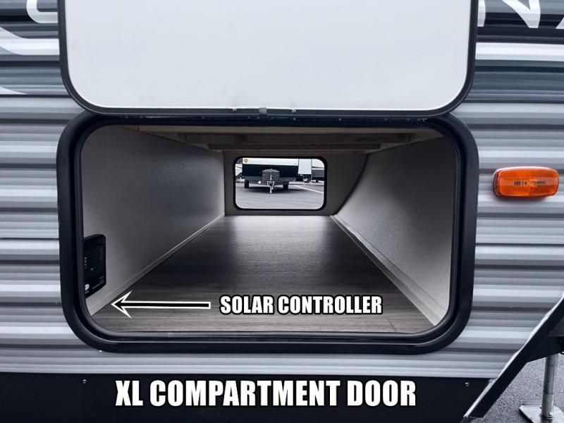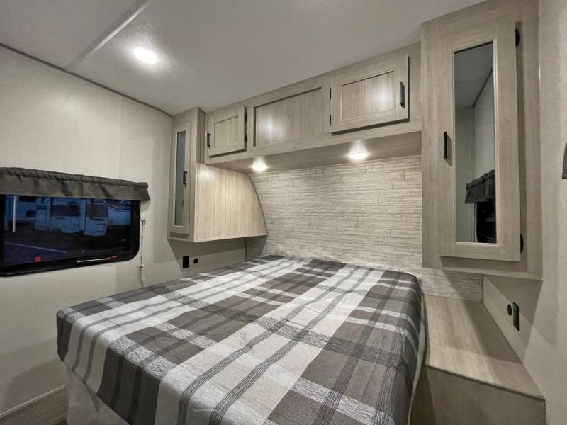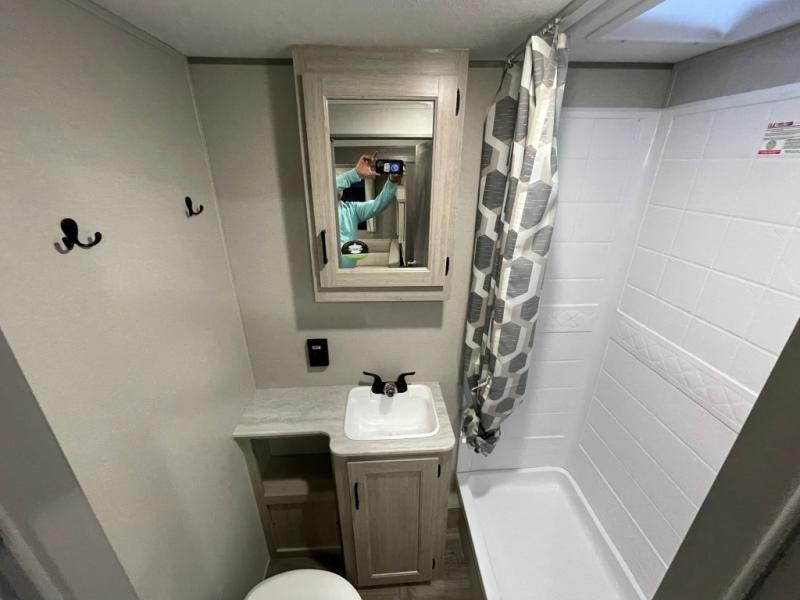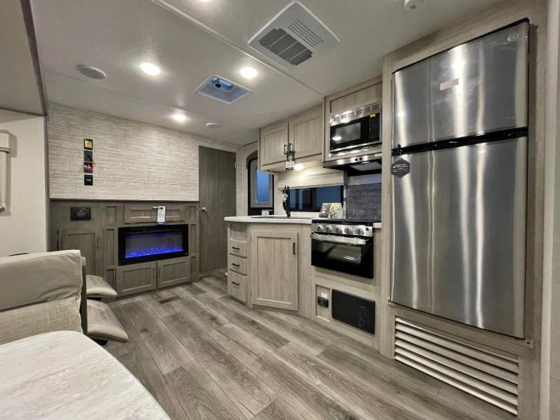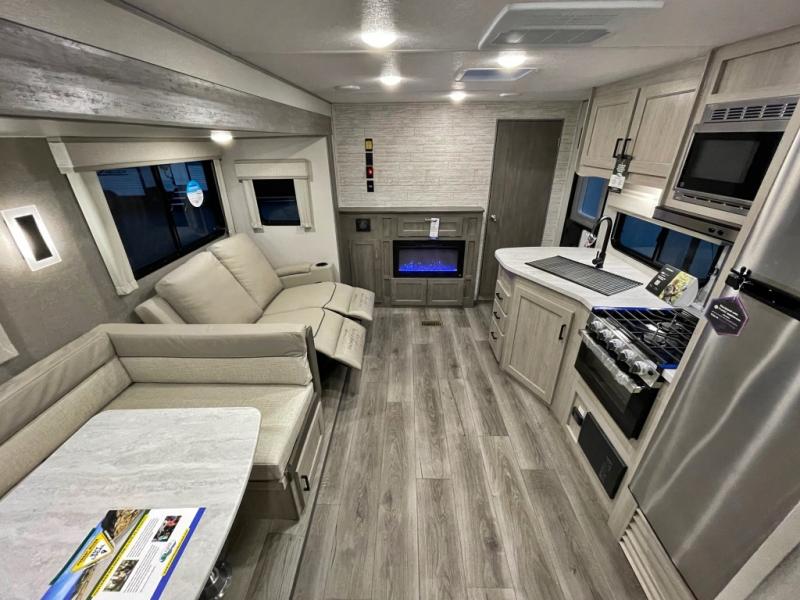 Not only will you be comfortable in this trailer, your friends will have comfort and privacy thanks to having their own bunkhouse with queen-size bunk beds, underbed storage, and a linen closet for clean clothes! The front master bedroom includes a walk-around queen bed, dual wardrobes, plus quick access to the dual entry bath! The combined living and kitchen is spacious thanks to the slide out U-shaped dinette and sofa with drink holders. You can even add the fireplace option if you want that feature. The cook will have full amenities to whip up meals including overhead cabinets for dishes and snacks, plus an outdoor camper kitchen with a pull-out griddle, a cabinet, and a refrigerator!