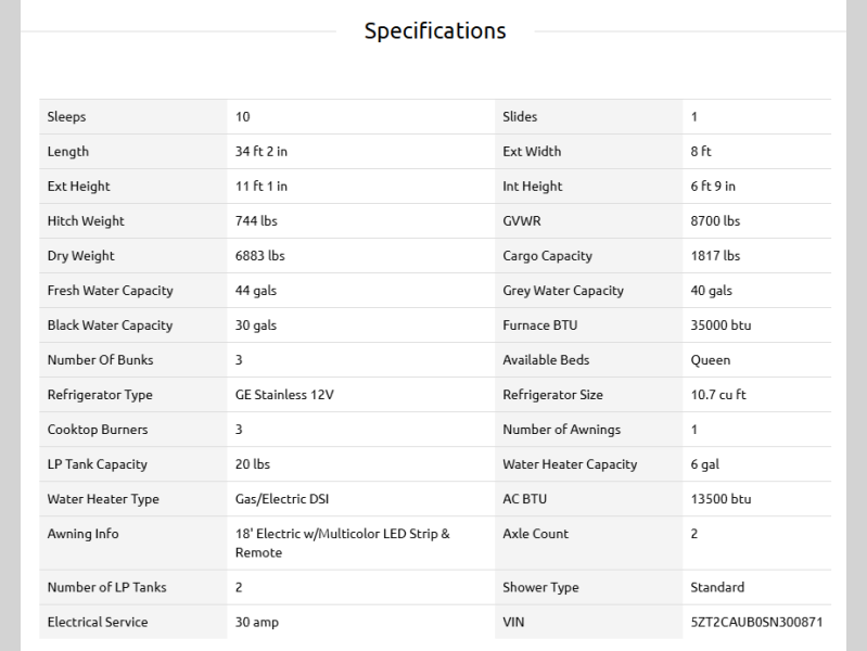 | Awning Info | 21' Electric w/Multicolor LED Strip & Remote |