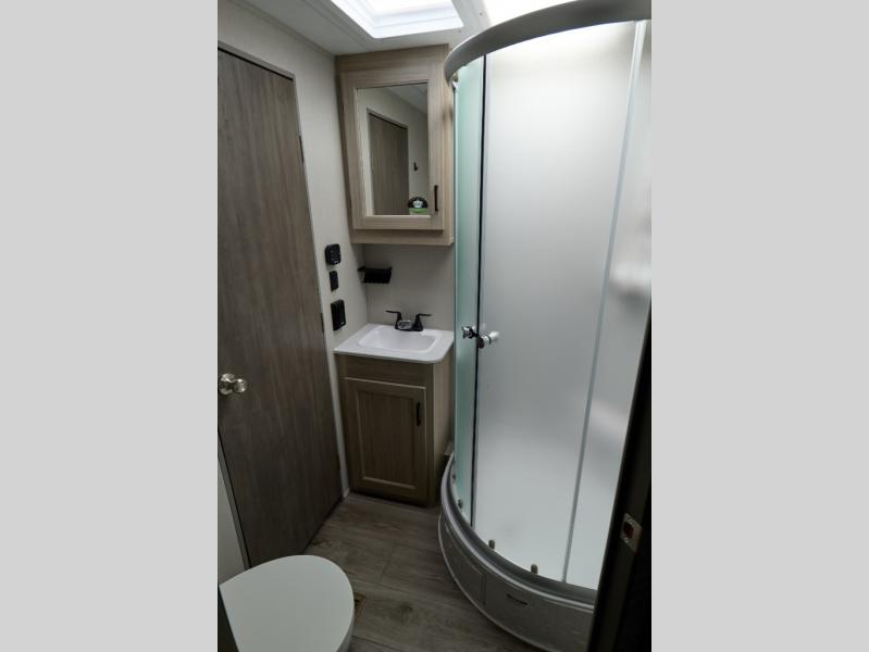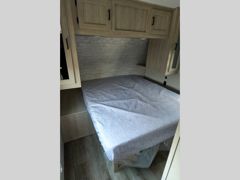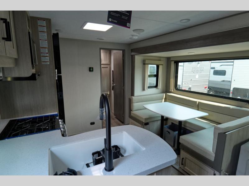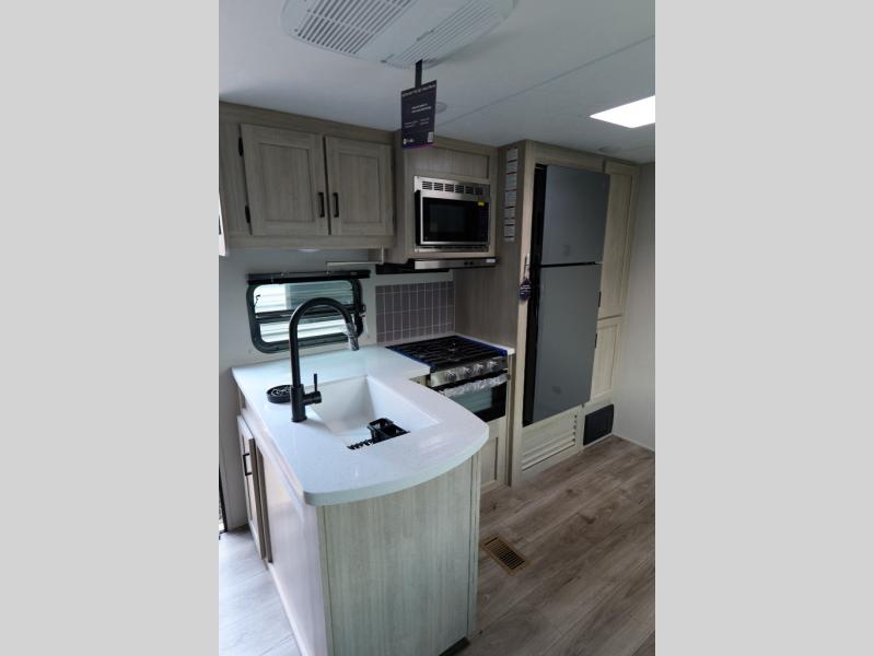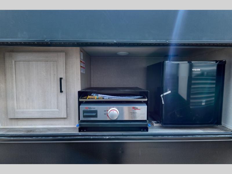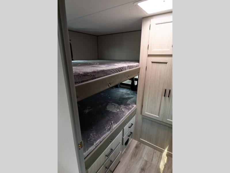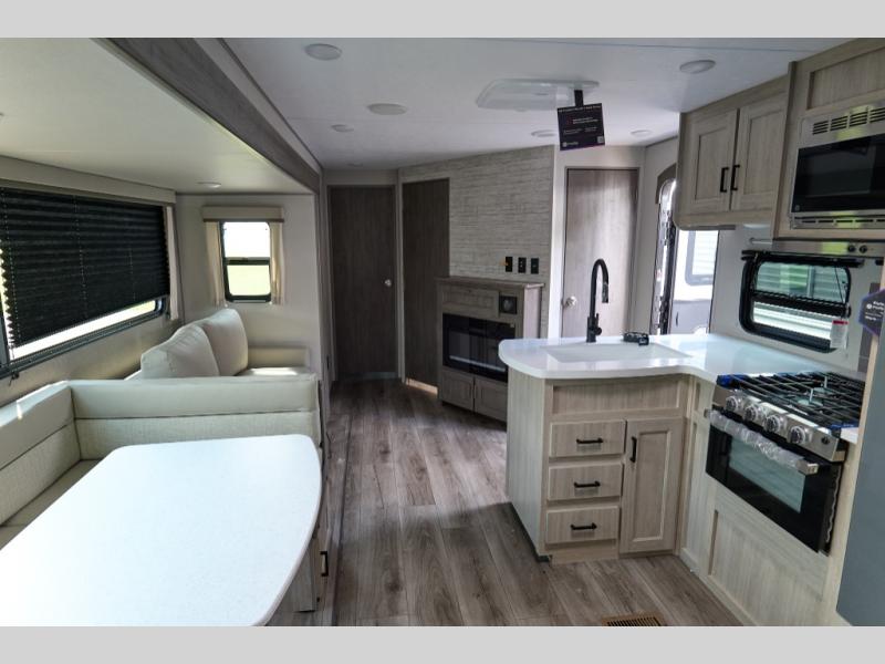 Not only will you be comfortable in this trailer, your friends will have comfort and privacy thanks to having their own bunkhouse with queen-size bunk beds, underbed storage, and a linen closet for clean clothes! The front master bedroom includes a walk-around queen bed, dual wardrobes, plus quick access to the dual entry bath! The combined living and kitchen is spacious thanks to the slide out U-shaped dinette and sofa with drink holders. You can even add the fireplace option if you want that feature. The cook will have full amenities to whip up meals including overhead cabinets for dishes and snacks, plus an outdoor camper kitchen with a pull-out griddle, a cabinet, and a refrigerator!