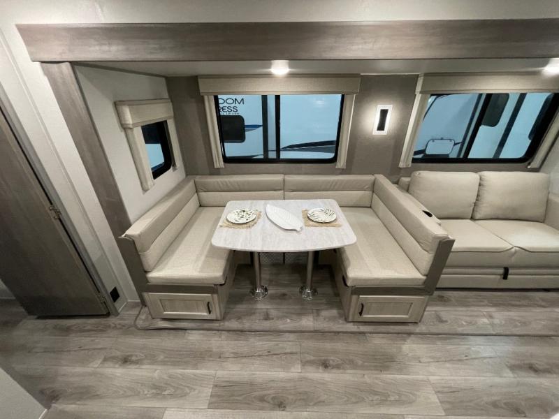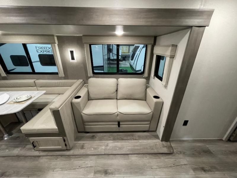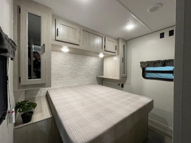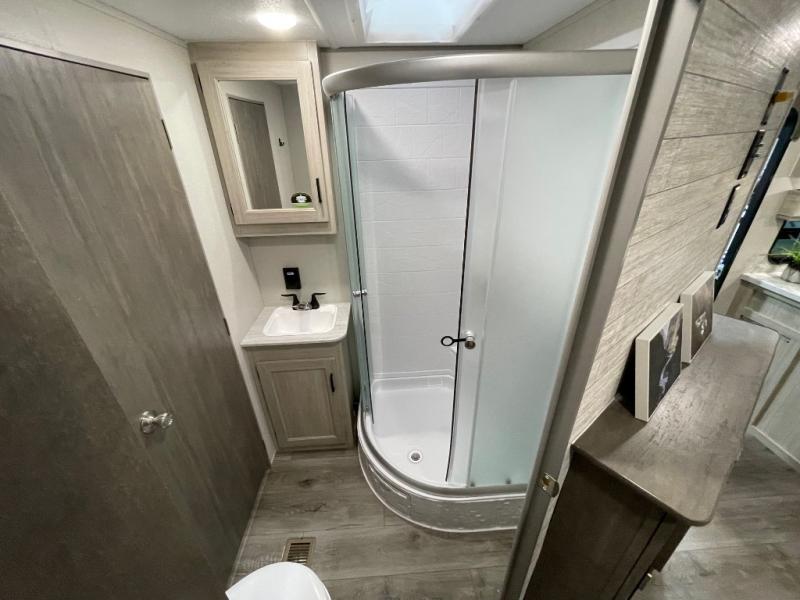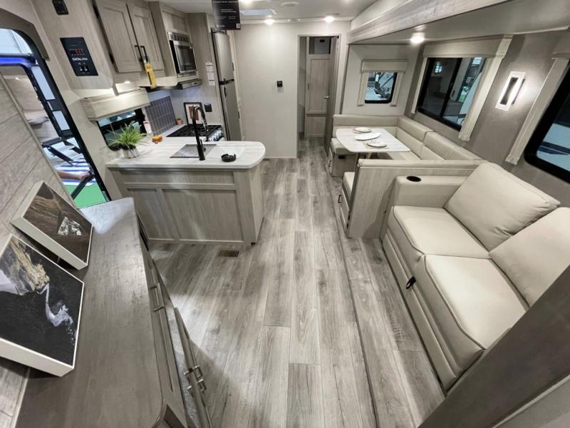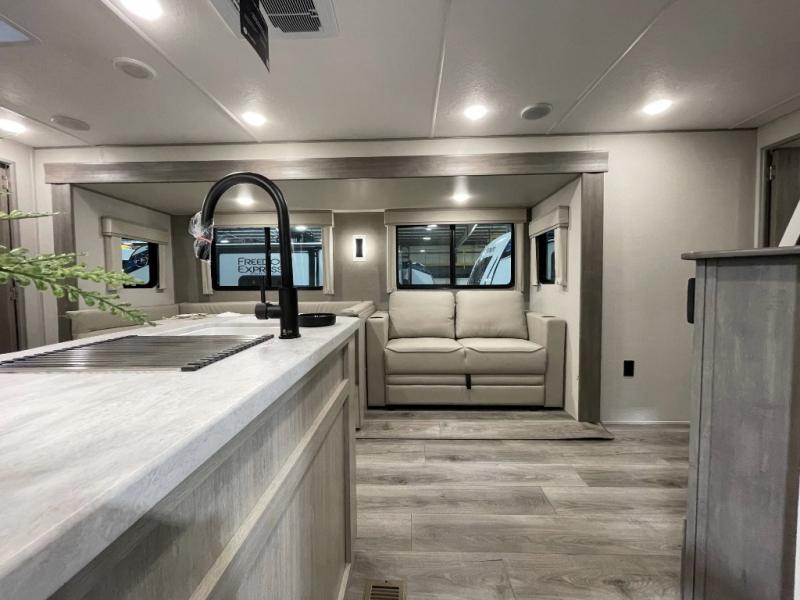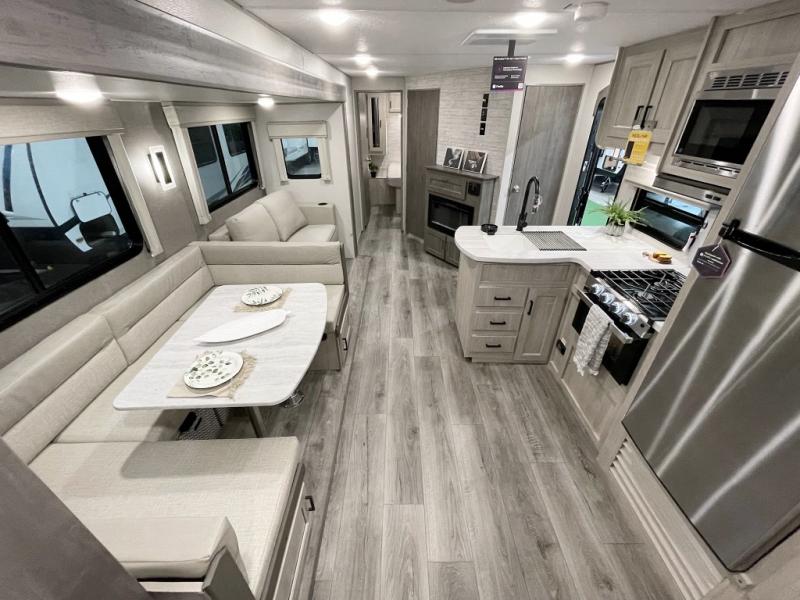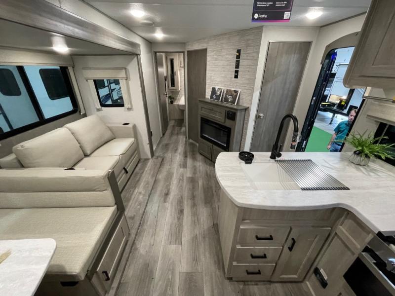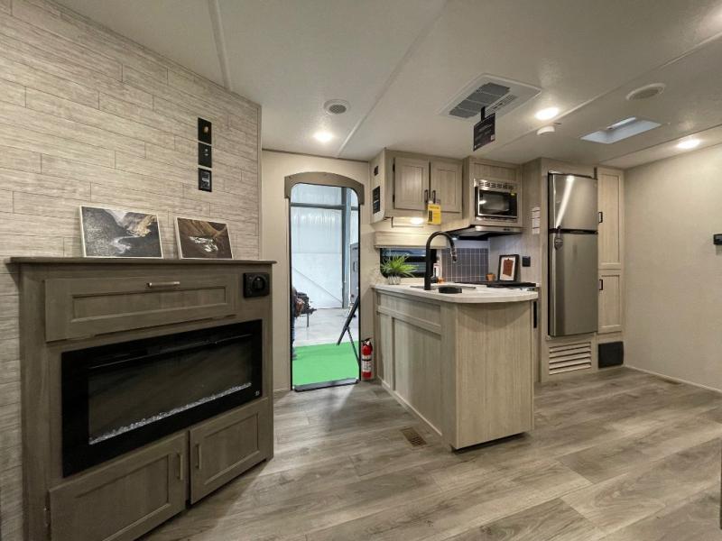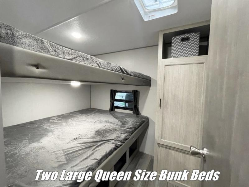 Not only will you be comfortable in this trailer, your friends will have comfort and privacy thanks to having their own bunkhouse with queen-size bunk beds, underbed storage, and a linen closet for clean clothes! The front master bedroom includes a walk-around queen bed, dual wardrobes, plus quick access to the dual entry bath! The combined living and kitchen is spacious thanks to the slide out U-shaped dinette and sofa with drink holders. You can even add the fireplace option if you want that feature. The cook will have full amenities to whip up meals including overhead cabinets for dishes and snacks, plus an outdoor camper kitchen with a pull-out griddle, a cabinet, and a refrigerator!