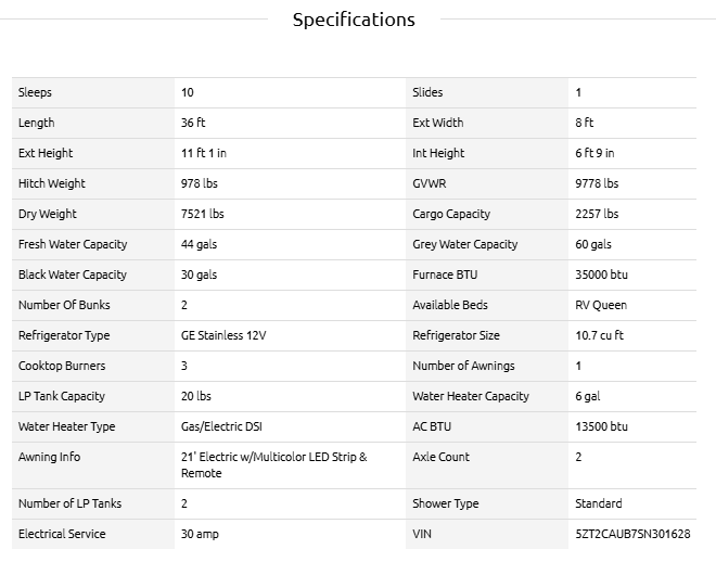 | Awning Info | 21' Electric w/Multicolor LED Strip & Remote |