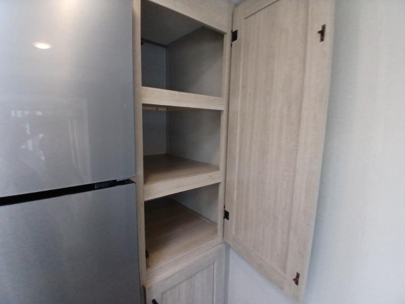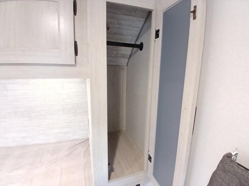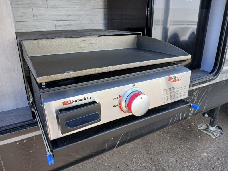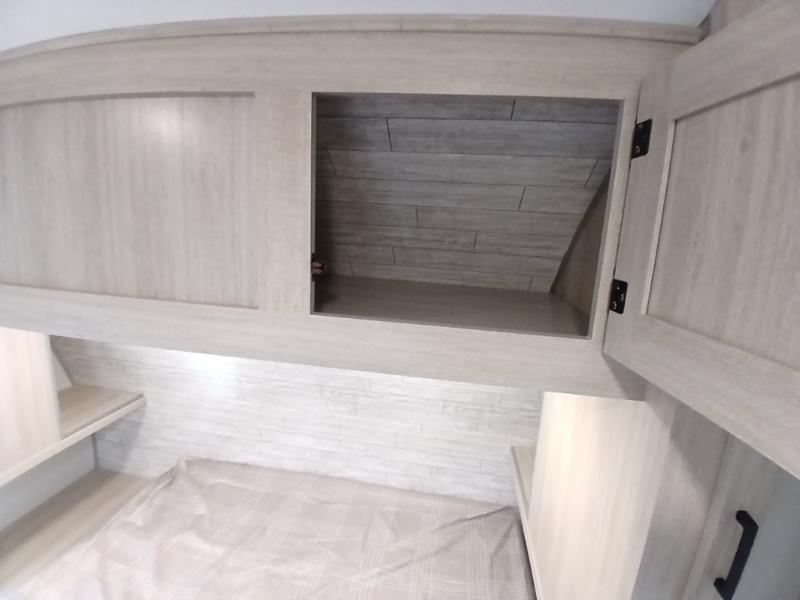 Not only will you be comfortable in this trailer, your friends will have comfort and privacy thanks to having their own bunkhouse with queen-size bunk beds, underbed storage, and a linen closet for clean clothes! The front master bedroom includes a walk-around queen bed, dual wardrobes, plus quick access to the dual entry bath! The combined living and kitchen is spacious thanks to the slide out U-shaped dinette and sofa with drink holders. You can even add the fireplace option if you want that feature. The cook will have full amenities to whip up meals including overhead cabinets for dishes and snacks, plus an outdoor camper kitchen with a pull-out griddle, a cabinet, and a refrigerator!