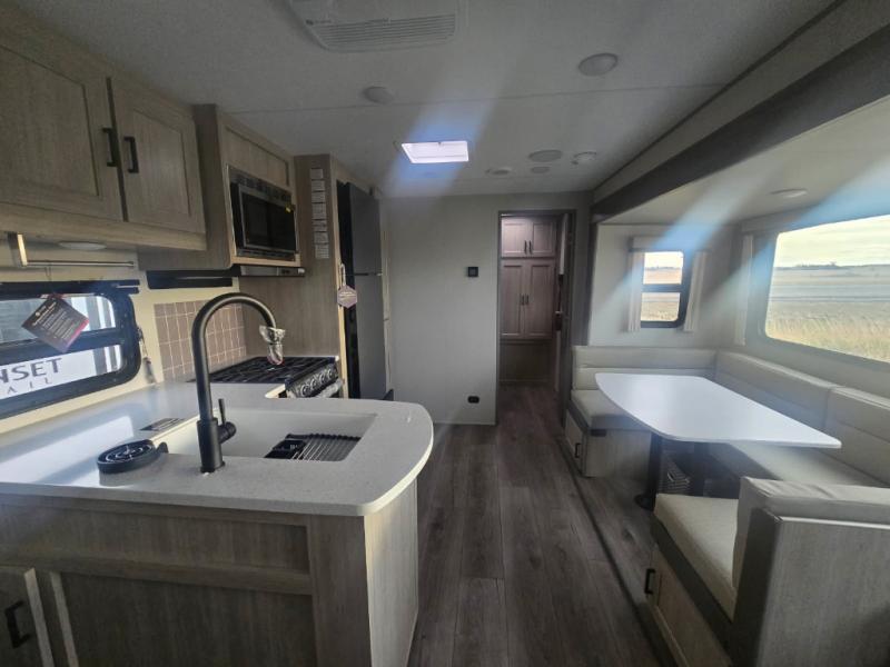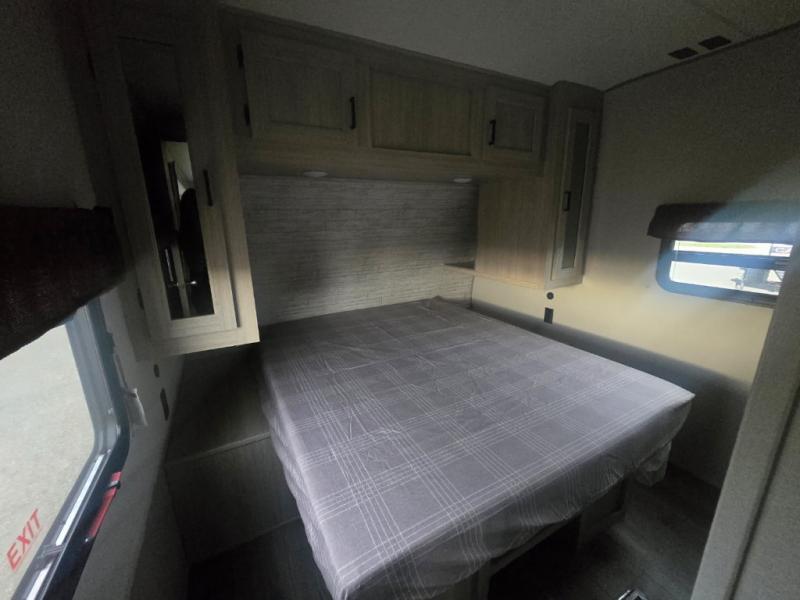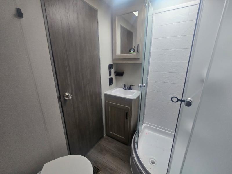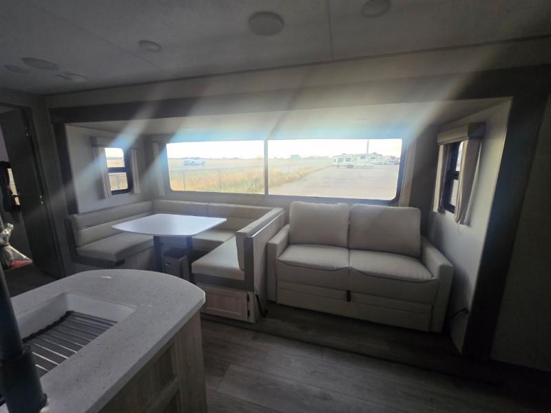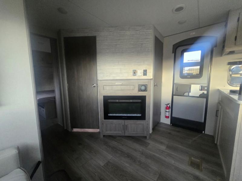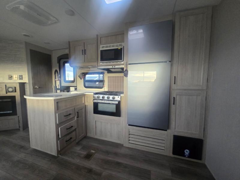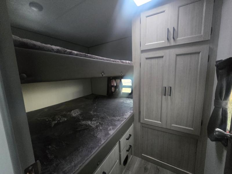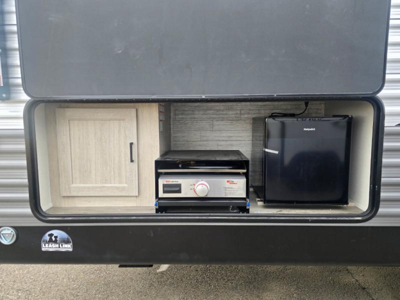 Not only will you be comfortable in this trailer, your friends will have comfort and privacy thanks to having their own bunkhouse with queen-size bunk beds, underbed storage, and a linen closet for clean clothes! The front master bedroom includes a walk-around queen bed, dual wardrobes, plus quick access to the dual entry bath! The combined living and kitchen is spacious thanks to the slide out U-shaped dinette and sofa with drink holders. You can even add the fireplace option if you want that feature. The cook will have full amenities to whip up meals including overhead cabinets for dishes and snacks, plus an outdoor camper kitchen with a pull-out griddle, a cabinet, and a refrigerator!