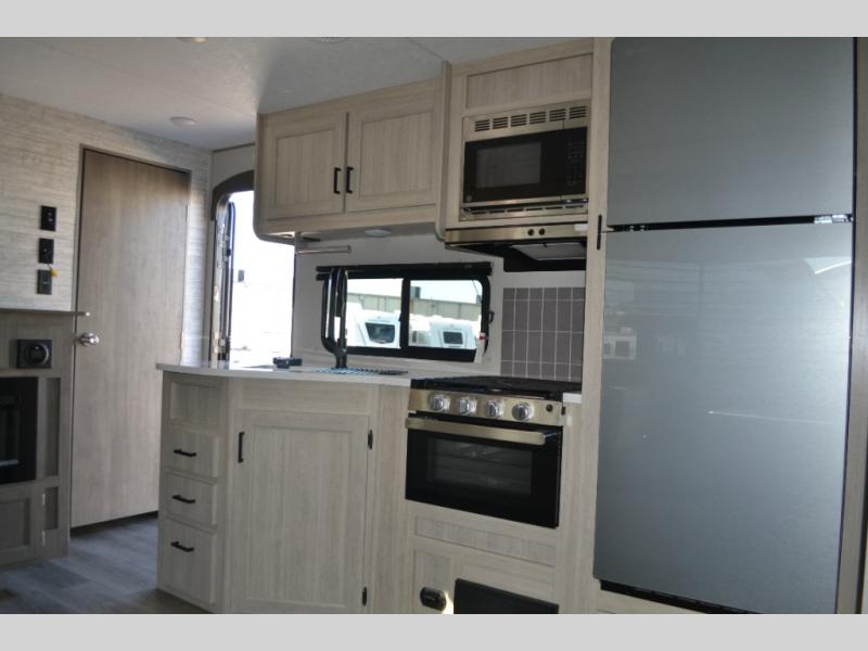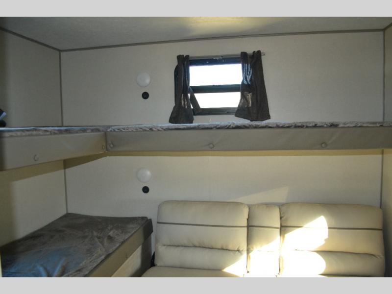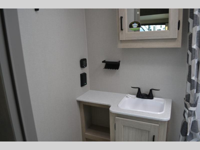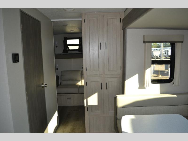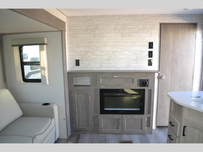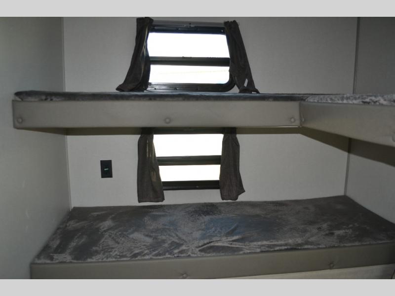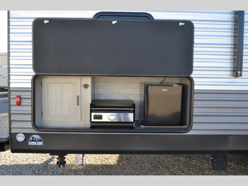 Not only will you be comfortable in this trailer, your friends will have comfort and privacy thanks to having their own bunkhouse with queen-size bunk beds, underbed storage, and a linen closet for clean clothes! The front master bedroom includes a walk-around queen bed, dual wardrobes, plus quick access to the dual entry bath! The combined living and kitchen is spacious thanks to the slide out U-shaped dinette and sofa with drink holders. You can even add the fireplace option if you want that feature. The cook will have full amenities to whip up meals including overhead cabinets for dishes and snacks, plus an outdoor camper kitchen with a pull-out griddle, a cabinet, and a refrigerator!