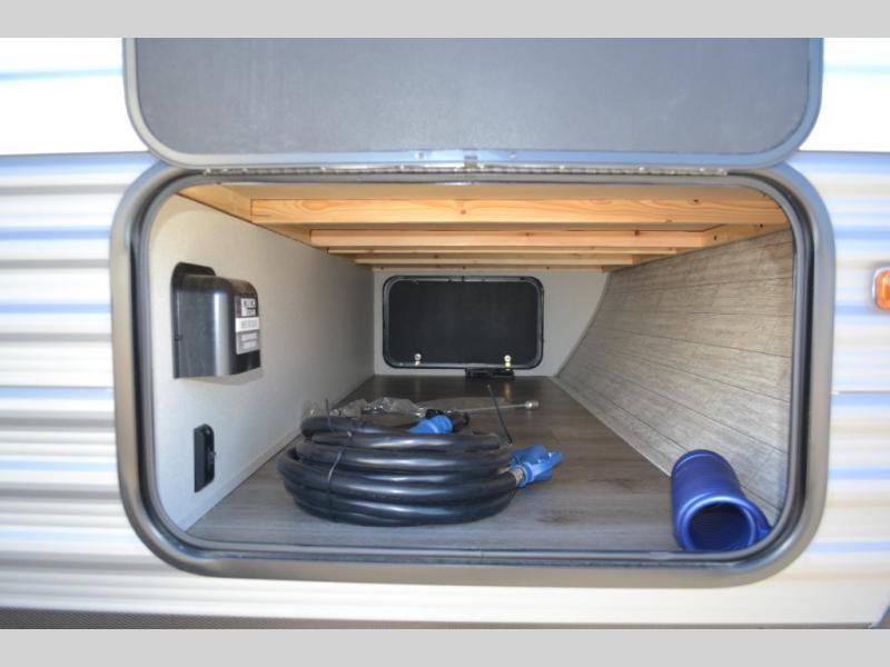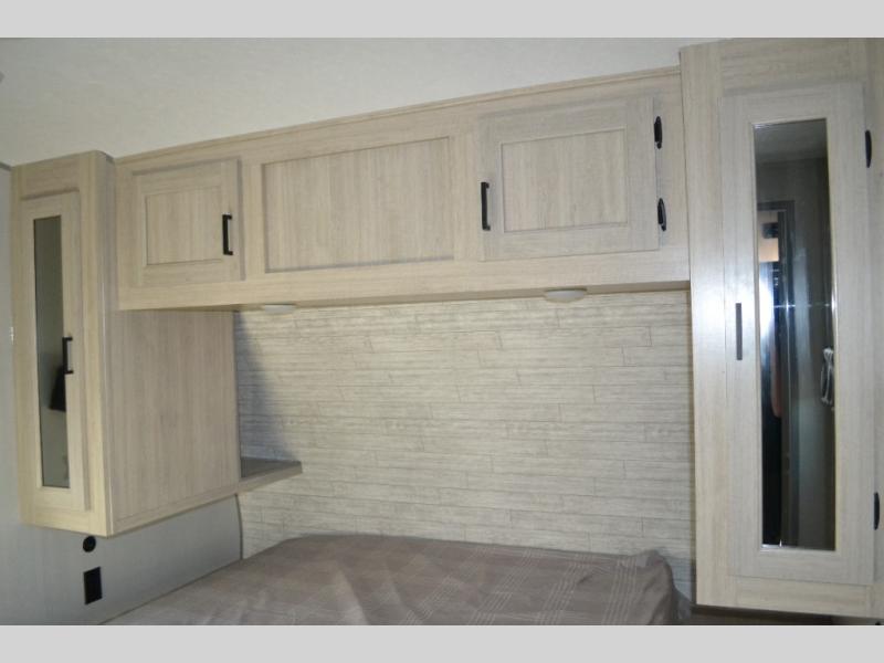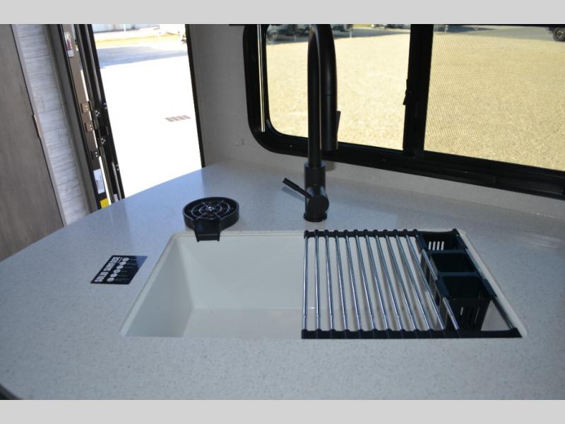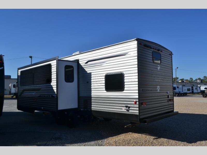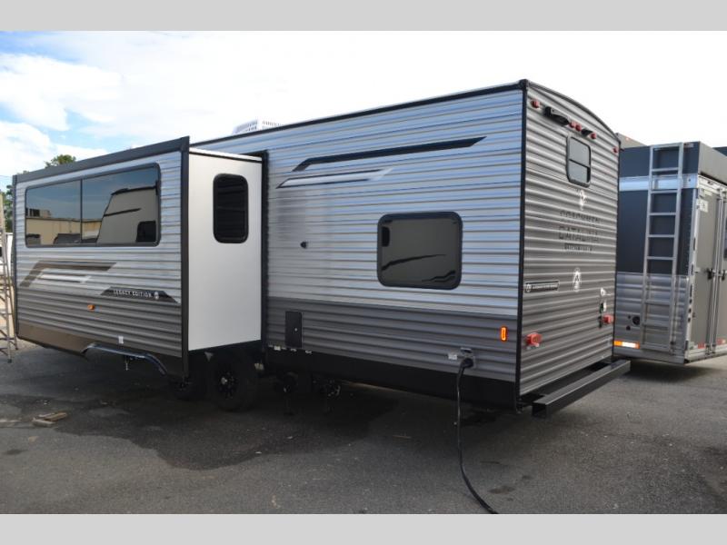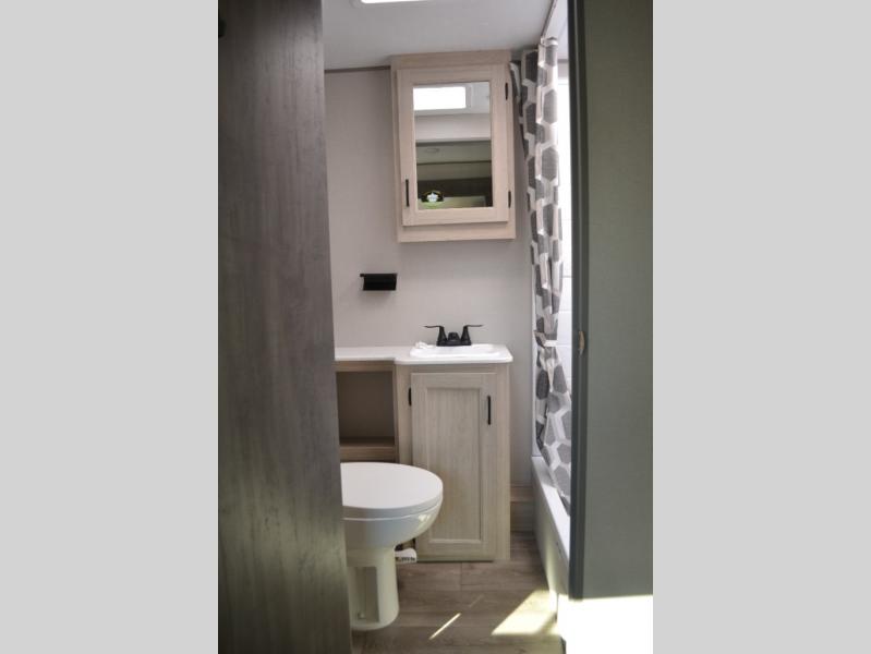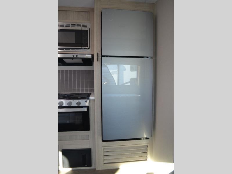 Not only will you be comfortable in this trailer, your friends will have comfort and privacy thanks to having their own bunkhouse with queen-size bunk beds, underbed storage, and a linen closet for clean clothes! The front master bedroom includes a walk-around queen bed, dual wardrobes, plus quick access to the dual entry bath! The combined living and kitchen is spacious thanks to the slide out U-shaped dinette and sofa with drink holders. You can even add the fireplace option if you want that feature. The cook will have full amenities to whip up meals including overhead cabinets for dishes and snacks, plus an outdoor camper kitchen with a pull-out griddle, a cabinet, and a refrigerator!
