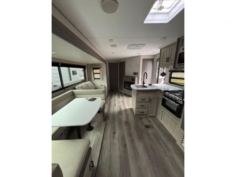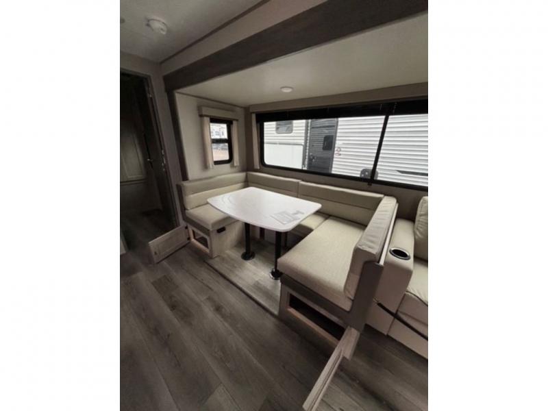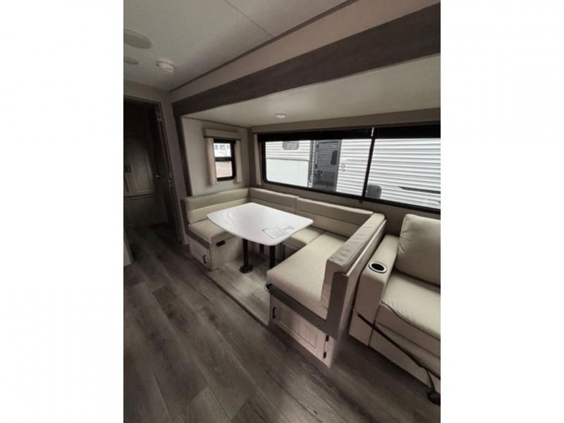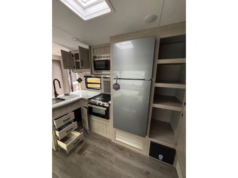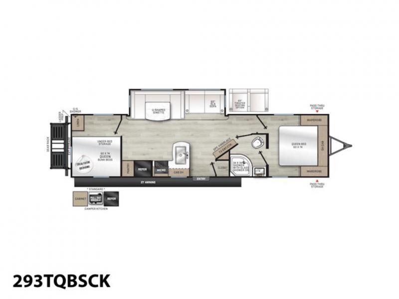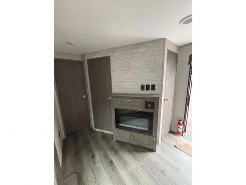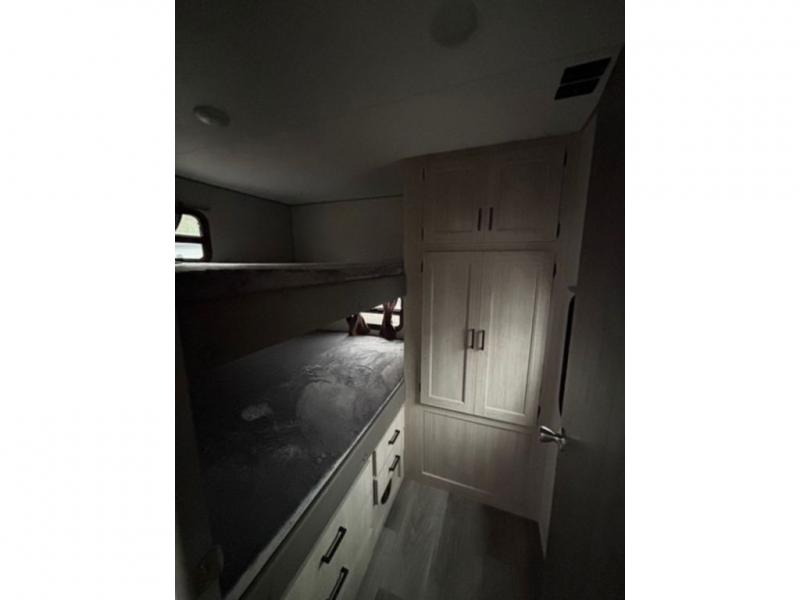 Not only will you be comfortable in this trailer, your friends will have comfort and privacy thanks to having their own bunkhouse with queen-size bunk beds, underbed storage, and a linen closet for clean clothes! The front master bedroom includes a walk-around queen bed, dual wardrobes, plus quick access to the dual entry bath! The combined living and kitchen is spacious thanks to the slide out U-shaped dinette and sofa with drink holders. You can even add the fireplace option if you want that feature. The cook will have full amenities to whip up meals including overhead cabinets for dishes and snacks, plus an outdoor camper kitchen with a pull-out griddle, a cabinet, and a refrigerator!