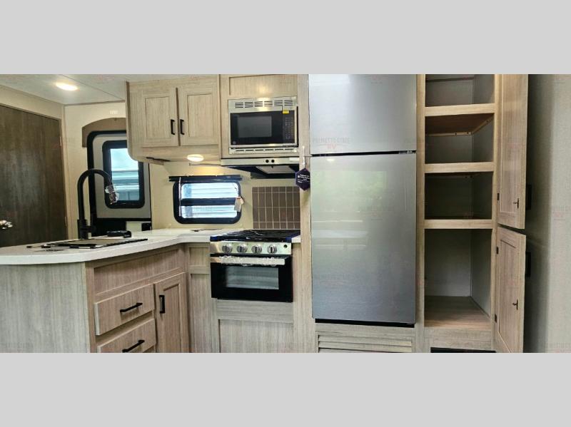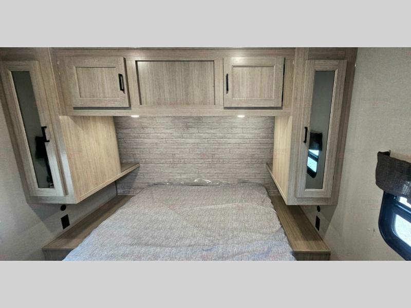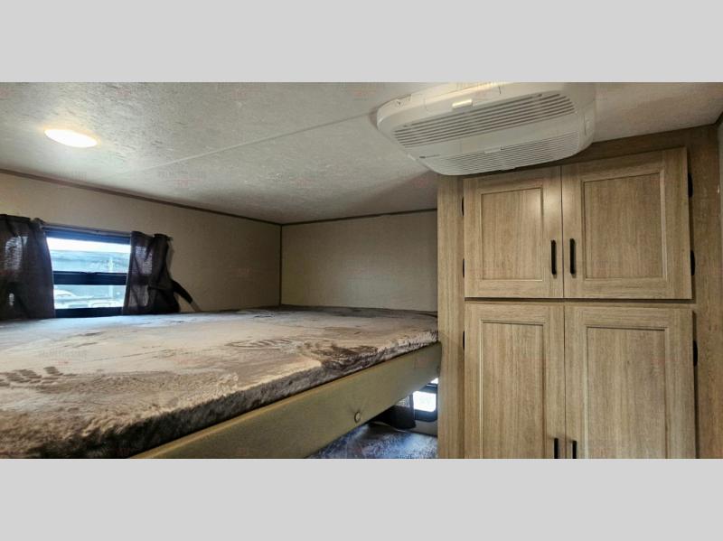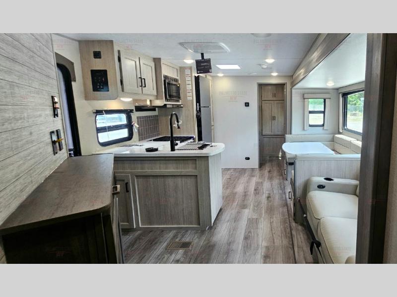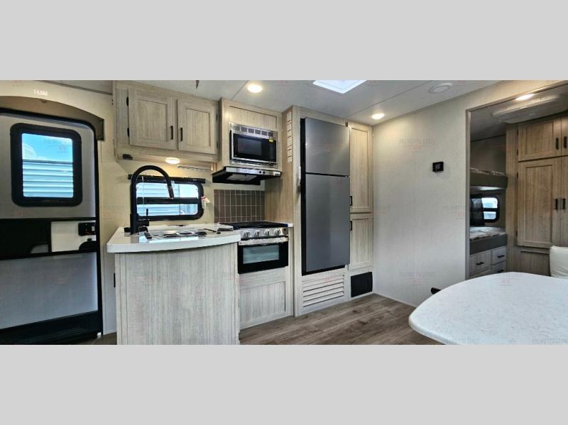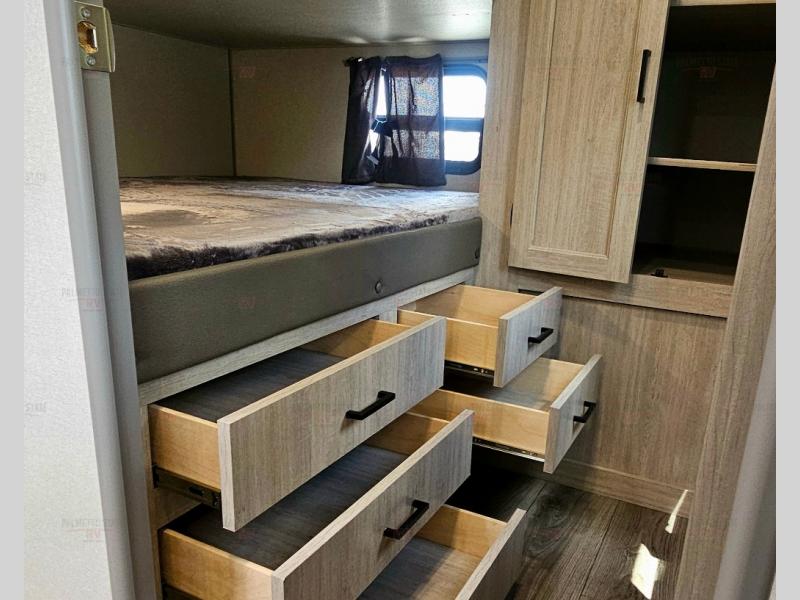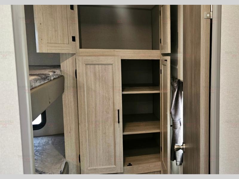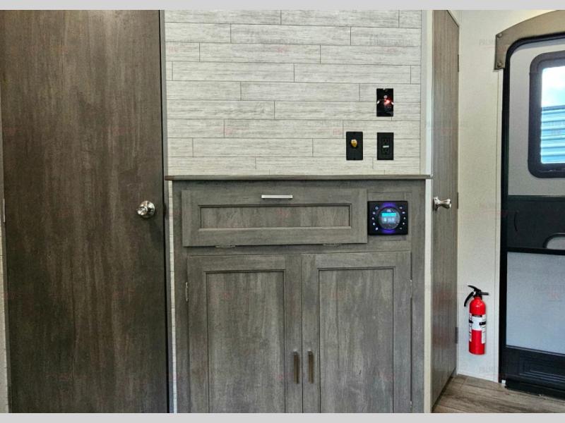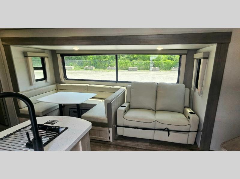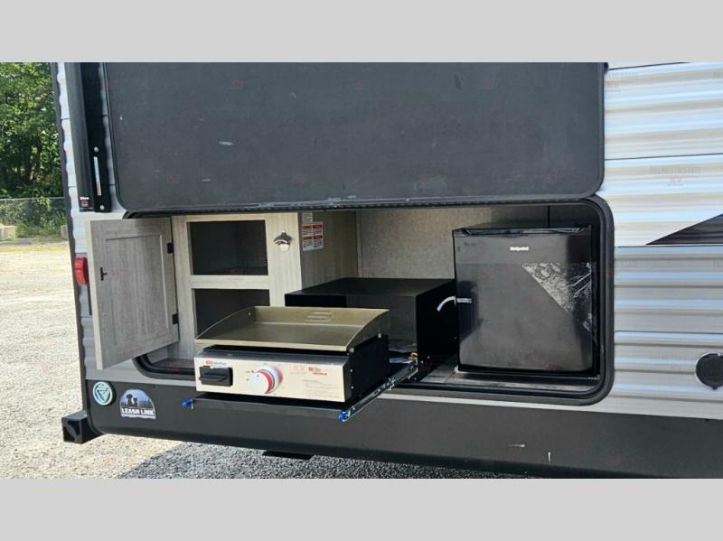 Not only will you be comfortable in this trailer, your friends will have comfort and privacy thanks to having their own bunkhouse with queen-size bunk beds, underbed storage, and a linen closet for clean clothes! The front master bedroom includes a walk-around queen bed, dual wardrobes, plus quick access to the dual entry bath! The combined living and kitchen is spacious thanks to the slide out U-shaped dinette and sofa with drink holders. You can even add the fireplace option if you want that feature. The cook will have full amenities to whip up meals including overhead cabinets for dishes and snacks, plus an outdoor camper kitchen with a pull-out griddle, a cabinet, and a refrigerator!