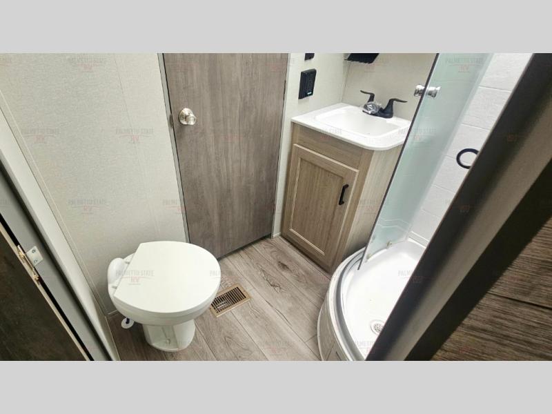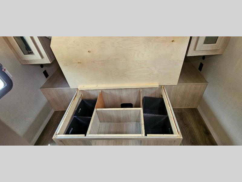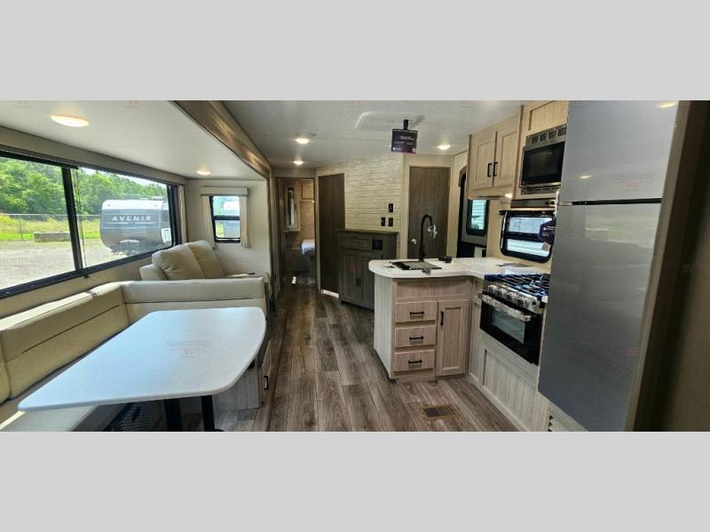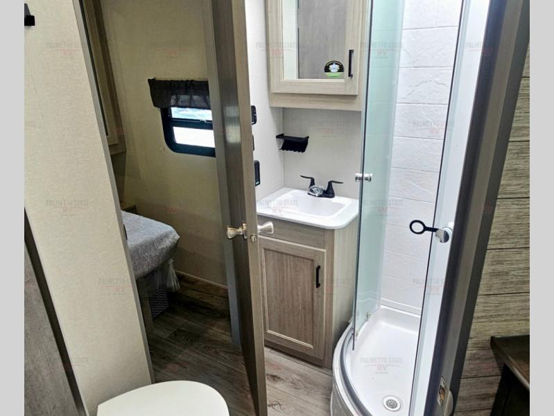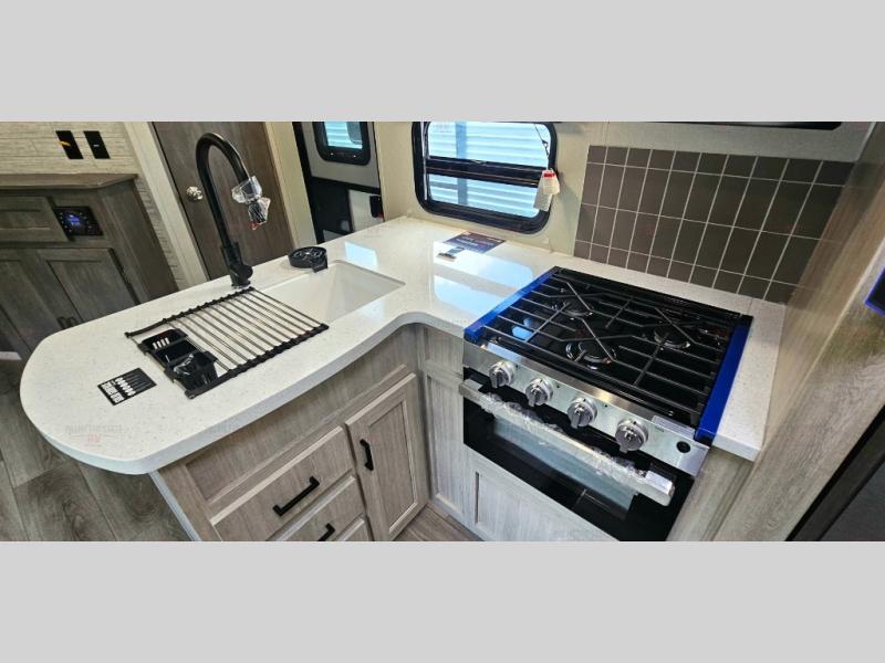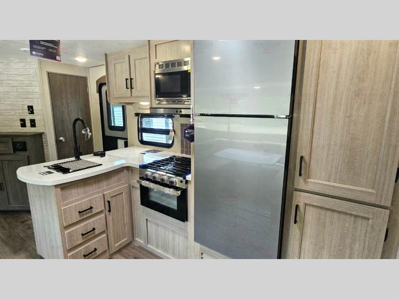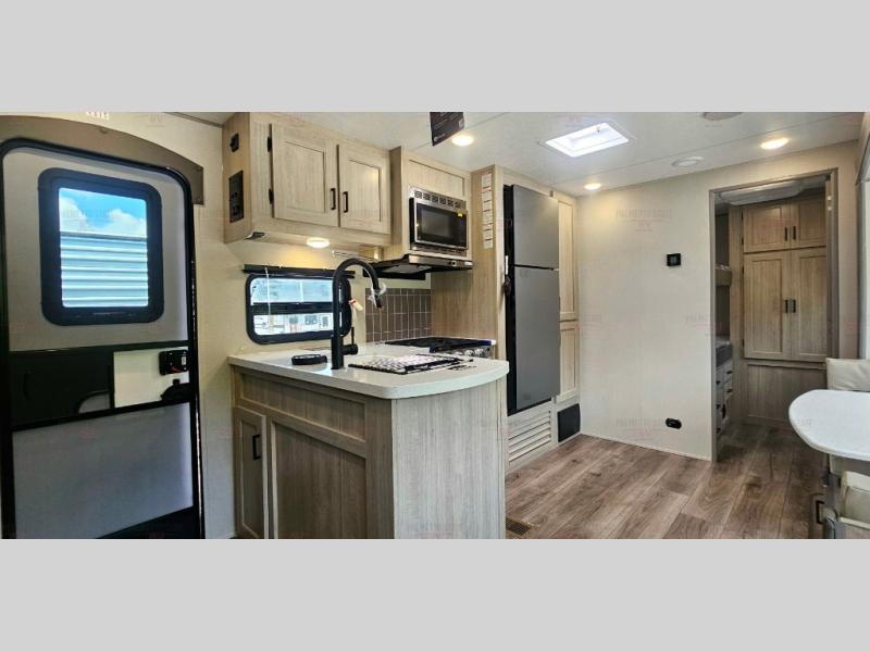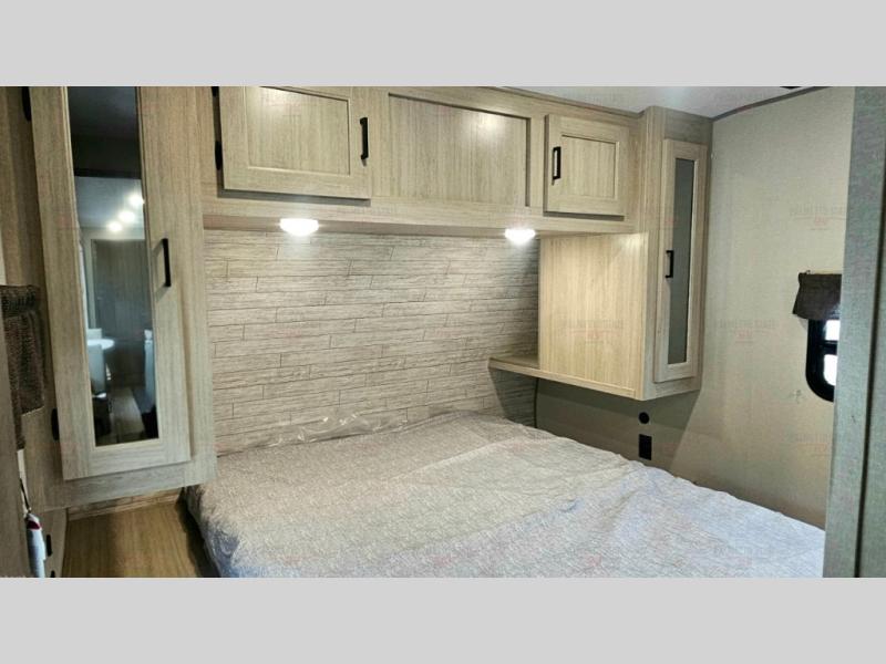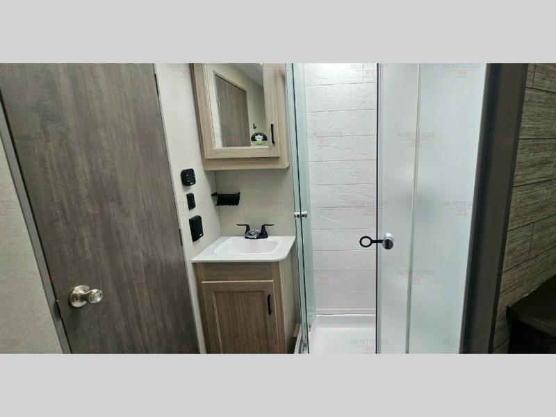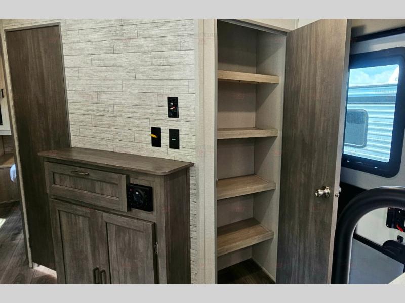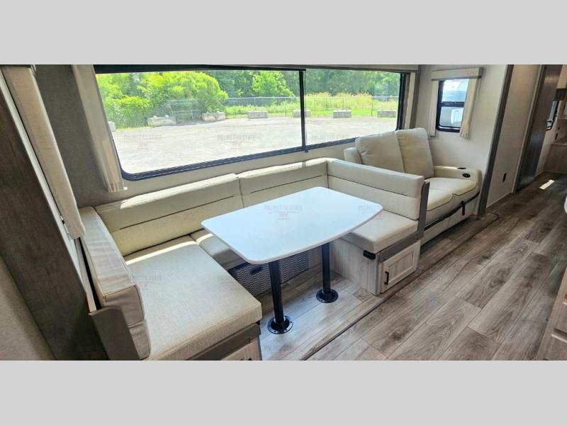 Not only will you be comfortable in this trailer, your friends will have comfort and privacy thanks to having their own bunkhouse with queen-size bunk beds, underbed storage, and a linen closet for clean clothes! The front master bedroom includes a walk-around queen bed, dual wardrobes, plus quick access to the dual entry bath! The combined living and kitchen is spacious thanks to the slide out U-shaped dinette and sofa with drink holders. You can even add the fireplace option if you want that feature. The cook will have full amenities to whip up meals including overhead cabinets for dishes and snacks, plus an outdoor camper kitchen with a pull-out griddle, a cabinet, and a refrigerator!
