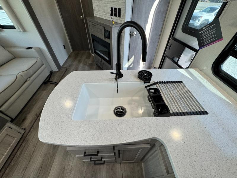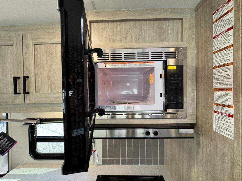 SOLID SURFACE KITCHEN COUNTERTOPS, GE 60K BTU TANKLESS WATER HEATER, STAINLESS GLASS 12V 10 CU FT REFER (GE RESIDENTIAL STYLE FRENCH DOOR 16.4 CU. FT. REFER 323MAZE ONLY), STAINLESS MICROWAVE, STAINLESS 3-BURNER GAS RANGE WITH METAL BACK-LIT KNOBS, 13,500 BTU GE A/C WITH HEAT PUMP, DEEP BASIN FARM STYLE SINK, STAINLESS STEEL DRYING RACK, GLASS RINSER, BRICK BACKSPLASH, (2) USB AND (2) 110 OUTLETS (RETAIL VALUE $2,190.00)