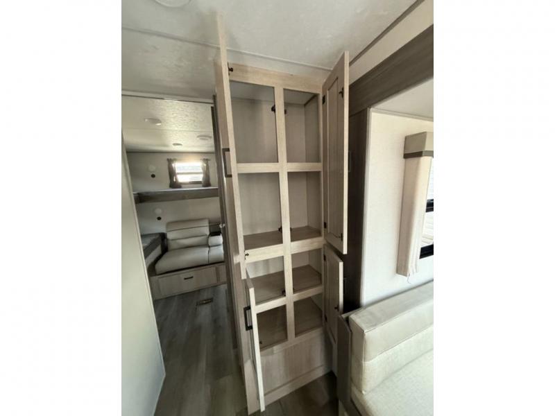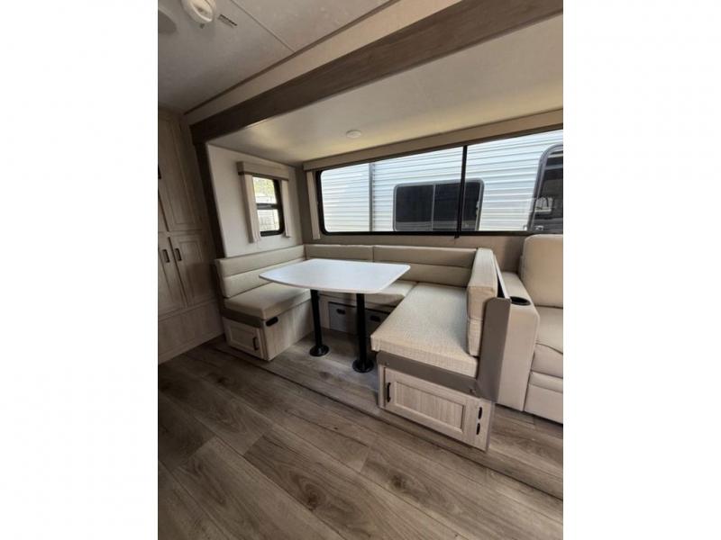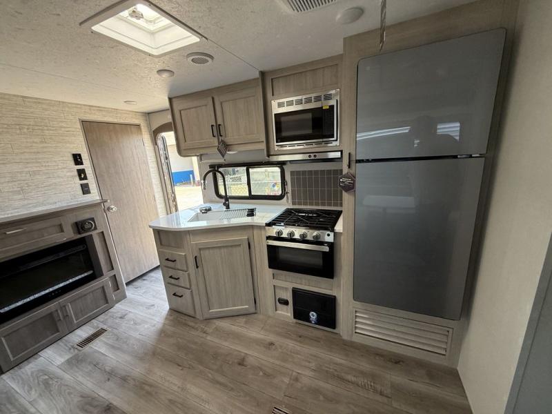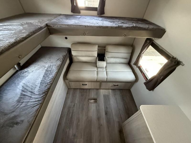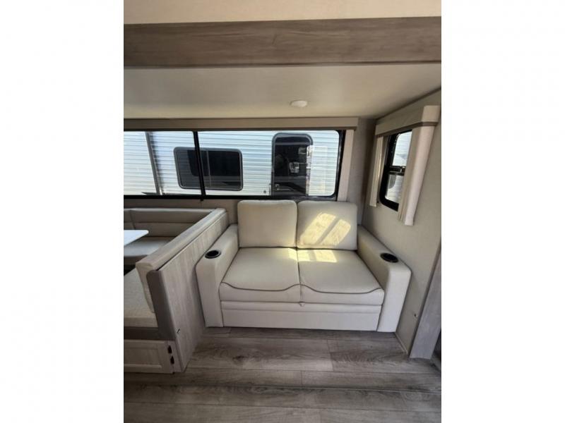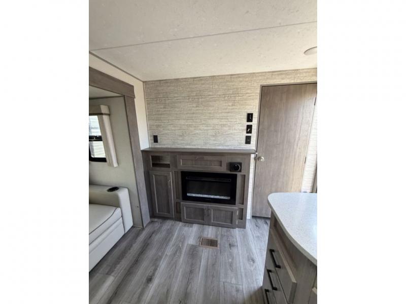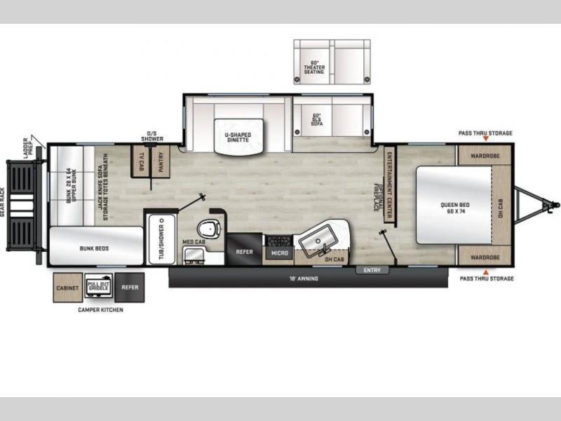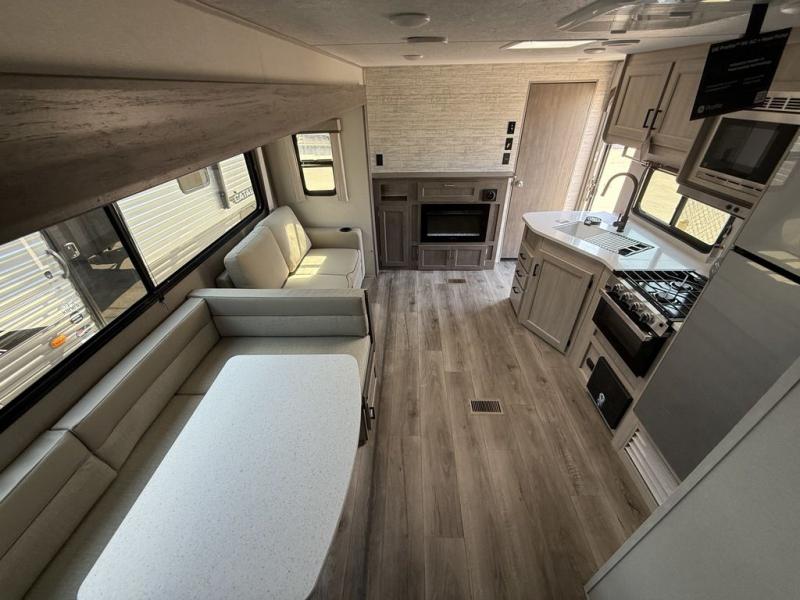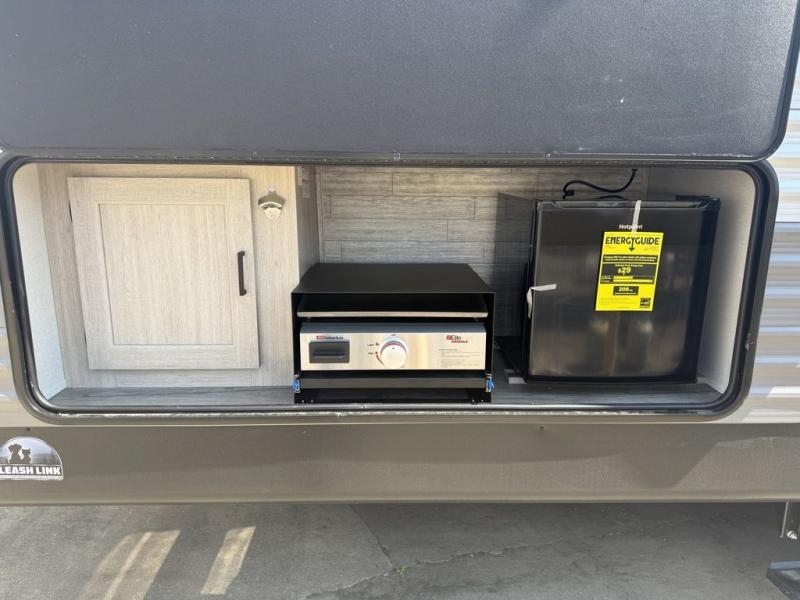 Not only will you be comfortable in this trailer, your friends will have comfort and privacy thanks to having their own bunkhouse with queen-size bunk beds, underbed storage, and a linen closet for clean clothes! The front master bedroom includes a walk-around queen bed, dual wardrobes, plus quick access to the dual entry bath! The combined living and kitchen is spacious thanks to the slide out U-shaped dinette and sofa with drink holders. You can even add the fireplace option if you want that feature. The cook will have full amenities to whip up meals including overhead cabinets for dishes and snacks, plus an outdoor camper kitchen with a pull-out griddle, a cabinet, and a refrigerator!
