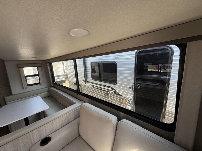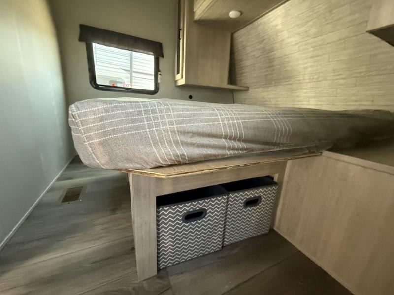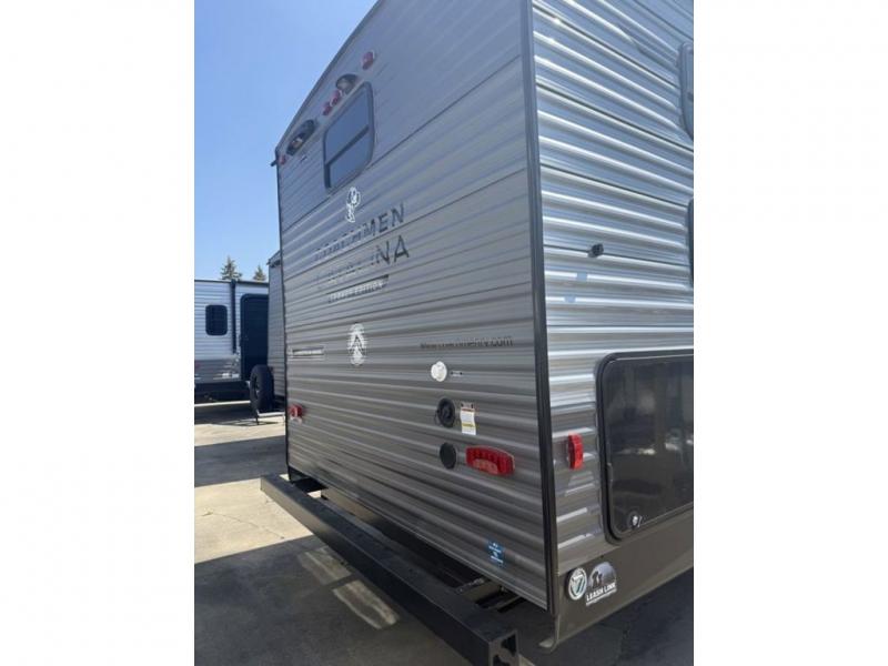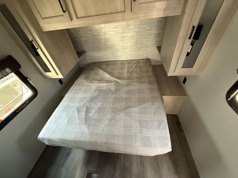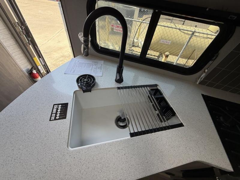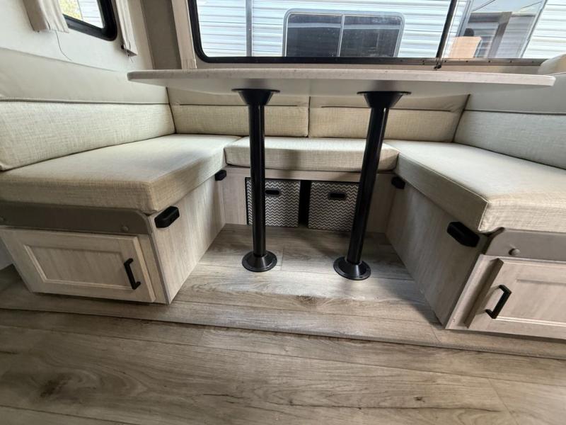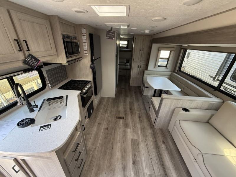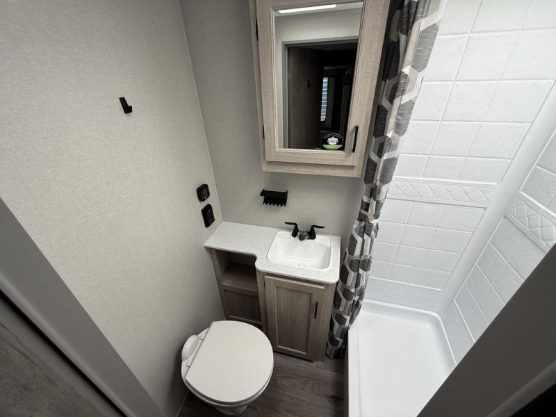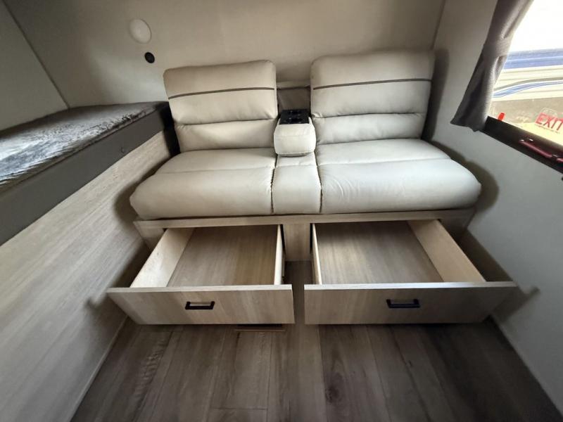 Not only will you be comfortable in this trailer, your friends will have comfort and privacy thanks to having their own bunkhouse with queen-size bunk beds, underbed storage, and a linen closet for clean clothes! The front master bedroom includes a walk-around queen bed, dual wardrobes, plus quick access to the dual entry bath! The combined living and kitchen is spacious thanks to the slide out U-shaped dinette and sofa with drink holders. You can even add the fireplace option if you want that feature. The cook will have full amenities to whip up meals including overhead cabinets for dishes and snacks, plus an outdoor camper kitchen with a pull-out griddle, a cabinet, and a refrigerator!