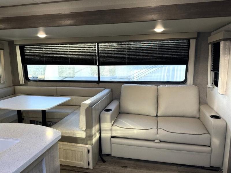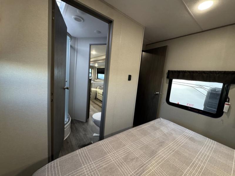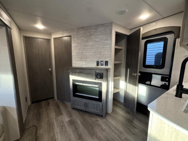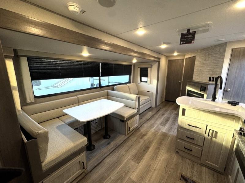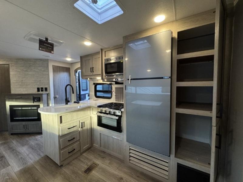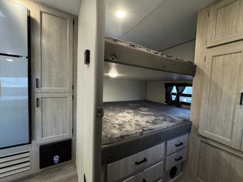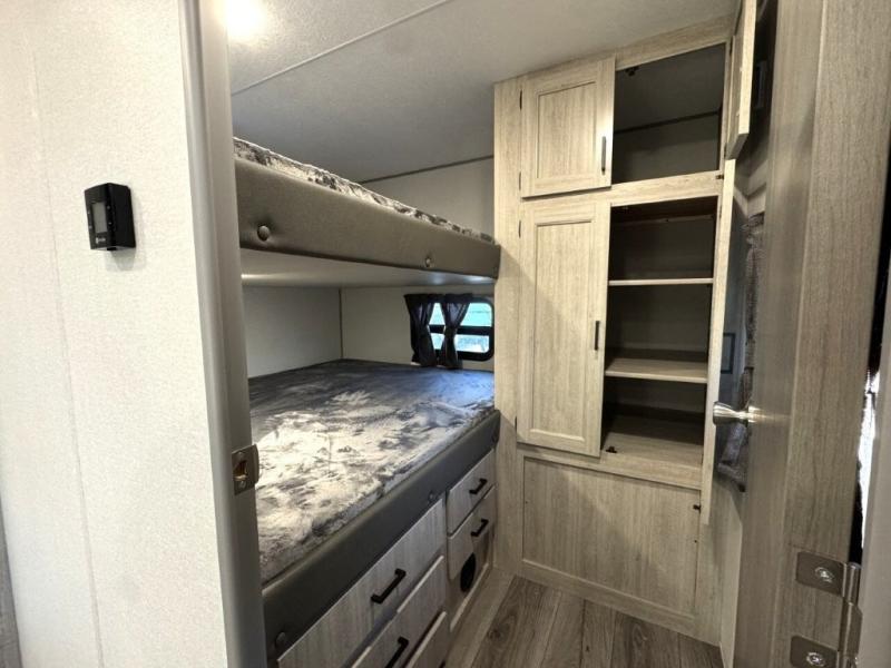 Not only will you be comfortable in this trailer, your friends will have comfort and privacy thanks to having their own bunkhouse with queen-size bunk beds, underbed storage, and a linen closet for clean clothes! The front master bedroom includes a walk-around queen bed, dual wardrobes, plus quick access to the dual entry bath! The combined living and kitchen is spacious thanks to the slide out U-shaped dinette and sofa with drink holders. You can even add the fireplace option if you want that feature. The cook will have full amenities to whip up meals including overhead cabinets for dishes and snacks, plus an outdoor camper kitchen with a pull-out griddle, a cabinet, and a refrigerator!