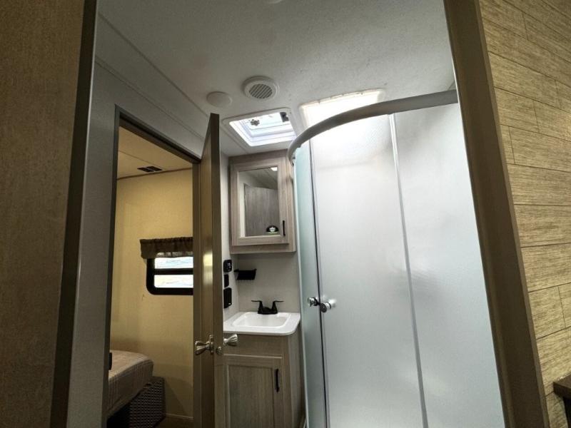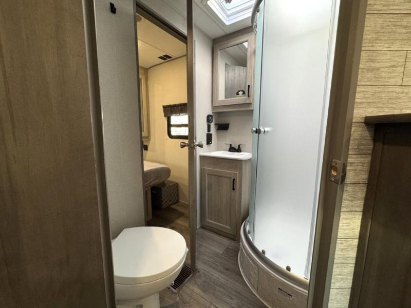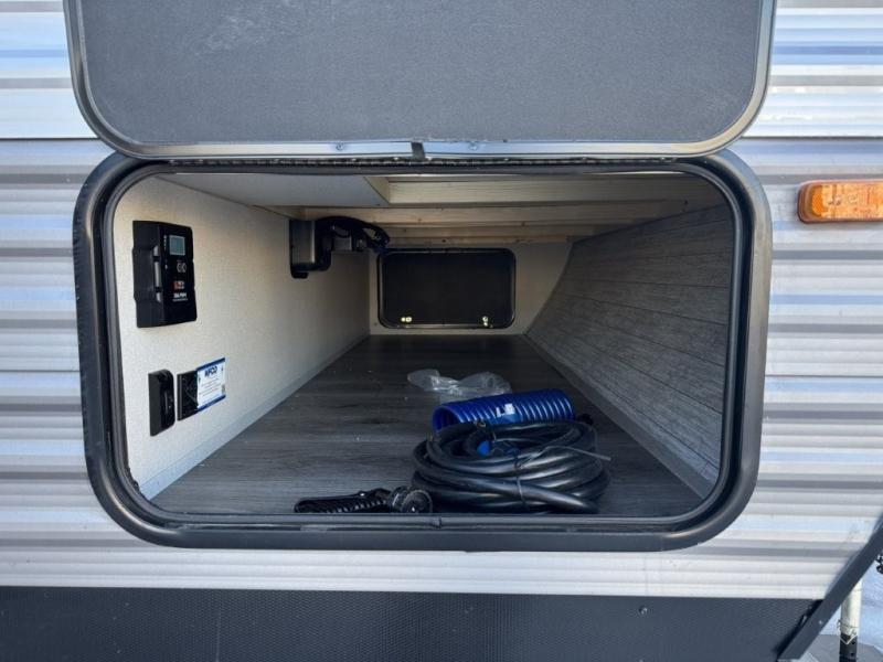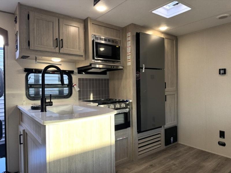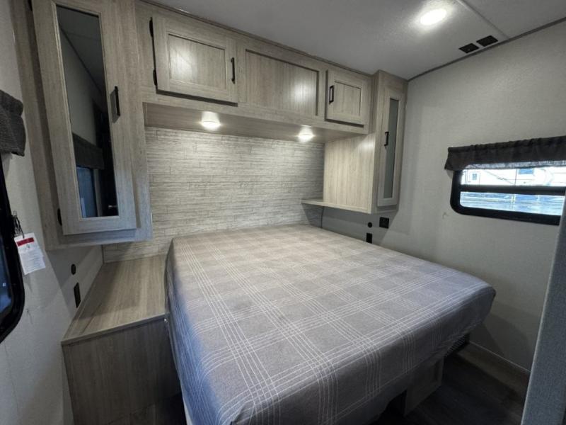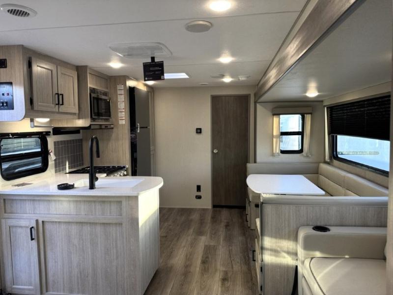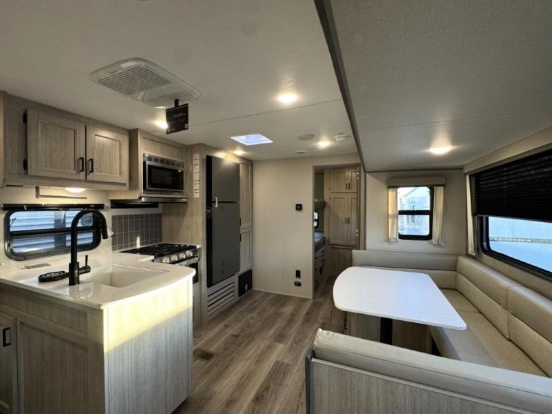 Not only will you be comfortable in this trailer, your friends will have comfort and privacy thanks to having their own bunkhouse with queen-size bunk beds, underbed storage, and a linen closet for clean clothes! The front master bedroom includes a walk-around queen bed, dual wardrobes, plus quick access to the dual entry bath! The combined living and kitchen is spacious thanks to the slide out U-shaped dinette and sofa with drink holders. You can even add the fireplace option if you want that feature. The cook will have full amenities to whip up meals including overhead cabinets for dishes and snacks, plus an outdoor camper kitchen with a pull-out griddle, a cabinet, and a refrigerator!