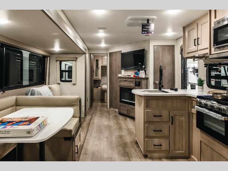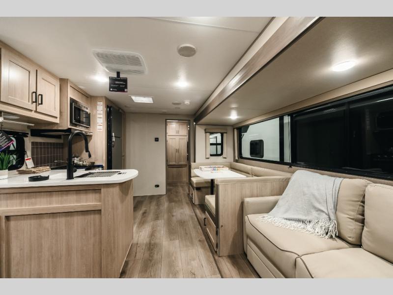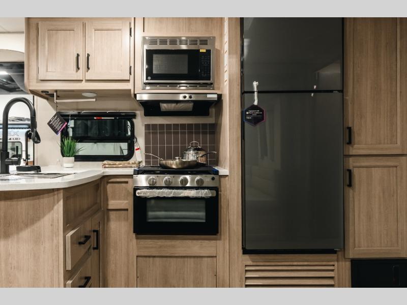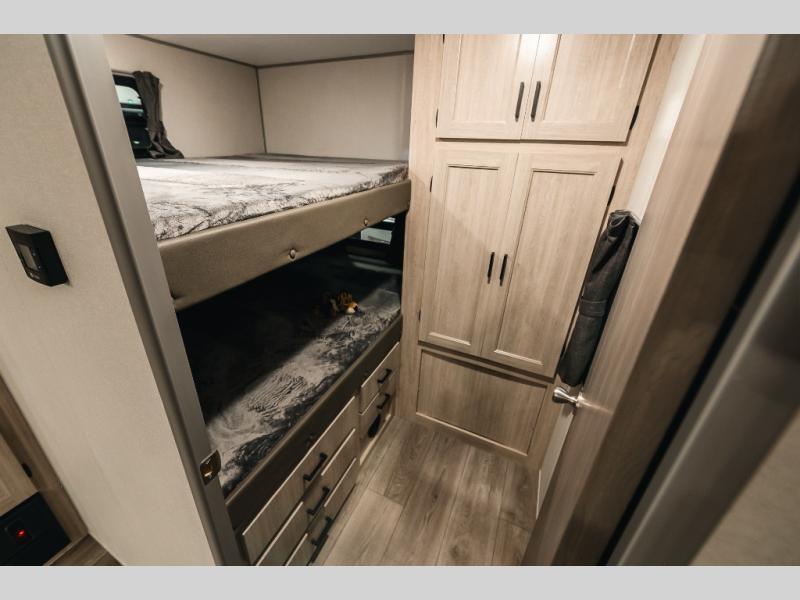 Not only will you be comfortable in this trailer, your friends will have comfort and privacy thanks to having their own bunkhouse with queen-size bunk beds, underbed storage, and a linen closet for clean clothes! The front master bedroom includes a walk-around queen bed, dual wardrobes, plus quick access to the dual entry bath! The combined living and kitchen is spacious thanks to the slide out U-shaped dinette and sofa with drink holders. You can even add the fireplace option if you want that feature. The cook will have full amenities to whip up meals including overhead cabinets for dishes and snacks, plus an outdoor camper kitchen with a pull-out griddle, a cabinet, and a refrigerator!