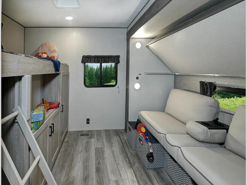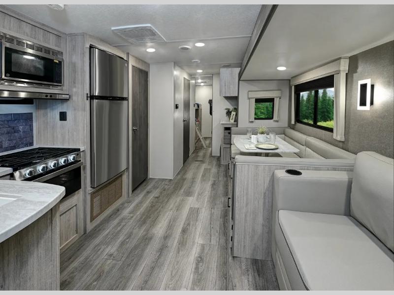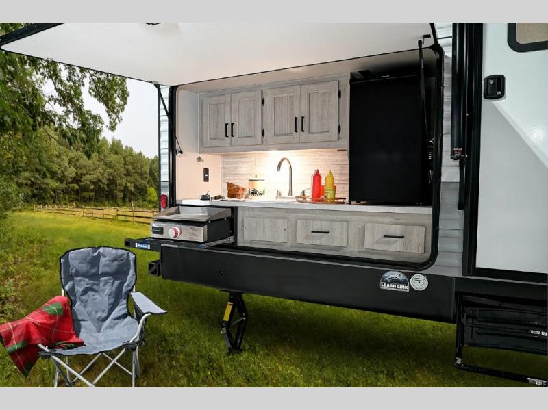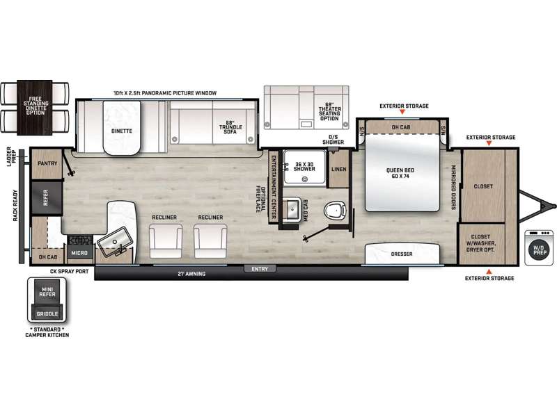 Enjoy relaxing under the 21' electric awning during the daytime for some protection from the sun, and at night with multicolor LED lights to set the mood for the evening. You can store beverages in the exterior mini fridge for convenience, and there is exterior storage for outdoor games and such. The interior is spacious with a large slide out booth dinette and sofa with drink holders, yet you might like to choose the free standing dinette option in place of the booth dinette. There is also a fireplace option under the entertainment center for a more cozy feel. The two recliner lounges are sure to be a favorite spot, and the cook will love the rear kitchen including the U-shaped counter when preparing meals and drying the dishes. The front bedroom features a queen bed slide, a large closet and a dresser, plus second closet with washer and dryer prep.