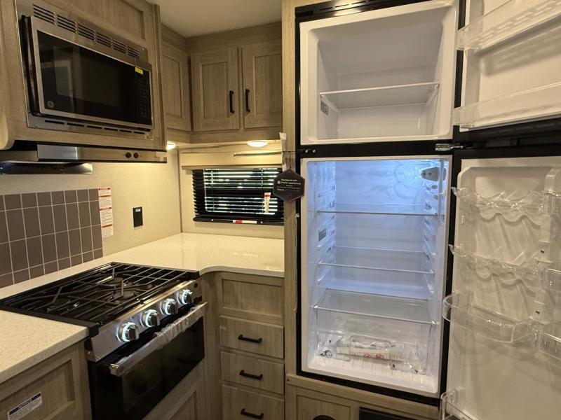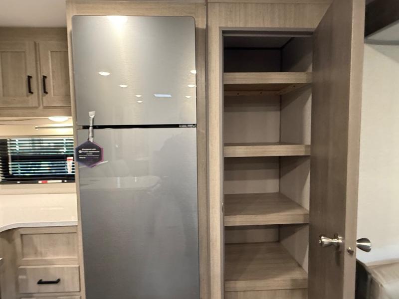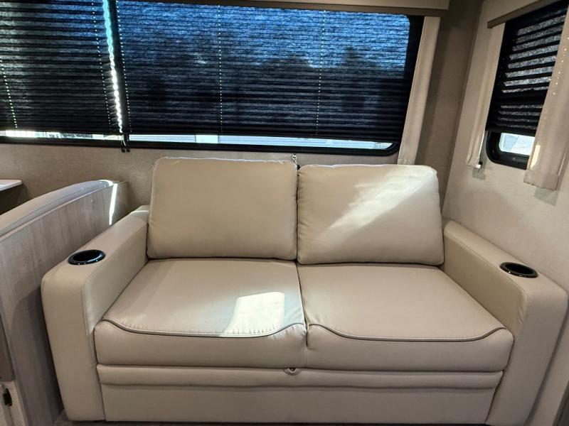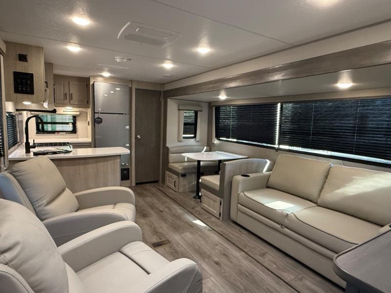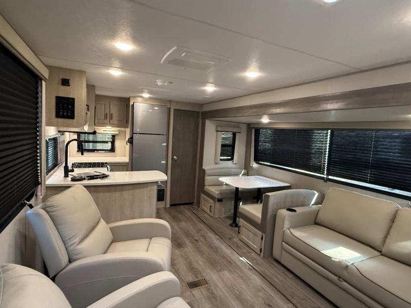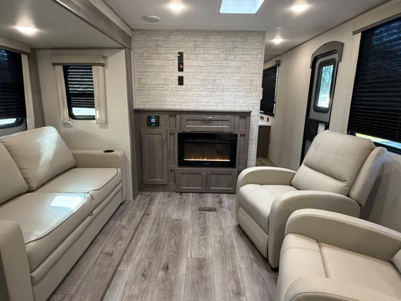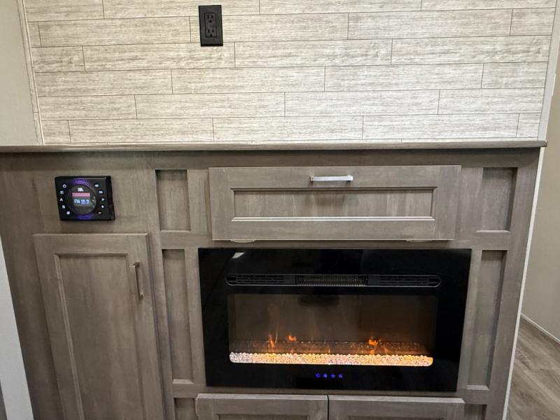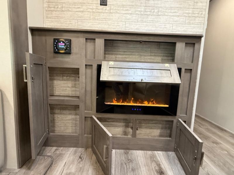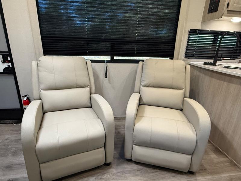 Enjoy relaxing under the 21' electric awning during the daytime for some protection from the sun, and at night with multicolor LED lights to set the mood for the evening. You can store beverages in the exterior mini fridge for convenience, and there is exterior storage for outdoor games and such. The interior is spacious with a large slide out booth dinette and sofa with drink holders, yet you might like to choose the free-standing dinette option in place of the booth dinette. There is also a fireplace option under the entertainment center for a cozier feel. The two recliner lounges are sure to be a favorite spot, and the cook will love the rear kitchen including the U-shaped counter when preparing meals and drying the dishes. The front bedroom features a queen bed slide, a large closet and a dresser, plus second closet with washer and dryer prep.