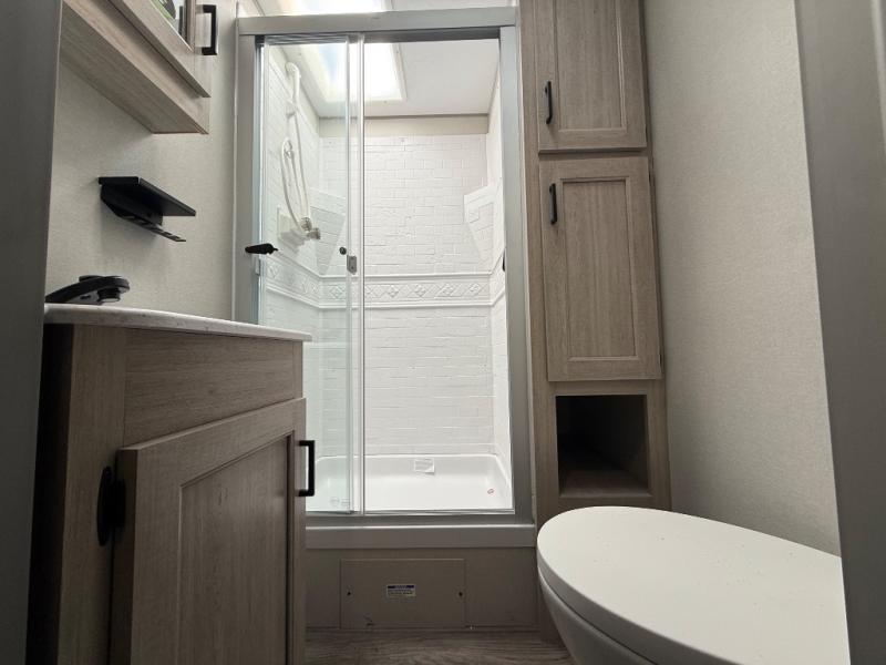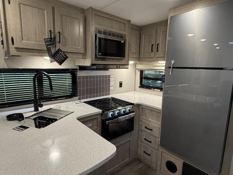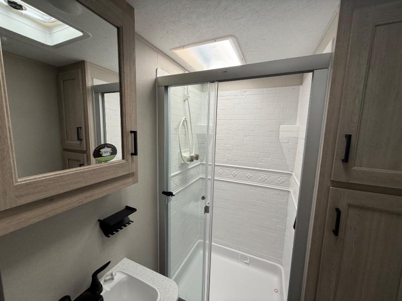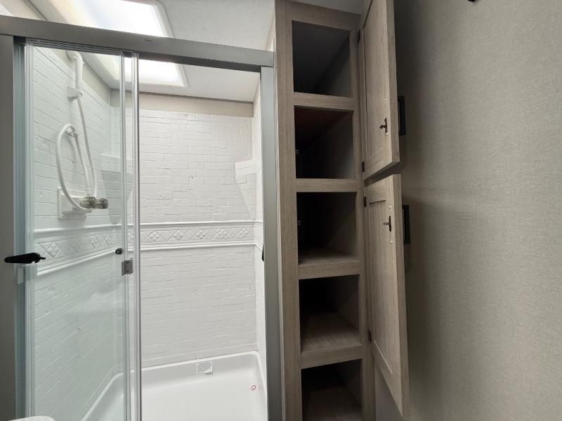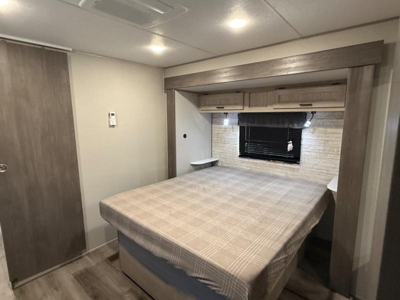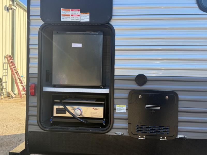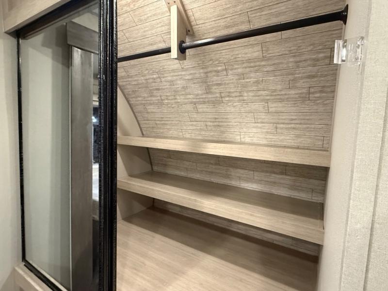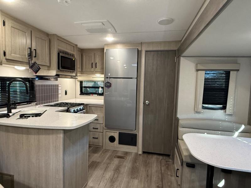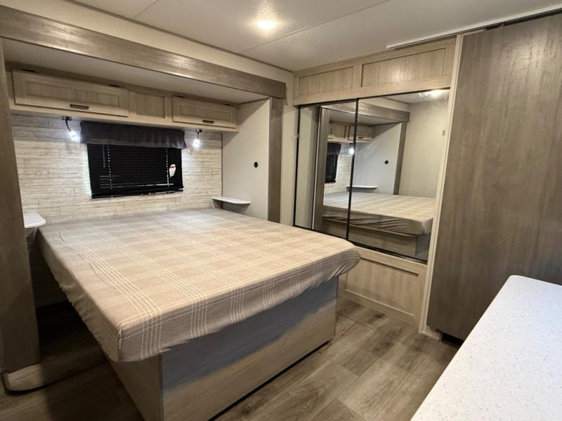 Enjoy relaxing under the 21' electric awning during the daytime for some protection from the sun, and at night with multicolor LED lights to set the mood for the evening. You can store beverages in the exterior mini fridge for convenience, and there is exterior storage for outdoor games and such. The interior is spacious with a large slide out booth dinette and sofa with drink holders, yet you might like to choose the free-standing dinette option in place of the booth dinette. There is also a fireplace option under the entertainment center for a cozier feel. The two recliner lounges are sure to be a favorite spot, and the cook will love the rear kitchen including the U-shaped counter when preparing meals and drying the dishes. The front bedroom features a queen bed slide, a large closet and a dresser, plus second closet with washer and dryer prep.