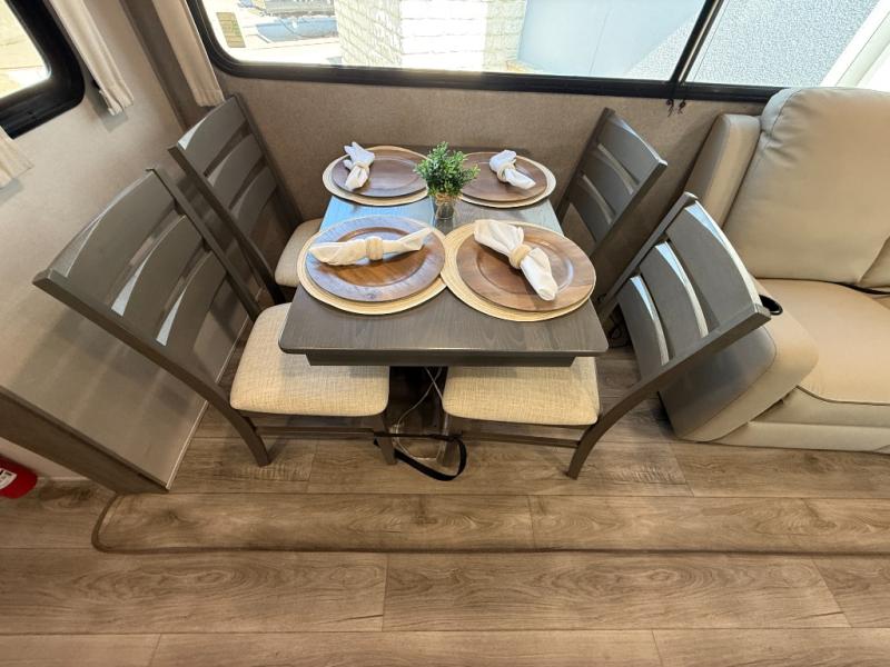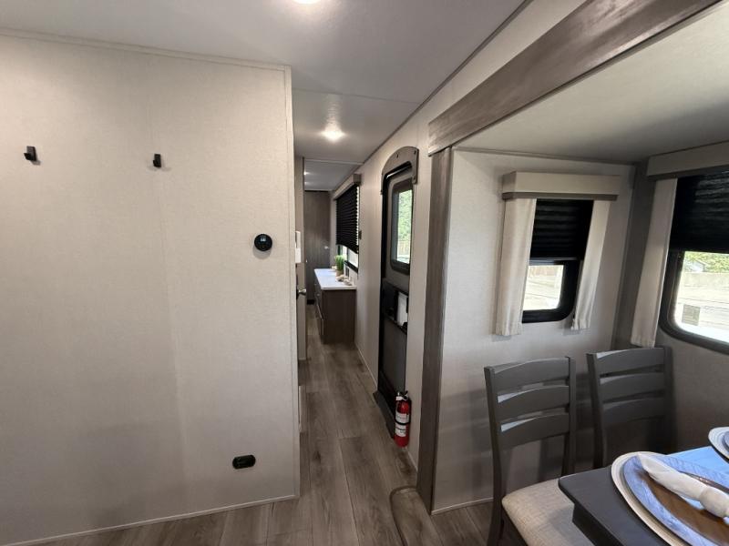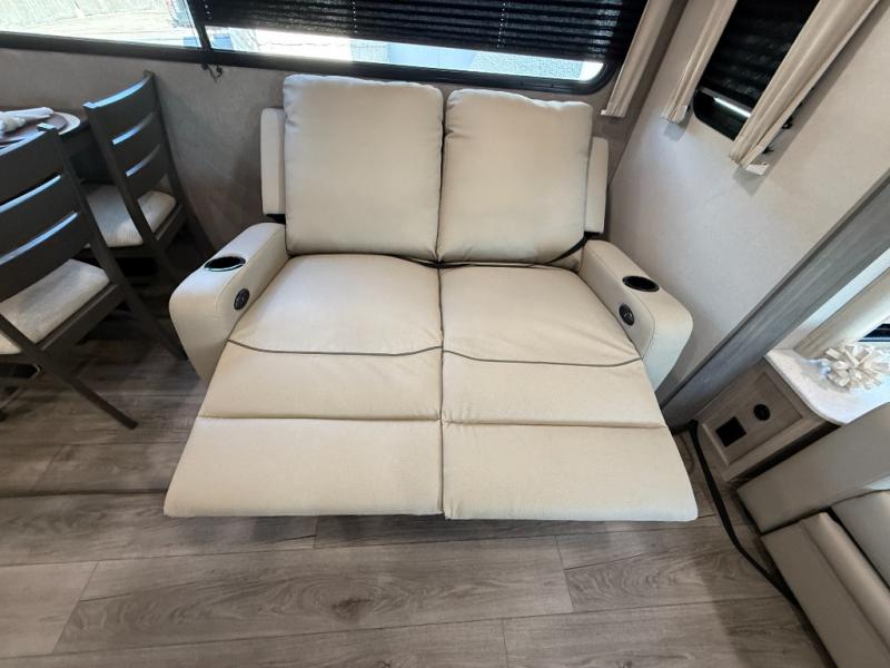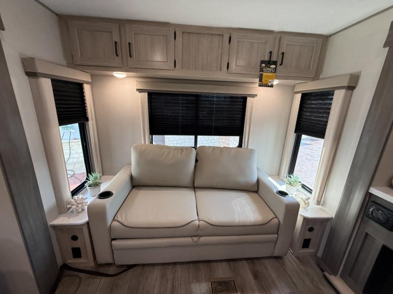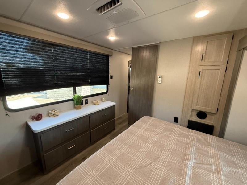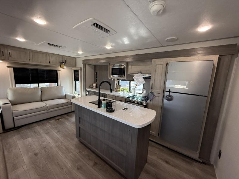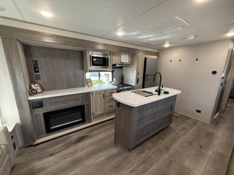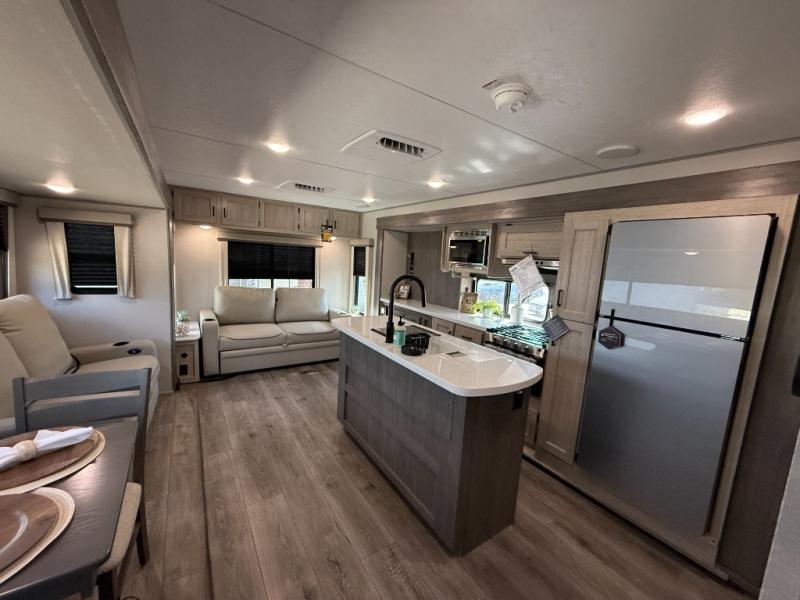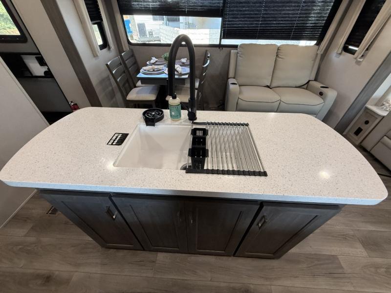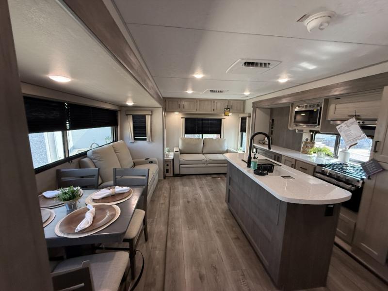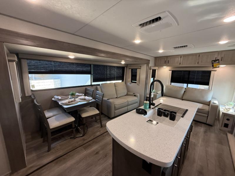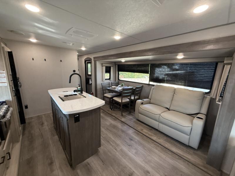 It's not hard to find comfort in this travel trailer with its triple slides, theater seating, and spacious full bath. Once your crew is settled and unpacked, head outdoors to relax under the two power awnings with multicolored LED lights, or grab the fishing poles from the exterior storage and head to the water. If you'd rather spend your day inside you'll find all the comforts of home; theater seating, a sofa and booth dinette, plus a fully equipped kitchen, complete with a kitchen island! You will love having your own space in the front bedroom that includes a queen bed slide out, a dresser, plus two closets. There is even washer and dryer prep if you plan to go full-time!