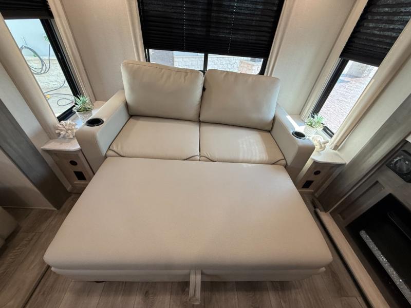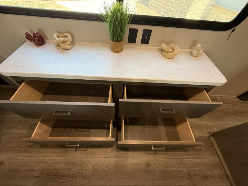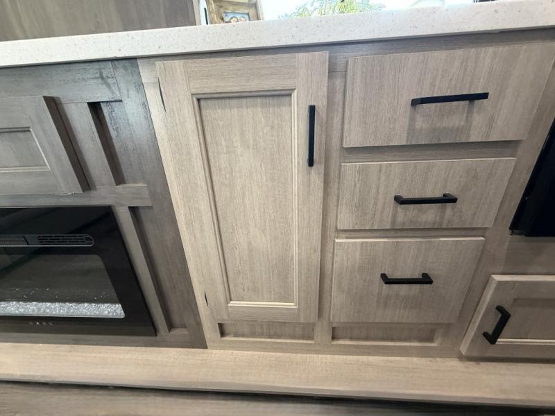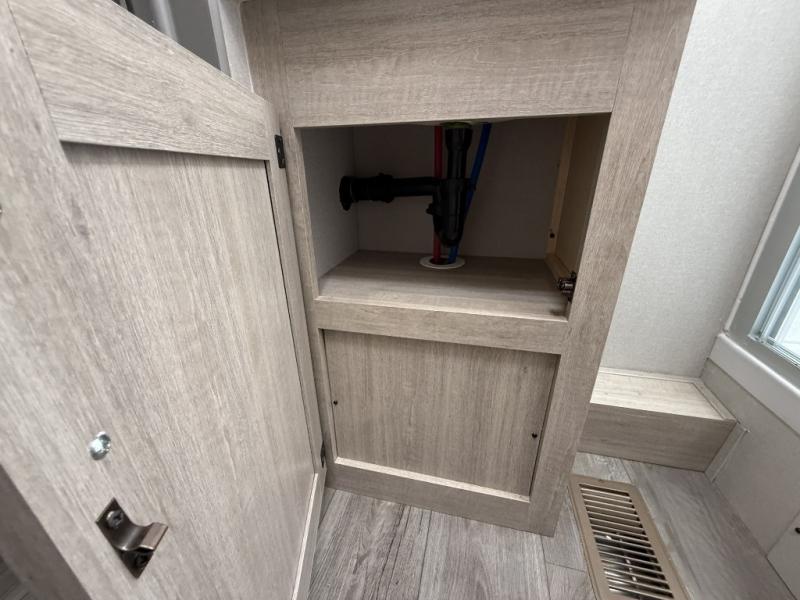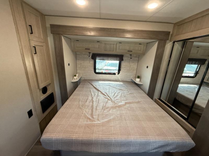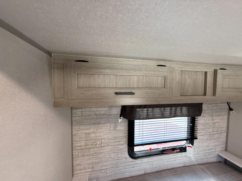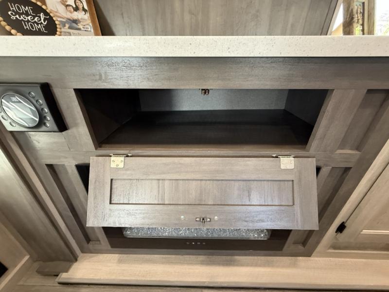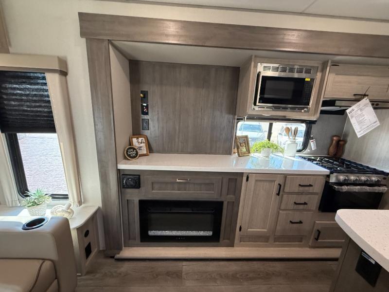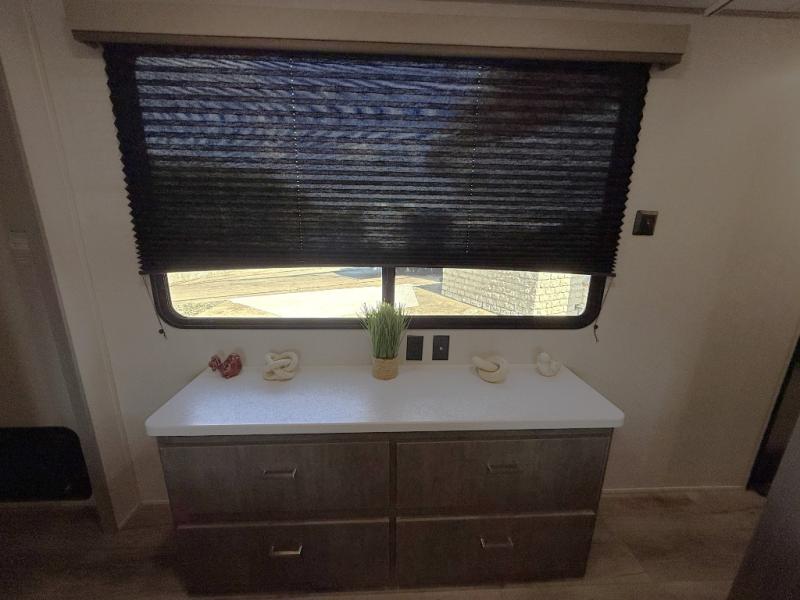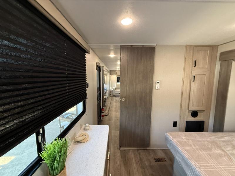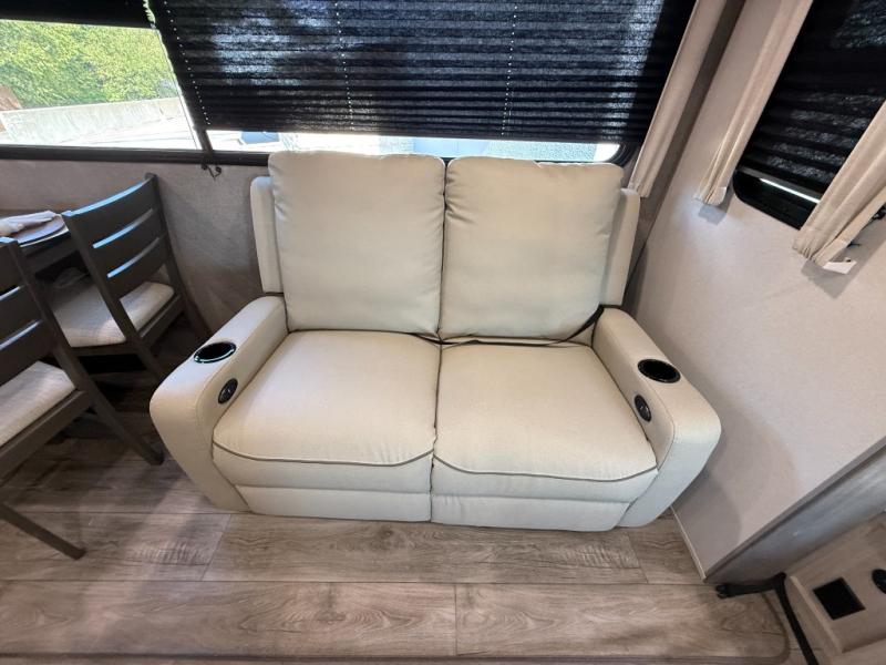 It's not hard to find comfort in this travel trailer with its triple slides, theater seating, and spacious full bath. Once your crew is settled and unpacked, head outdoors to relax under the two power awnings with multicolored LED lights, or grab the fishing poles from the exterior storage and head to the water. If you'd rather spend your day inside you'll find all the comforts of home; theater seating, a sofa and booth dinette, plus a fully equipped kitchen, complete with a kitchen island! You will love having your own space in the front bedroom that includes a queen bed slide out, a dresser, plus two closets. There is even washer and dryer prep if you plan to go full-time!