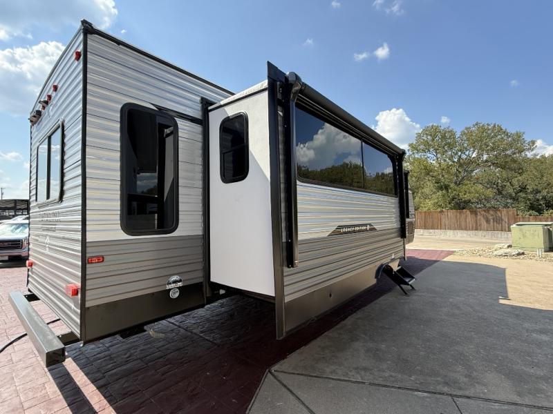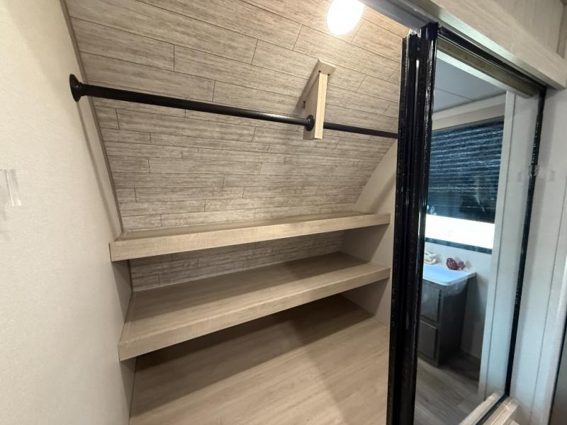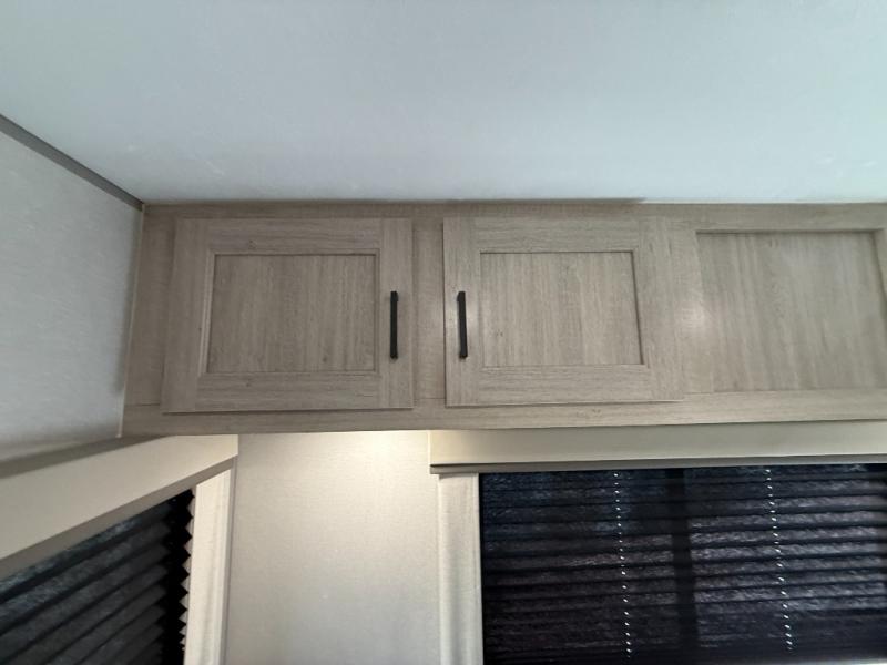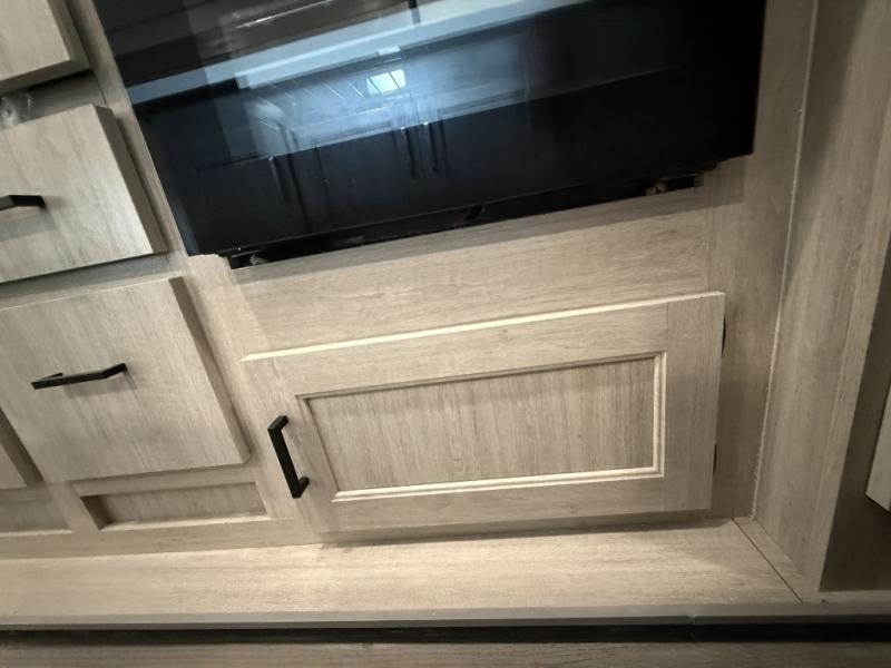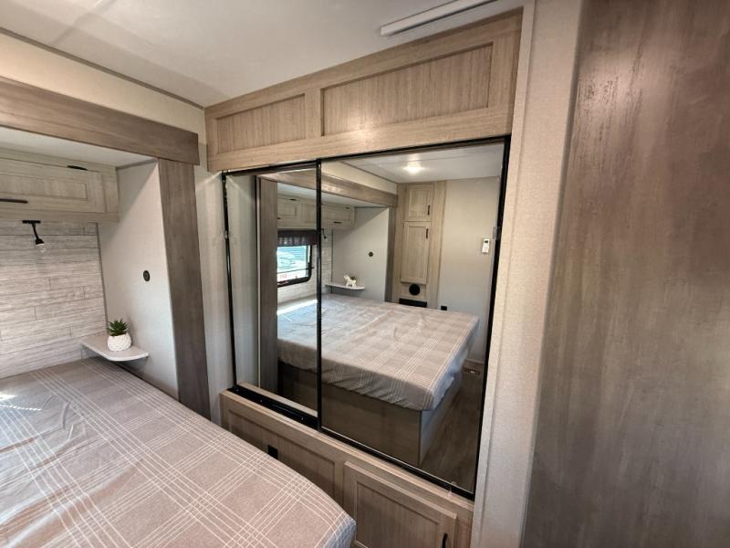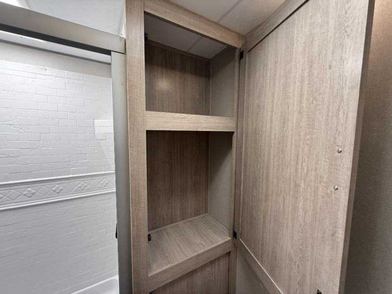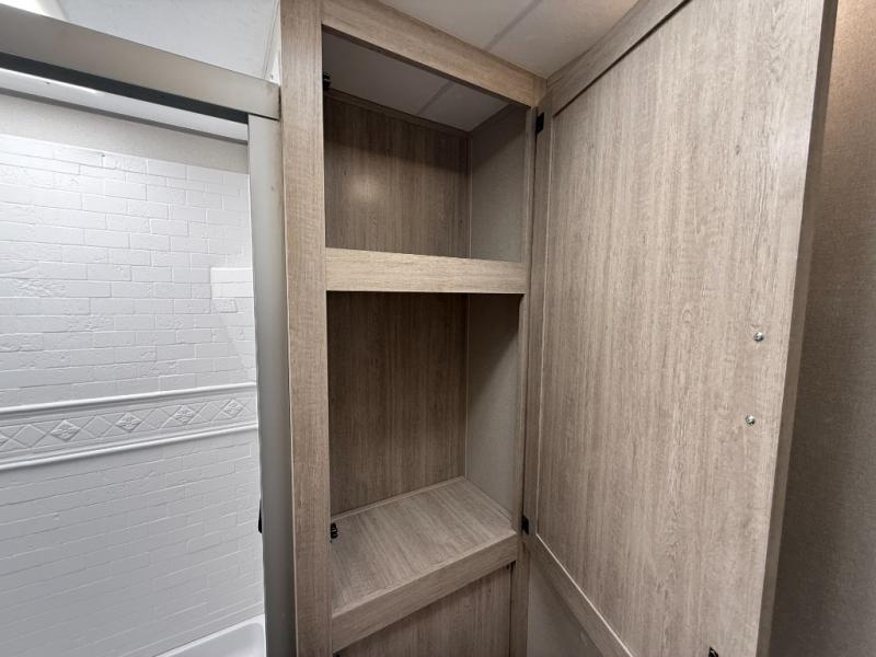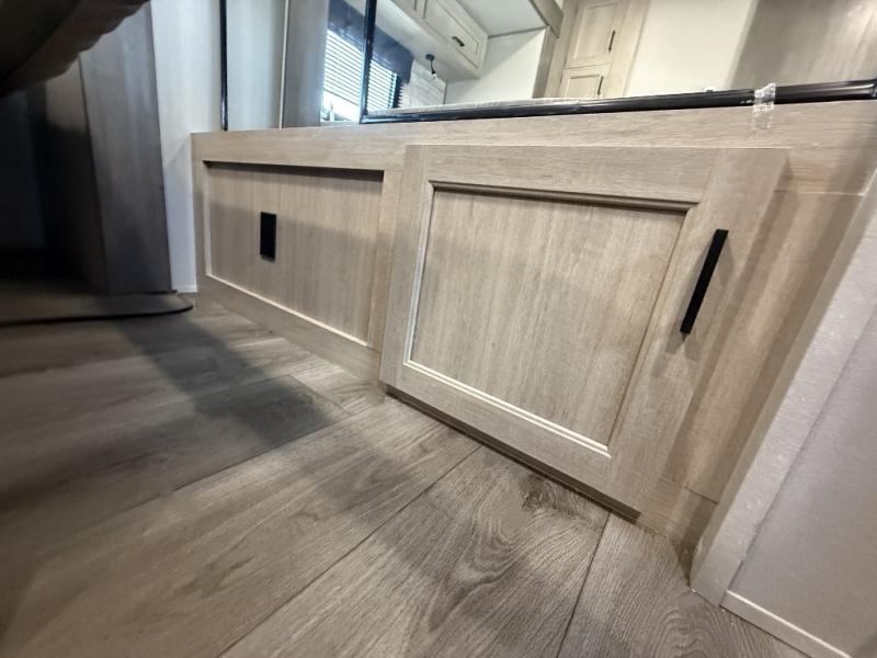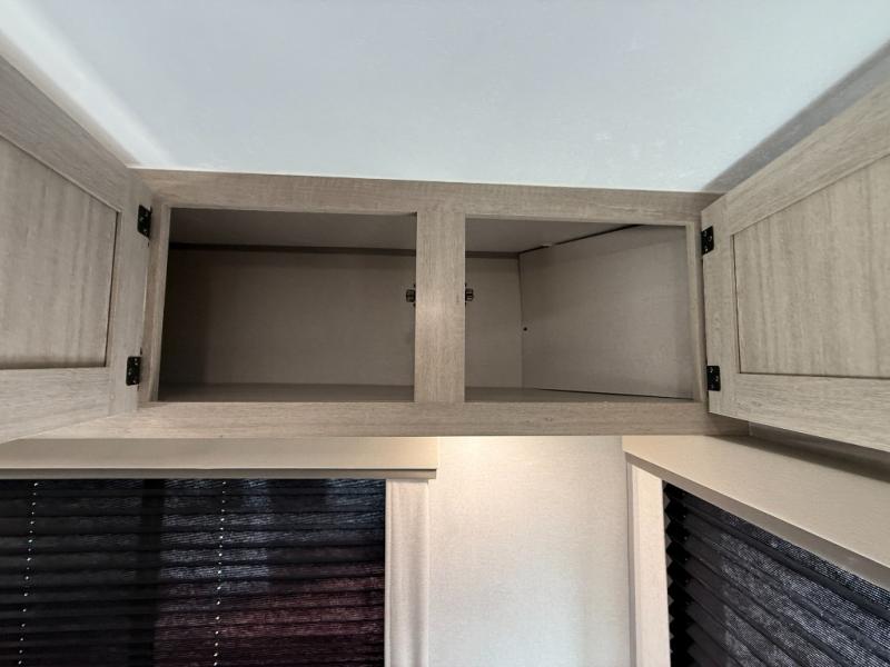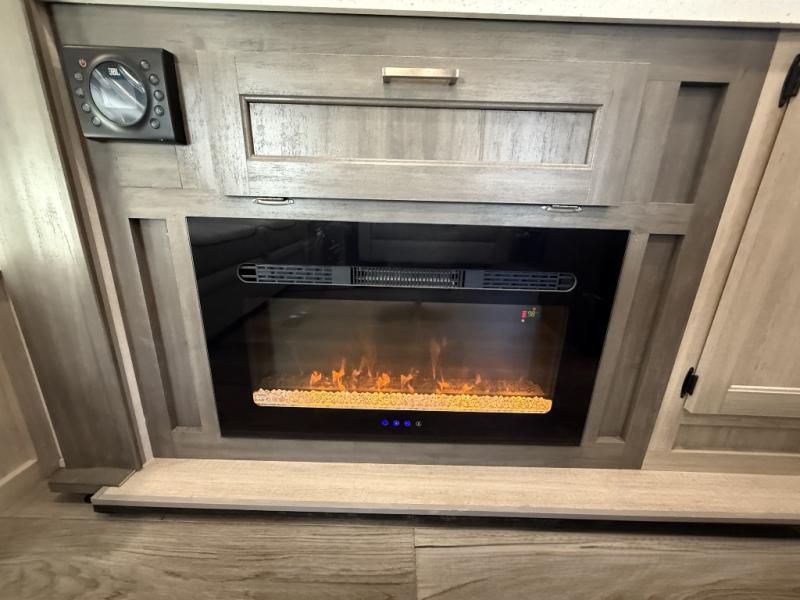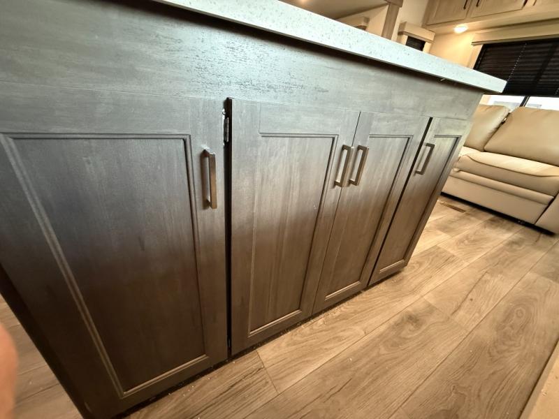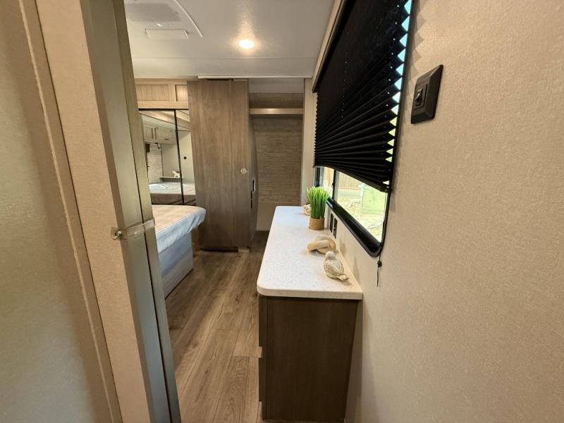 It's not hard to find comfort in this travel trailer with its triple slides, theater seating, and spacious full bath. Once your crew is settled and unpacked, head outdoors to relax under the two power awnings with multicolored LED lights, or grab the fishing poles from the exterior storage and head to the water. If you'd rather spend your day inside you'll find all the comforts of home; theater seating, a sofa and booth dinette, plus a fully equipped kitchen, complete with a kitchen island! You will love having your own space in the front bedroom that includes a queen bed slide out, a dresser, plus two closets. There is even washer and dryer prep if you plan to go full-time!