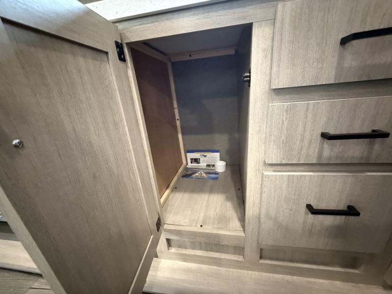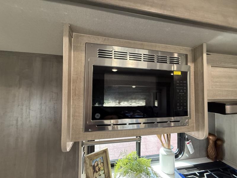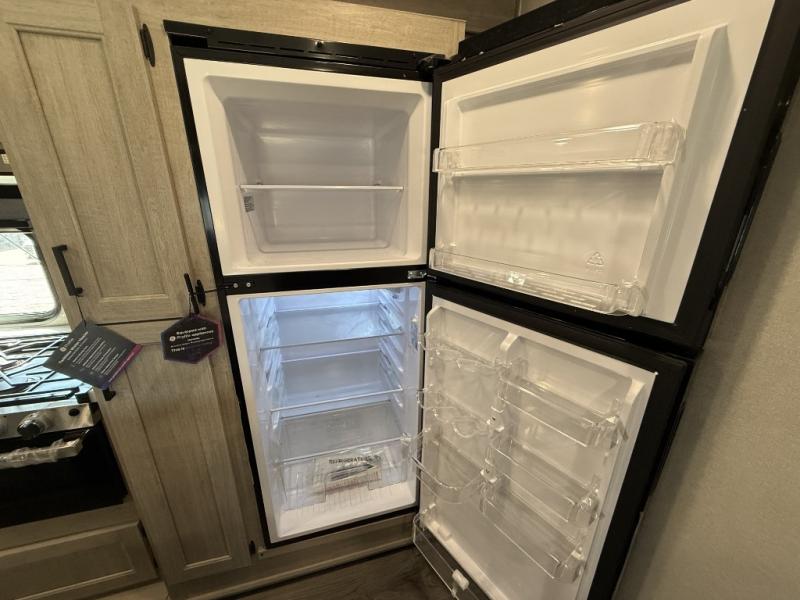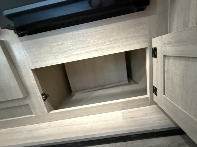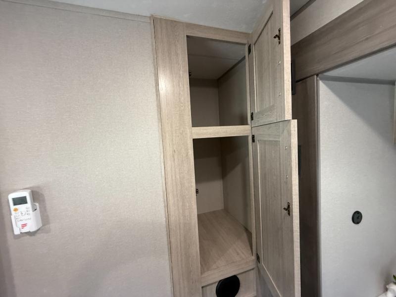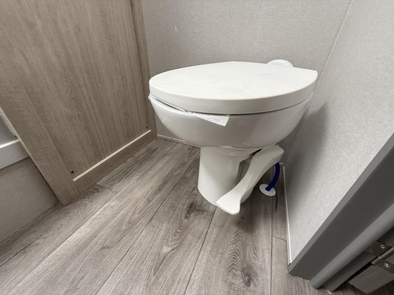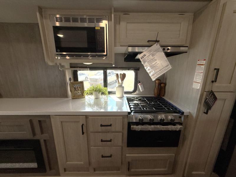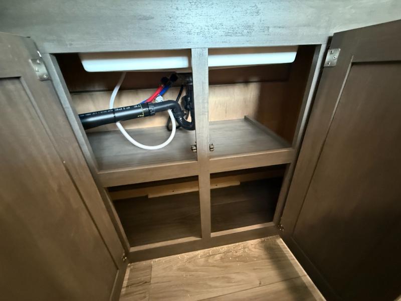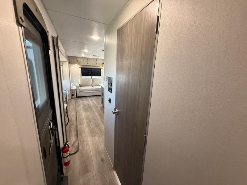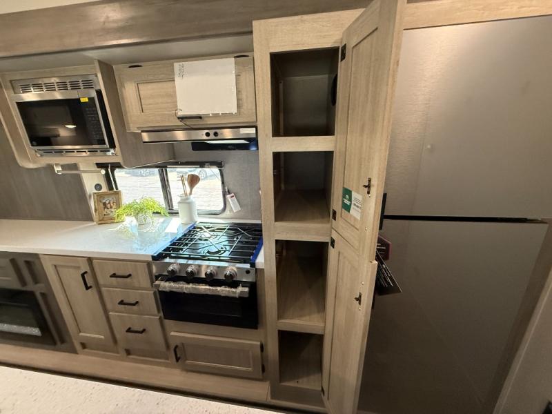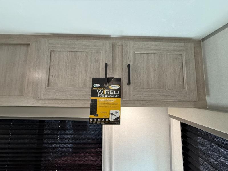 It's not hard to find comfort in this travel trailer with its triple slides, theater seating, and spacious full bath. Once your crew is settled and unpacked, head outdoors to relax under the two power awnings with multicolored LED lights, or grab the fishing poles from the exterior storage and head to the water. If you'd rather spend your day inside you'll find all the comforts of home; theater seating, a sofa and booth dinette, plus a fully equipped kitchen, complete with a kitchen island! You will love having your own space in the front bedroom that includes a queen bed slide out, a dresser, plus two closets. There is even washer and dryer prep if you plan to go full-time!