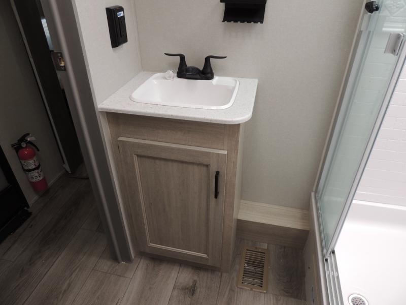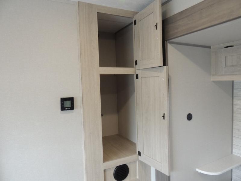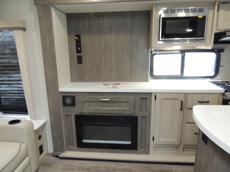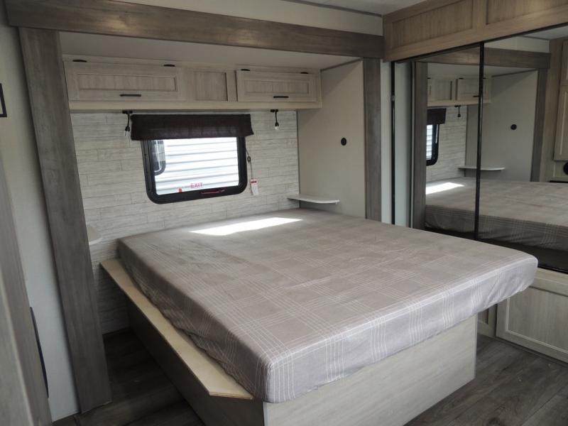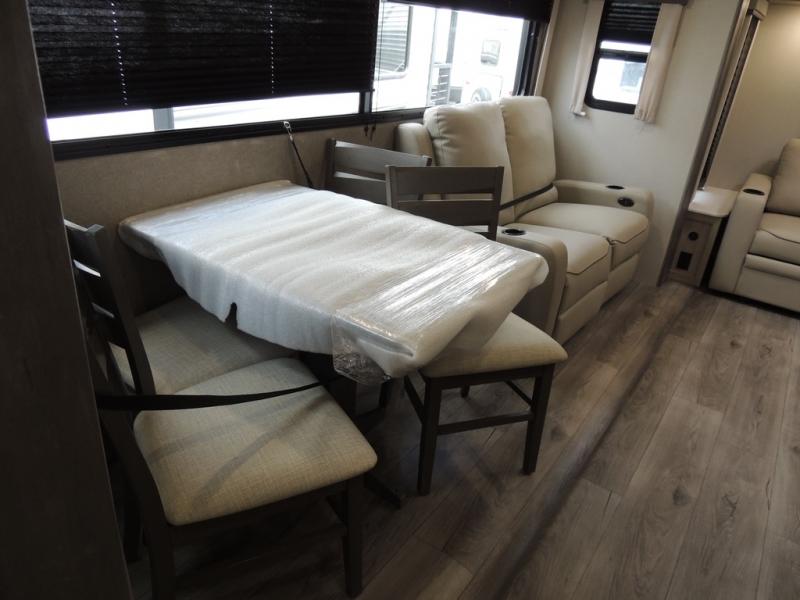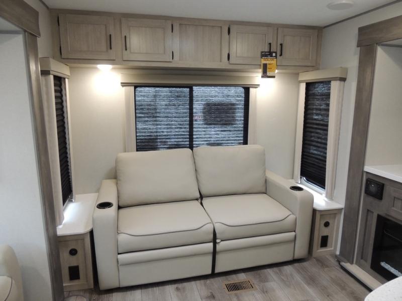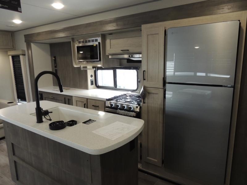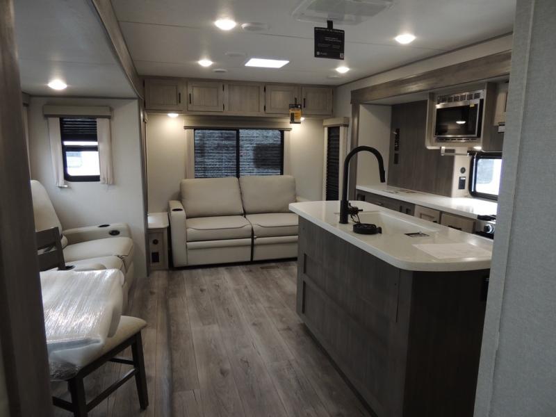 It's not hard to find comfort in this travel trailer with its triple slides, theater seating, and spacious full bath. Once your crew is settled and unpacked, head outdoors to relax under the two power awnings with multicolored LED lights, or grab the fishing poles from the exterior storage and head to the water. If you'd rather spend your day inside you'll find all the comforts of home; theater seating, a sofa and booth dinette, plus a fully equipped kitchen, complete with a kitchen island! You will love having your own space in the front bedroom that includes a queen bed slide out, a dresser, plus two closets. There is even washer and dryer prep if you plan to go full-time!