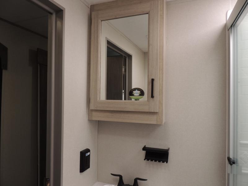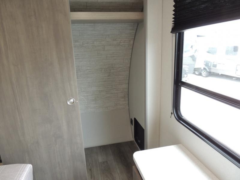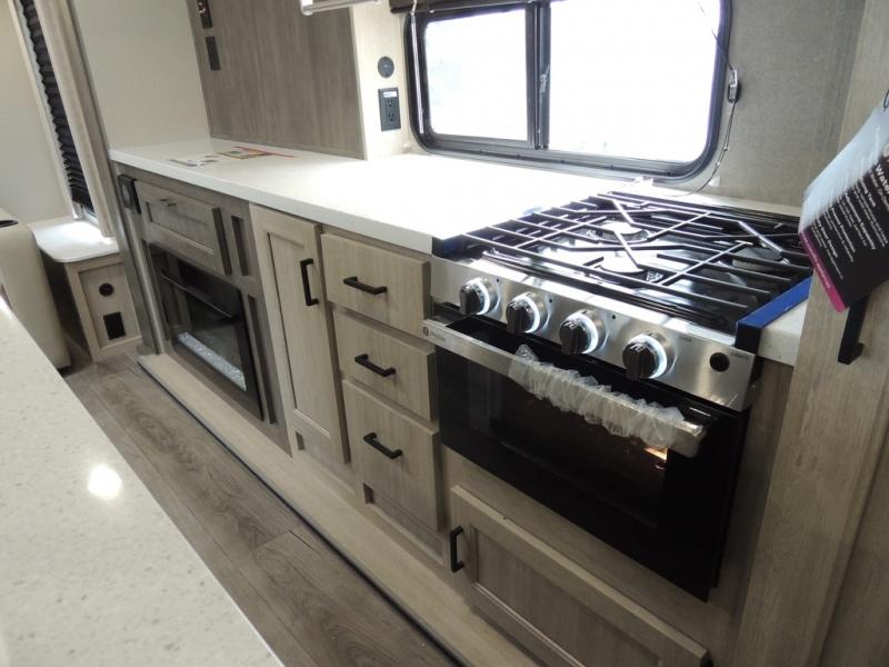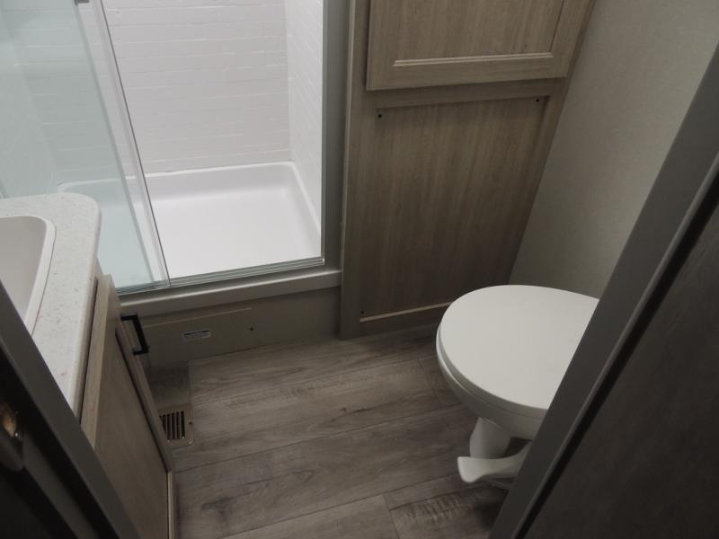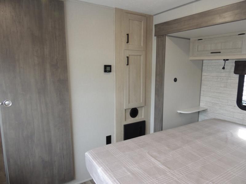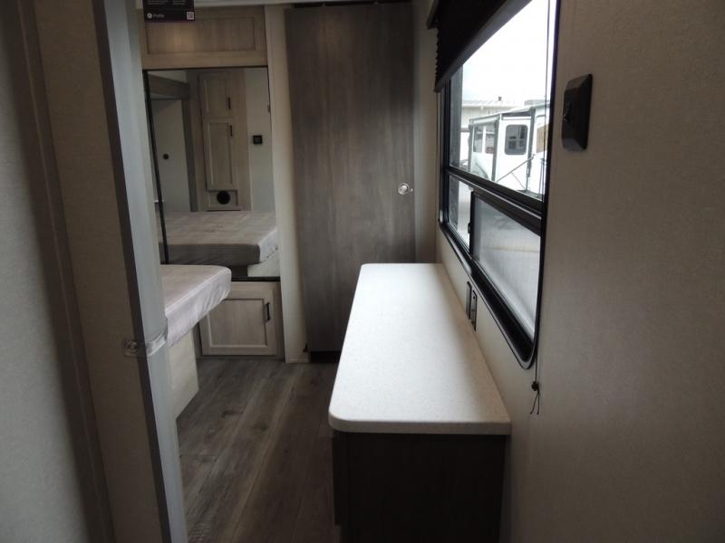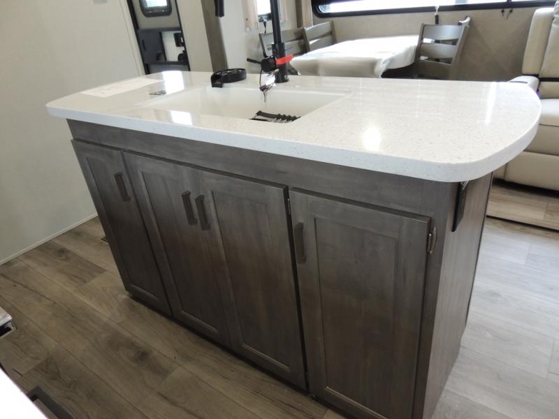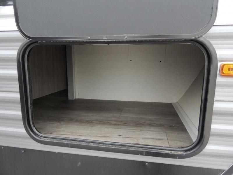 It's not hard to find comfort in this travel trailer with its triple slides, theater seating, and spacious full bath. Once your crew is settled and unpacked, head outdoors to relax under the two power awnings with multicolored LED lights, or grab the fishing poles from the exterior storage and head to the water. If you'd rather spend your day inside you'll find all the comforts of home; theater seating, a sofa and booth dinette, plus a fully equipped kitchen, complete with a kitchen island! You will love having your own space in the front bedroom that includes a queen bed slide out, a dresser, plus two closets. There is even washer and dryer prep if you plan to go full-time!