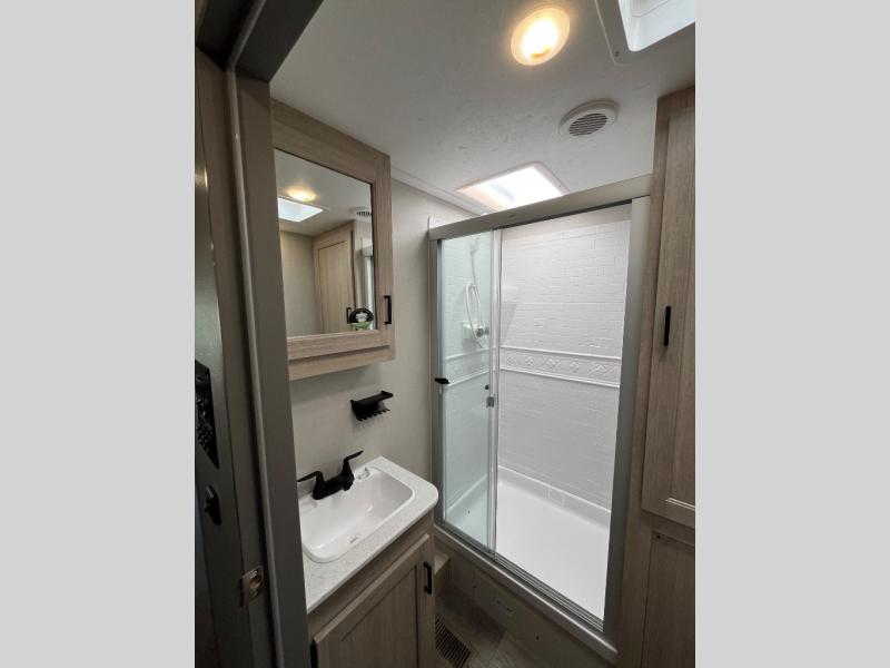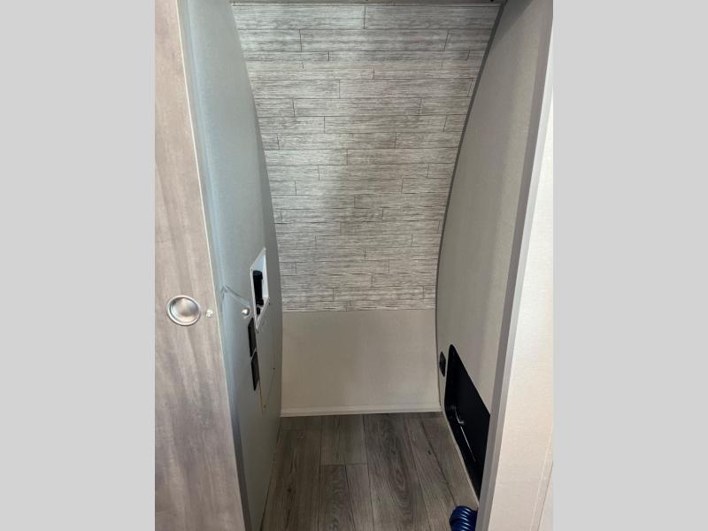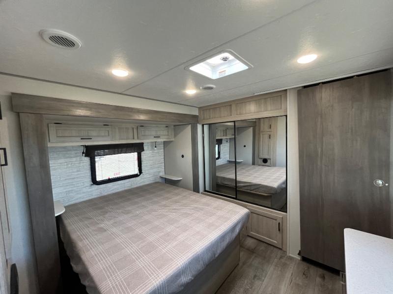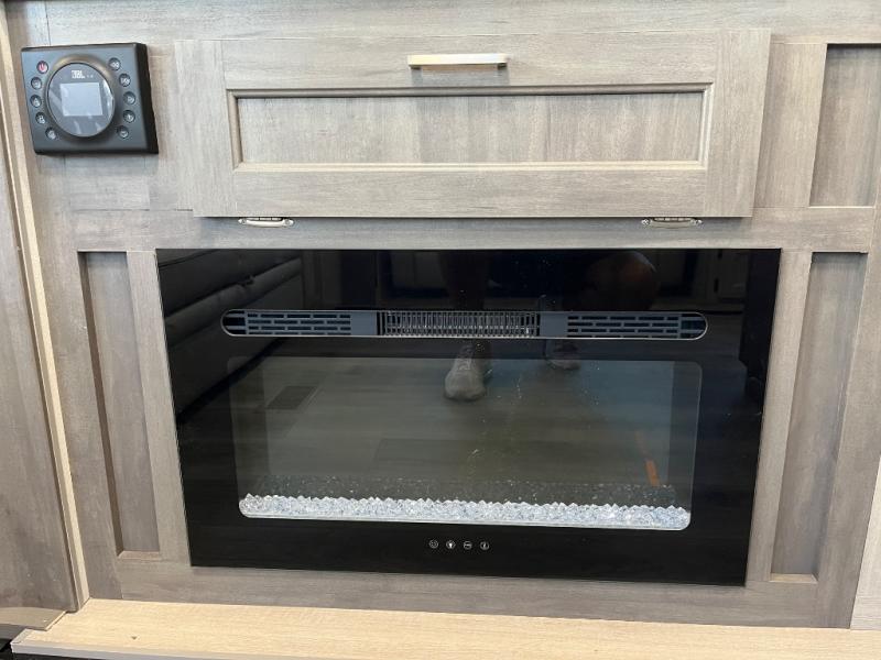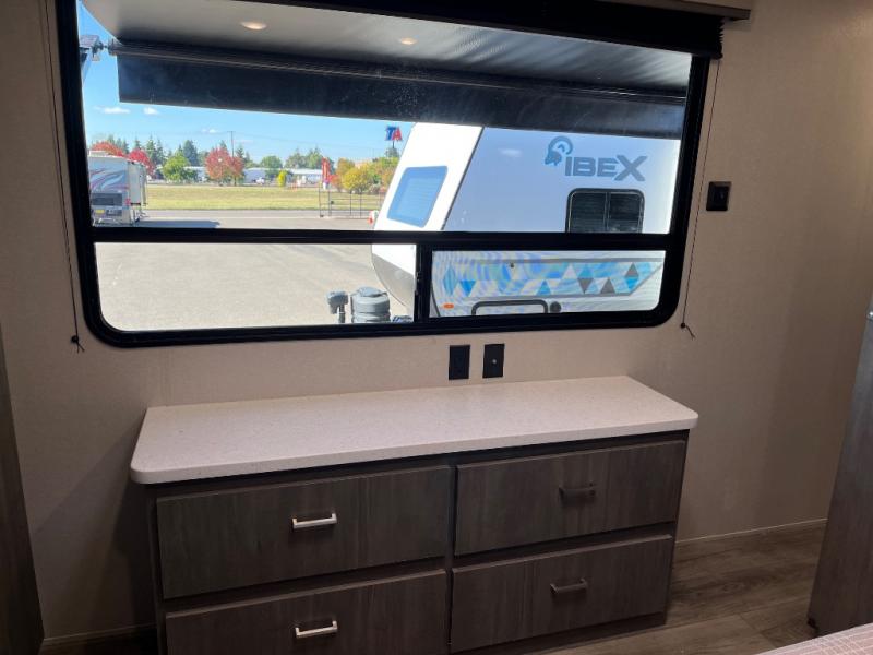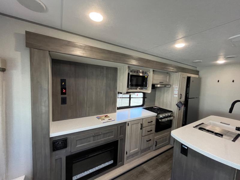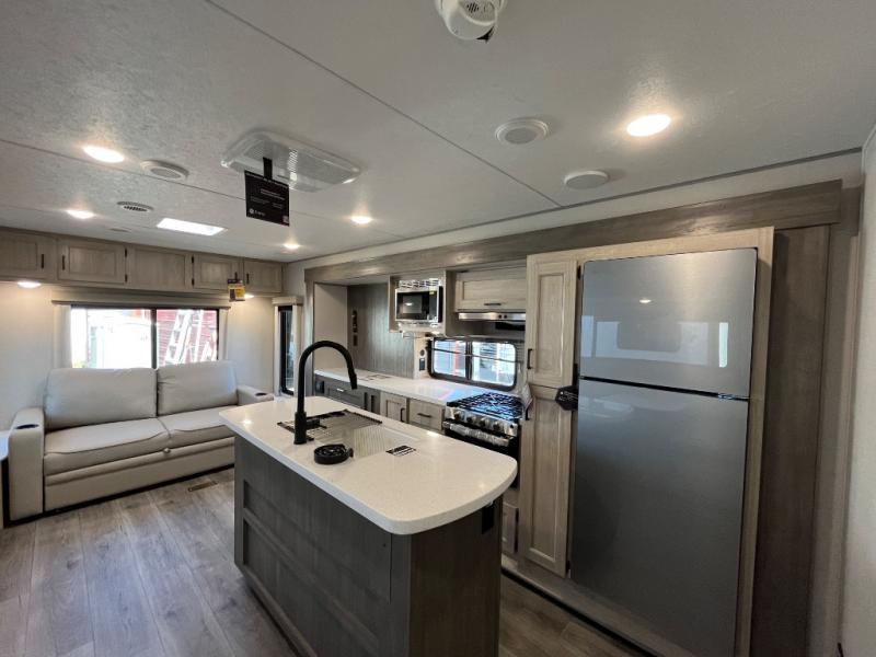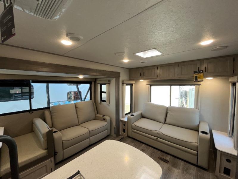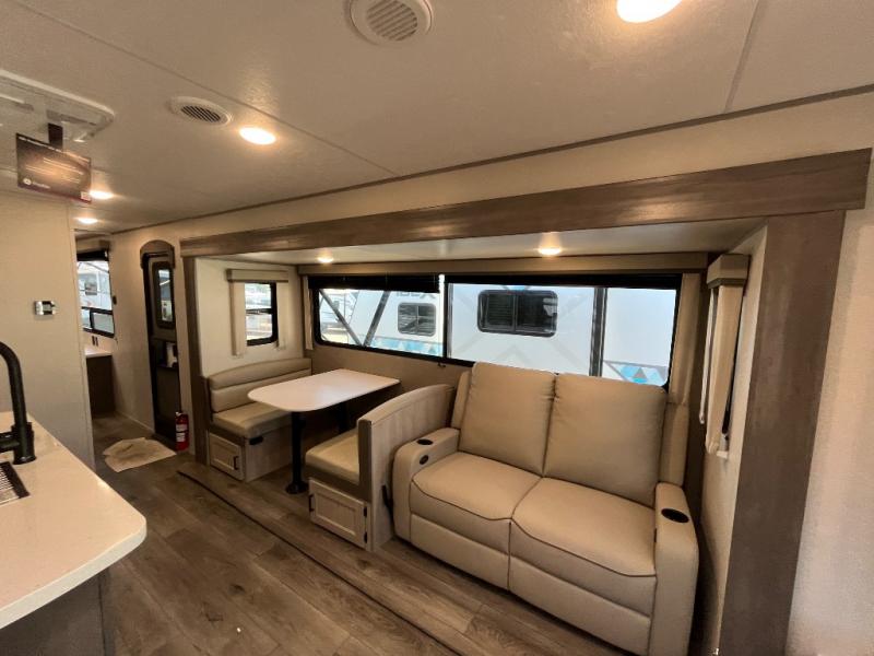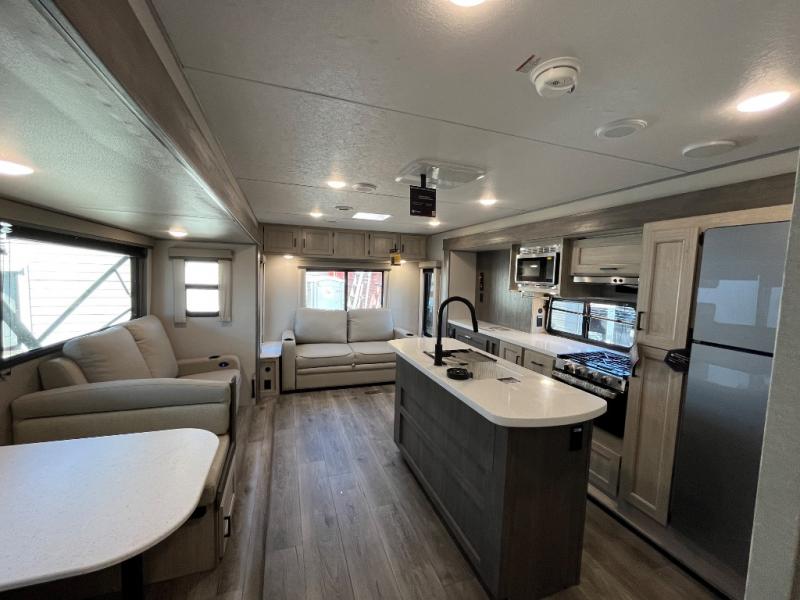 It's not hard to find comfort in this travel trailer with its triple slides, theater seating, and spacious full bath. Once your crew is settled and unpacked, head outdoors to relax under the two power awnings with multicolored LED lights, or grab the fishing poles from the exterior storage and head to the water. If you'd rather spend your day inside you'll find all the comforts of home; theater seating, a sofa and booth dinette, plus a fully equipped kitchen, complete with a kitchen island! You will love having your own space in the front bedroom that includes a queen bed slide out, a dresser, plus two closets. There is even washer and dryer prep if you plan to go full-time!