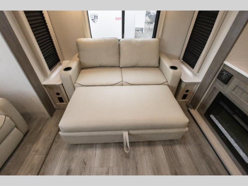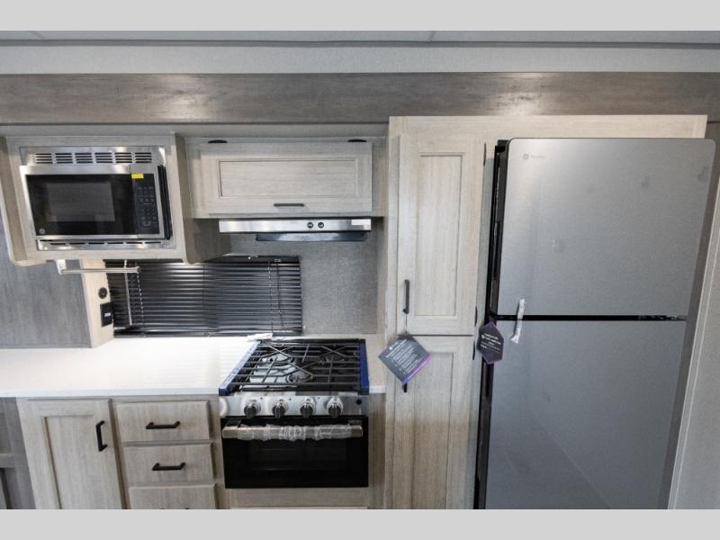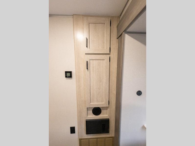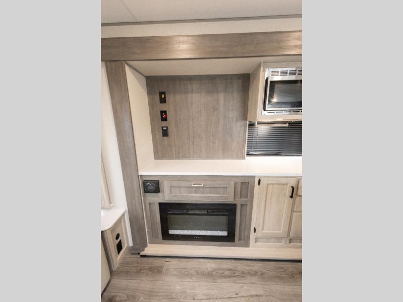 It's not hard to find comfort in this travel trailer with its triple slides, theater seating, and spacious full bath. Once your crew is settled and unpacked, head outdoors to relax under the two power awnings with multicolored LED lights, or grab the fishing poles from the exterior storage and head to the water. If you'd rather spend your day inside you'll find all the comforts of home; theater seating, a sofa and booth dinette, plus a fully equipped kitchen, complete with a kitchen island! You will love having your own space in the front bedroom that includes a queen bed slide out, a dresser, plus two closets. There is even washer and dryer prep if you plan to go full-time!