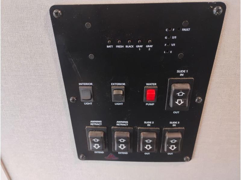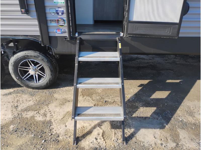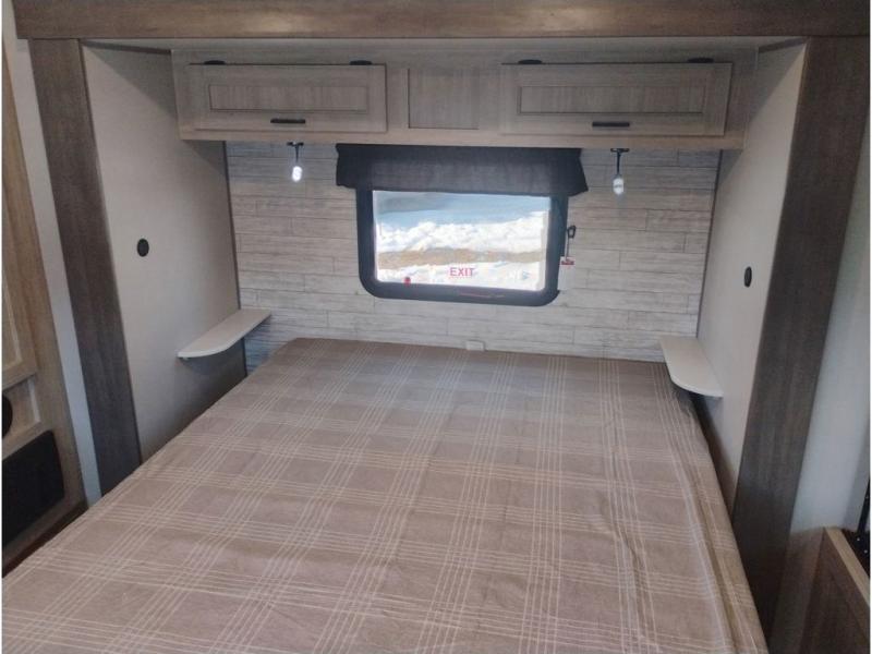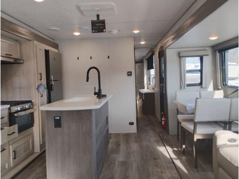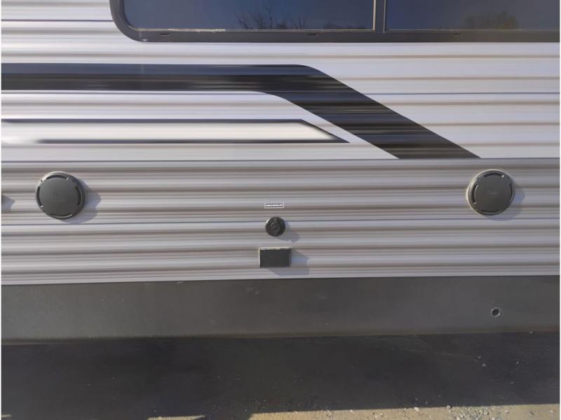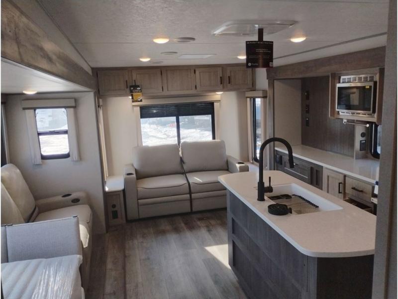 It's not hard to find comfort in this travel trailer with its triple slides, theater seating, and spacious full bath. Once your crew is settled and unpacked, head outdoors to relax under the two power awnings with multicolored LED lights, or grab the fishing poles from the exterior storage and head to the water. If you'd rather spend your day inside you'll find all the comforts of home; theater seating, a sofa and booth dinette, plus a fully equipped kitchen, complete with a kitchen island! You will love having your own space in the front bedroom that includes a queen bed slide out, a dresser, plus two closets. There is even washer and dryer prep if you plan to go full-time!