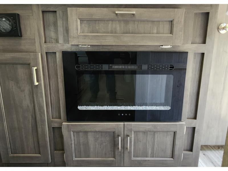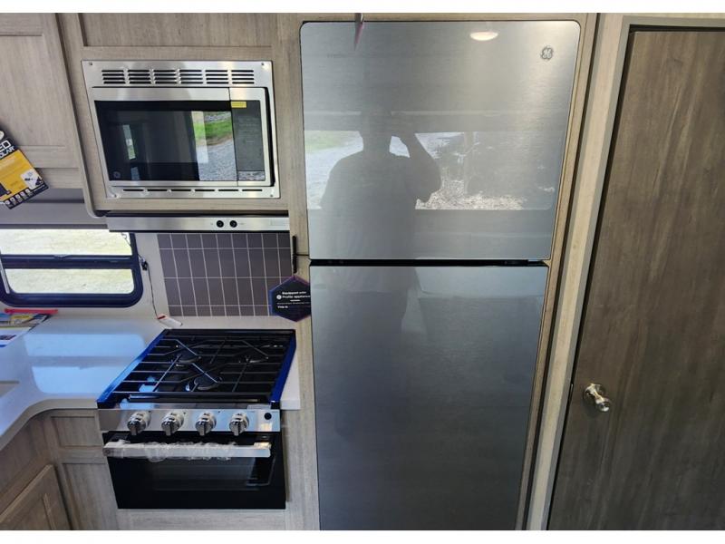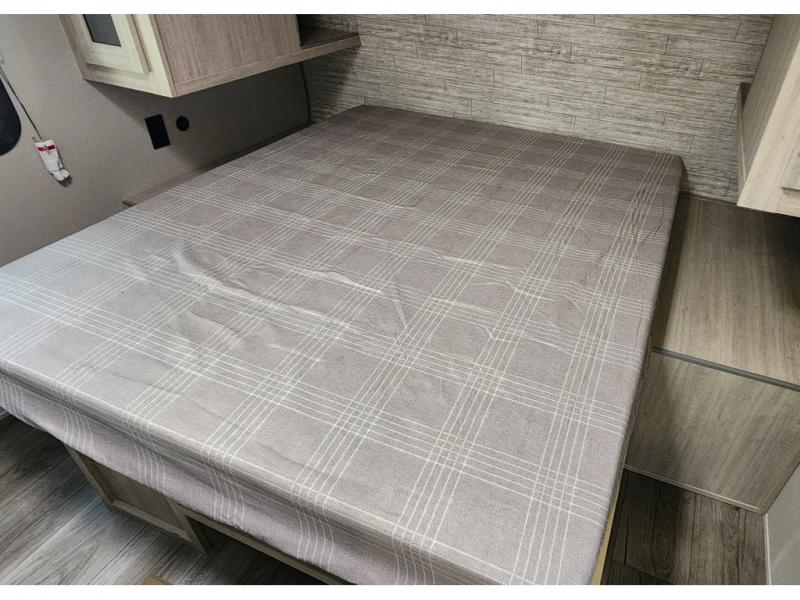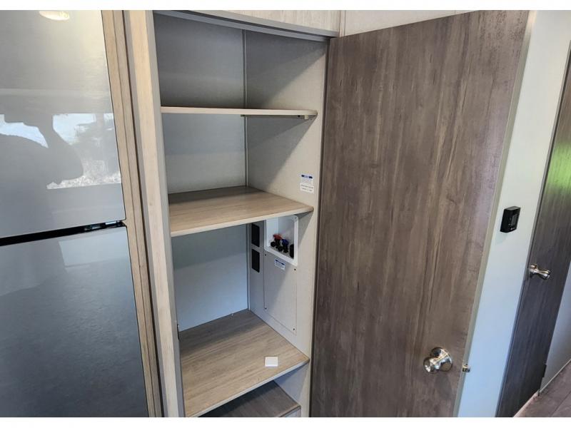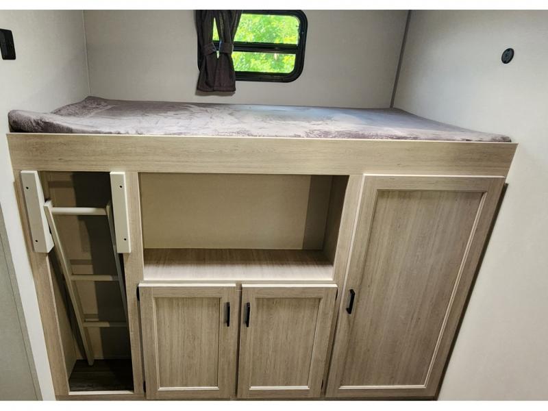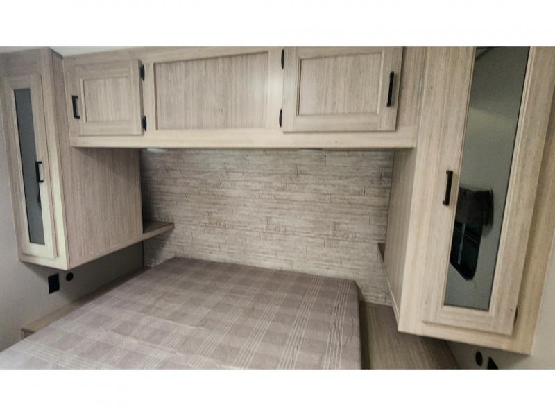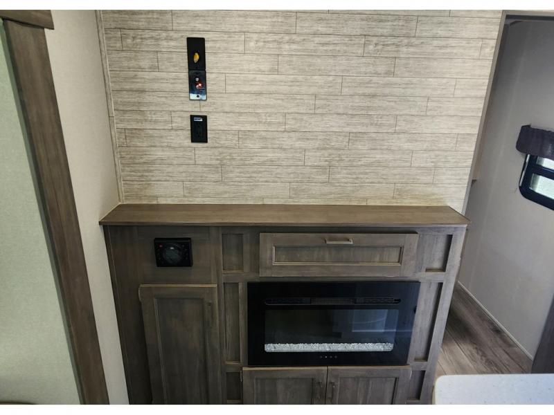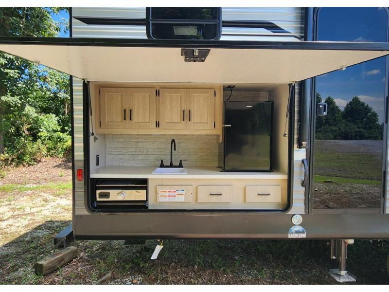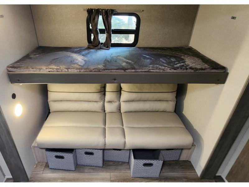 If you enjoy hiking, biking, and fishing, and waking up to beautiful scenery from your own comforts, then start camping with this trailer at the campsite! You will be able to sleep like a queen on the walk-around bed with dual wardrobes and overhead storage for more items in the front private bedroom while your family or friends have their own privacy in the bunkhouse complete with two bunks, a jack knife sofa with storage totes below and a TV/wardrobe cabinet for even more storage. The full bathroom includes the second entry/exit door for convenience when outside under the 21' electric awning with multicolor LED lights, or while cooking using the full size camper kitchen along the exterior. There are full kitchen amenities inside including a 10 cu. ft. refrigerator and a pantry.