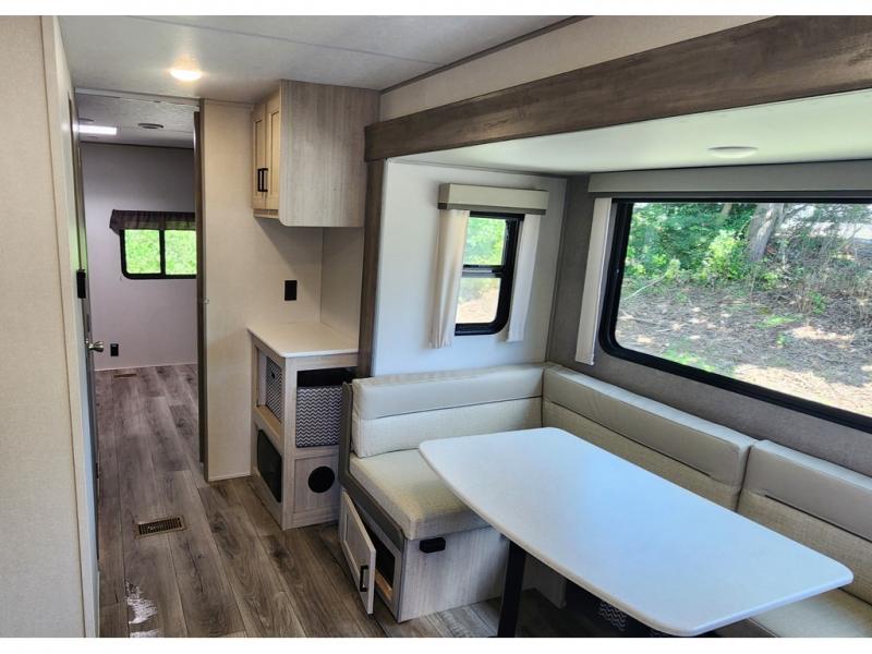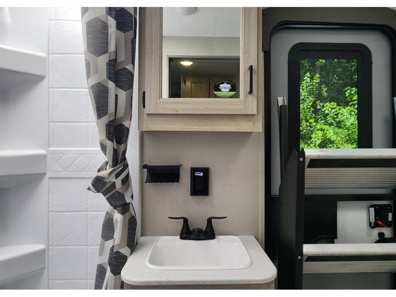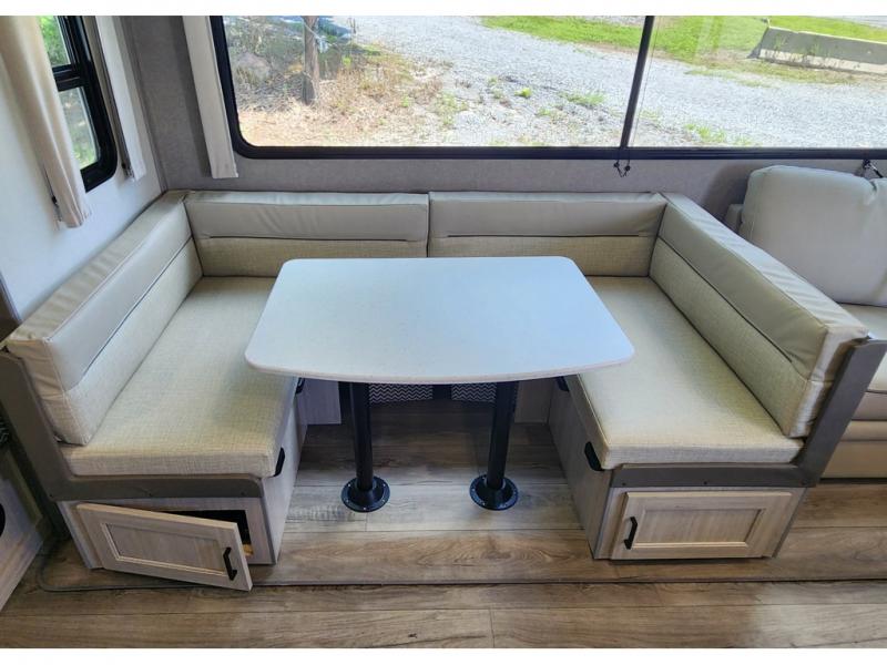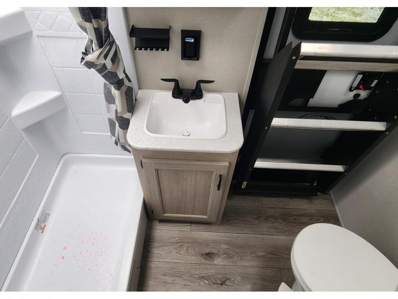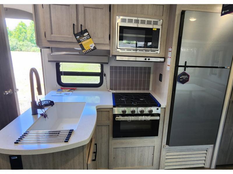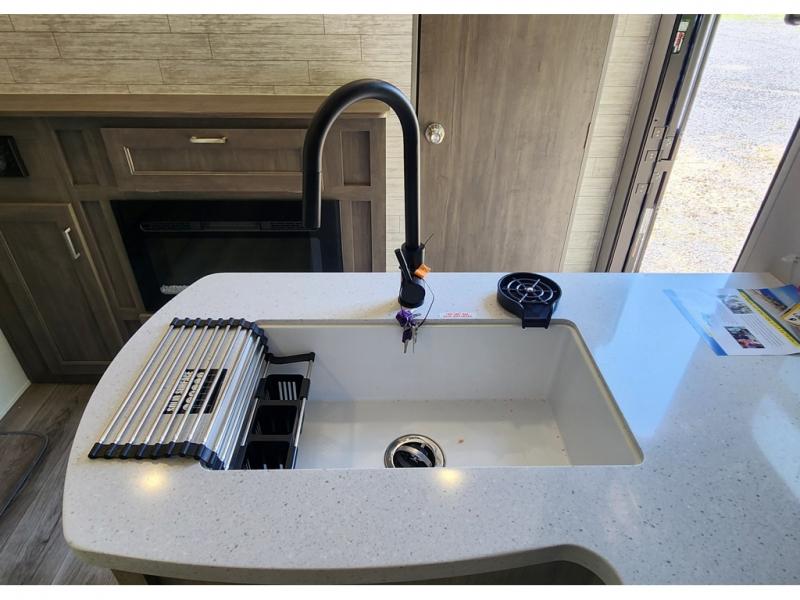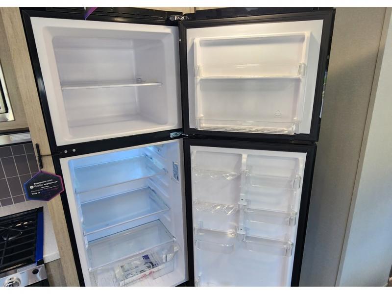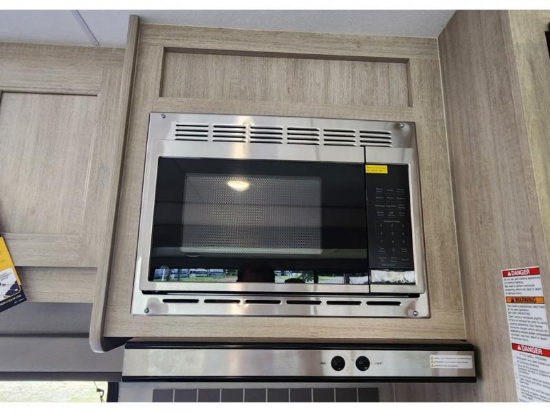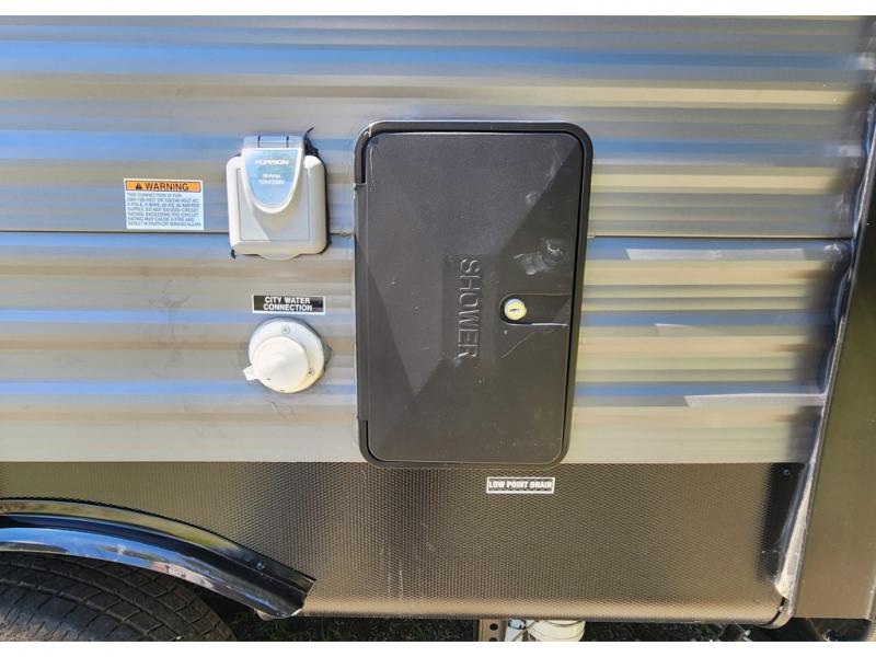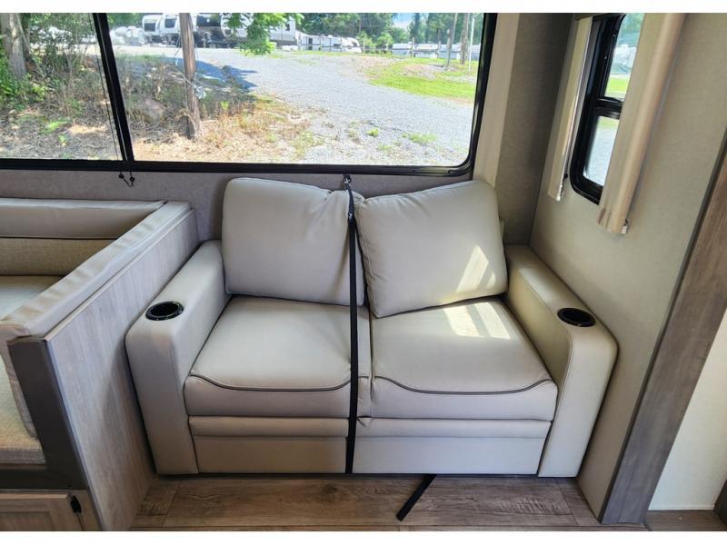 If you enjoy hiking, biking, and fishing, and waking up to beautiful scenery from your own comforts, then start camping with this trailer at the campsite! You will be able to sleep like a queen on the walk-around bed with dual wardrobes and overhead storage for more items in the front private bedroom while your family or friends have their own privacy in the bunkhouse complete with two bunks, a jack knife sofa with storage totes below and a TV/wardrobe cabinet for even more storage. The full bathroom includes the second entry/exit door for convenience when outside under the 21' electric awning with multicolor LED lights, or while cooking using the full size camper kitchen along the exterior. There are full kitchen amenities inside including a 10 cu. ft. refrigerator and a pantry.
