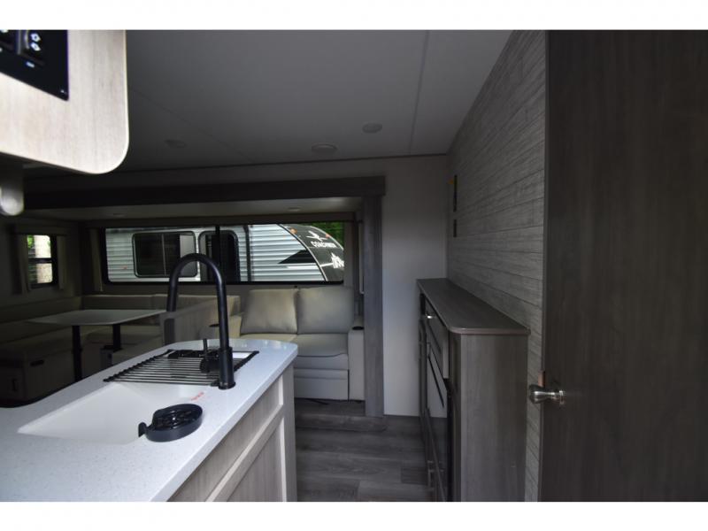If you enjoy hiking, biking, and fishing, and waking up to beautiful scenery from your own comforts, then start camping with this trailer at the campsite! You will be able to sleep like a queen on the walk-around bed with dual wardrobes and overhead storage for more items in the front private bedroom while your family or friends have their own privacy in the bunkhouse complete with two bunks, a jack knife sofa with storage totes below and a TV/wardrobe cabinet for even more storage. The full bathroom includes the second entry/exit door for convenience when outside under the 21' electric awning with multicolor LED lights, or while cooking using the full size camper kitchen along the exterior. There are full kitchen amenities inside including a 10 cu. ft. refrigerator and a pantry.