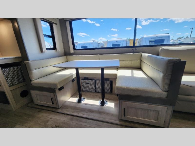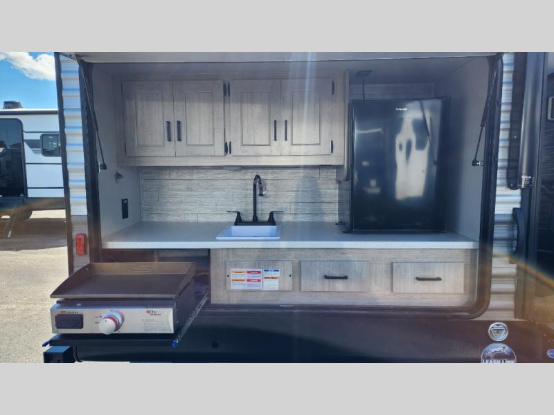 If you enjoy hiking, biking, and fishing, and waking up to beautiful scenery from your own comforts, then start camping with this trailer at the campsite! You will be able to sleep like a queen on the walk-around bed with dual wardrobes and overhead storage for more items in the front private bedroom while your family or friends have their own privacy in the bunkhouse complete with two bunks, a jack knife sofa with storage totes below and a TV/wardrobe cabinet for even more storage. The full bathroom includes the second entry/exit door for convenience when outside under the 21' electric awning with multicolor LED lights, or while cooking using the full size camper kitchen along the exterior. There are full kitchen amenities inside including a 10 cu. ft. refrigerator and a pantry.