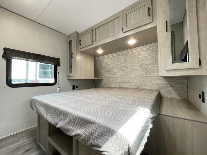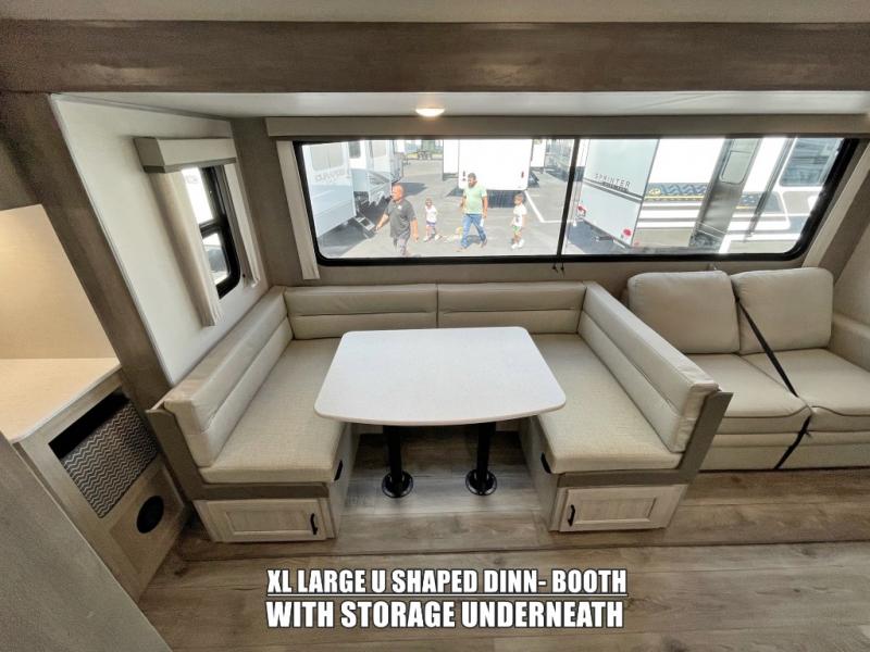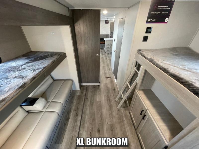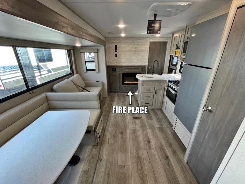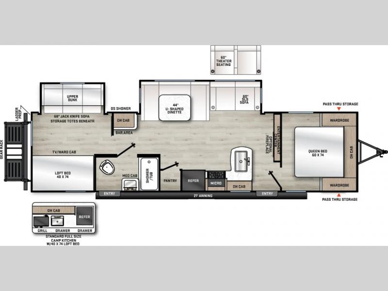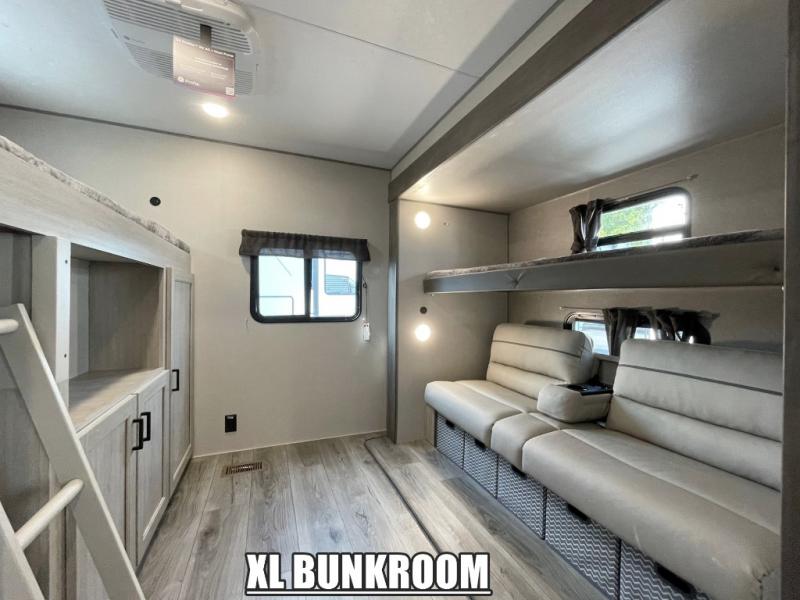 If you enjoy hiking, biking, and fishing, and waking up to beautiful scenery from your own comforts, then start camping with this trailer at the campsite! You will be able to sleep like a queen on the walk-around bed with dual wardrobes and overhead storage for more items in the front private bedroom while your family or friends have their own privacy in the bunkhouse complete with two bunks, a jack knife sofa with storage totes below and a TV/wardrobe cabinet for even more storage. The full bathroom includes the second entry/exit door for convenience when outside under the 21' electric awning with multicolor LED lights, or while cooking using the full size camper kitchen along the exterior. There are full kitchen amenities inside including a 10 cu. ft. refrigerator and a pantry.