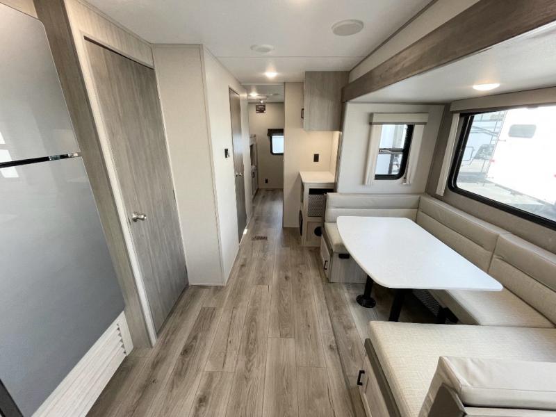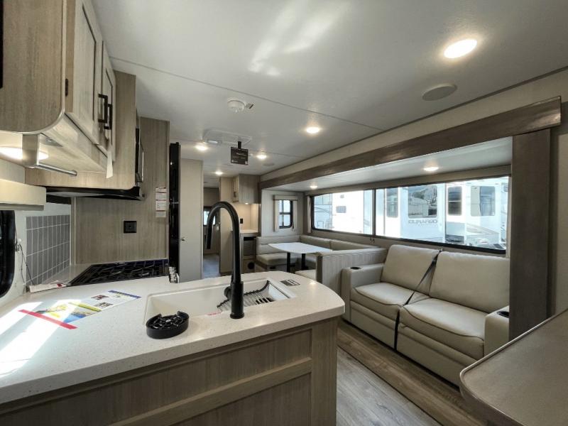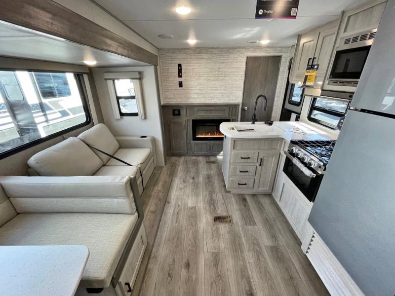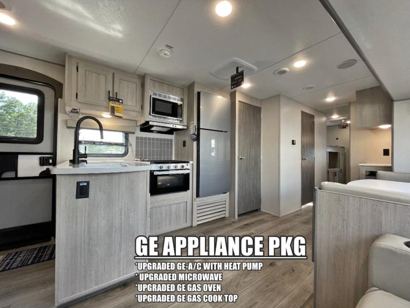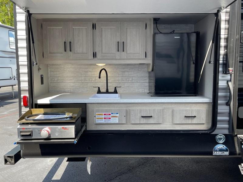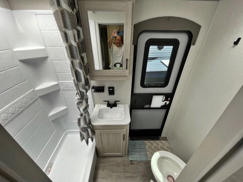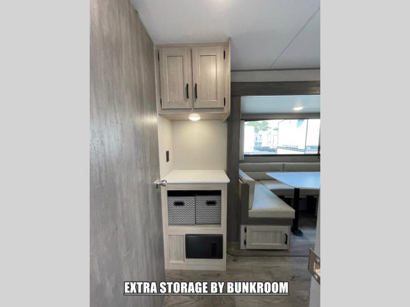 If you enjoy hiking, biking, and fishing, and waking up to beautiful scenery from your own comforts, then start camping with this trailer at the campsite! You will be able to sleep like a queen on the walk-around bed with dual wardrobes and overhead storage for more items in the front private bedroom while your family or friends have their own privacy in the bunkhouse complete with two bunks, a jack knife sofa with storage totes below and a TV/wardrobe cabinet for even more storage. The full bathroom includes the second entry/exit door for convenience when outside under the 21' electric awning with multicolor LED lights, or while cooking using the full size camper kitchen along the exterior. There are full kitchen amenities inside including a 10 cu. ft. refrigerator and a pantry.