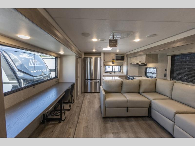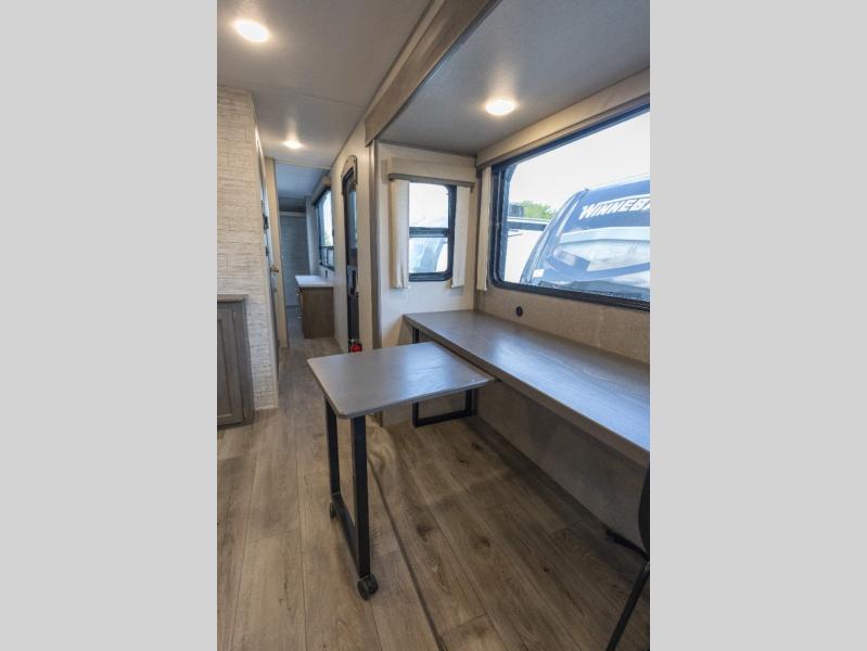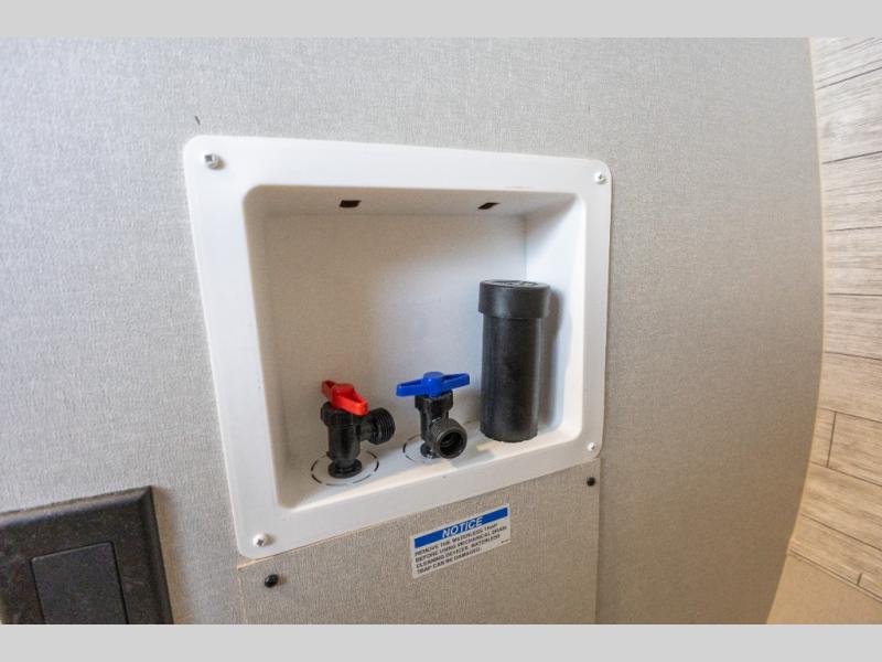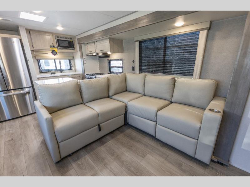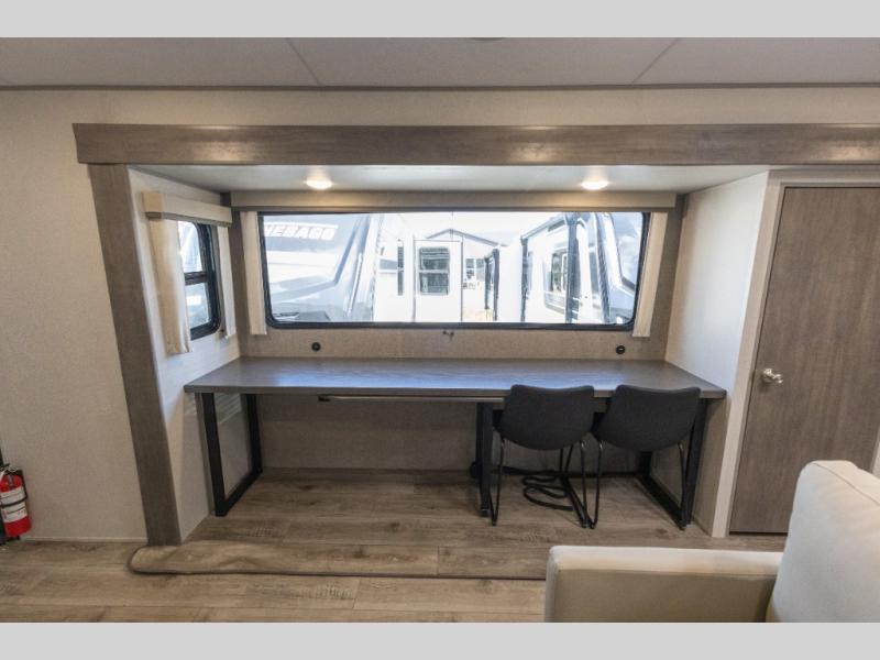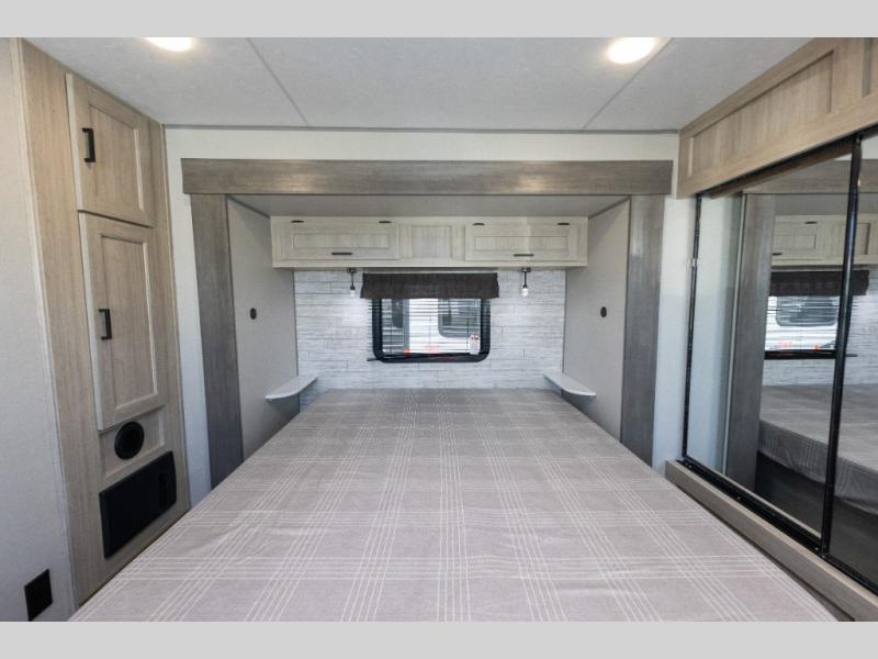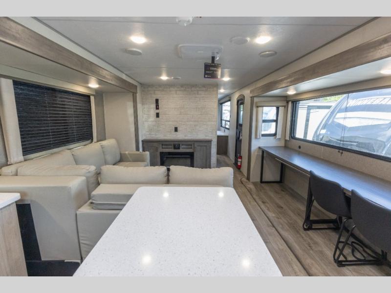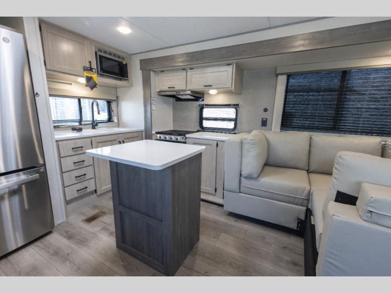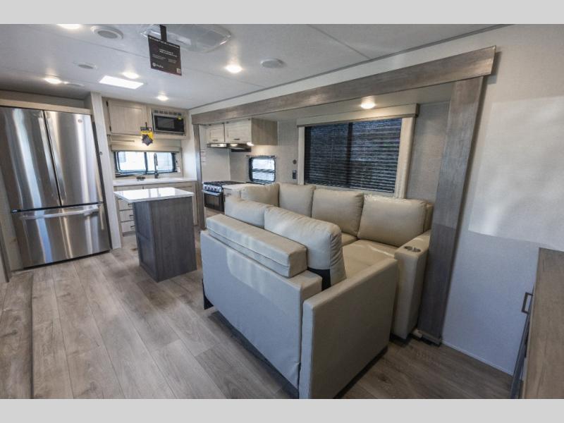This travel trailer rear kitchen will make you feel like home is on the road, featuring a spacious pantry, residential refrigerator, overhead cabinets, microwave, kitchen island, and sliding desk/table for all your cooking and dining needs. The dining counter and chairs provide the perfect place to enjoy meals with family and friends. The living room boasts a comfortable sectional sofa and TV/entertainment center for relaxing and having fun with your favorite person, whether you're watching your favorite movie, playing games, or simply enjoying quality time with loved ones, this space has everything you need. Moreover, the full bathroom is super complete with a wardrobe, linen closet, and all the amenities you need to freshen up and feel at home. Plus, you and your partner will love this front bedroom, since it is private, featuring a comfortable queen bed, and dresser ideal for keeping your clothes organized, overhead cabinets, closet, and washer/dryer prep for all your laundry needs, making this space the perfect place to rest and recharge after a long day of adventure. Outside, you'll appreciate the two awnings (10' and 13') for shade and protection from the elements, as well as the exterior storage for all your gear and toys.
