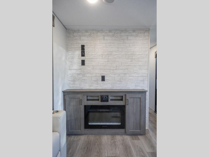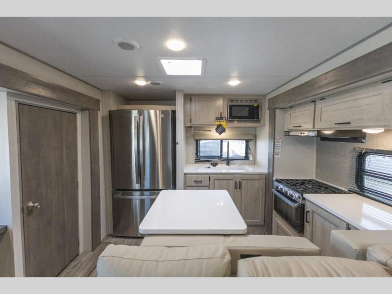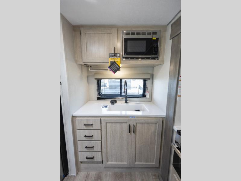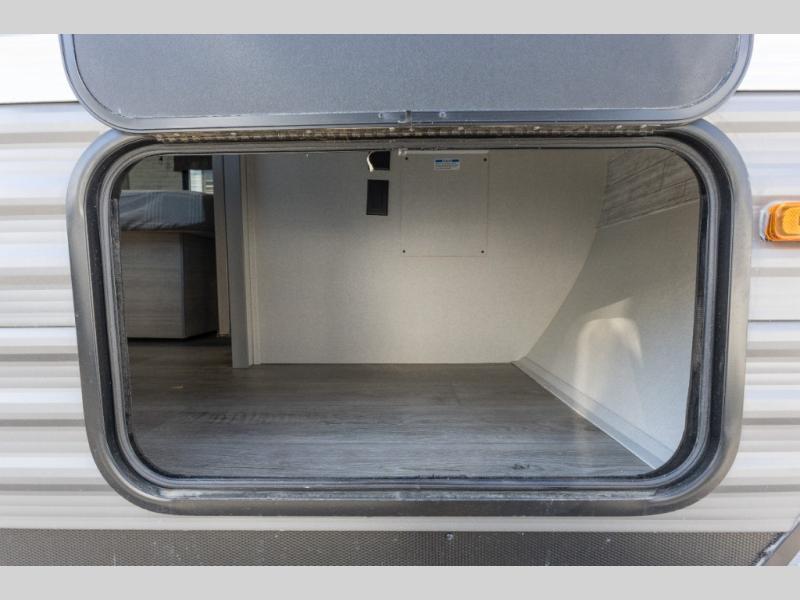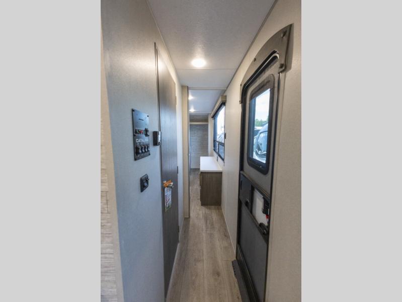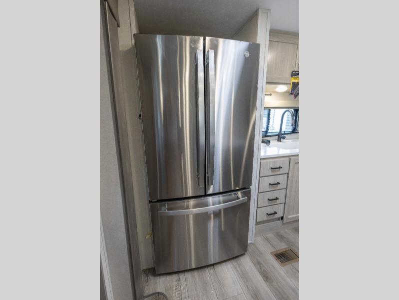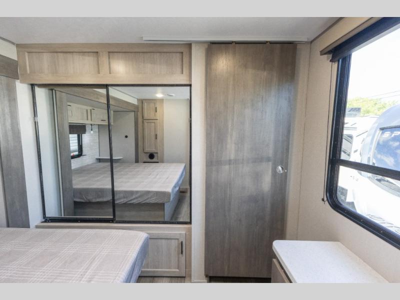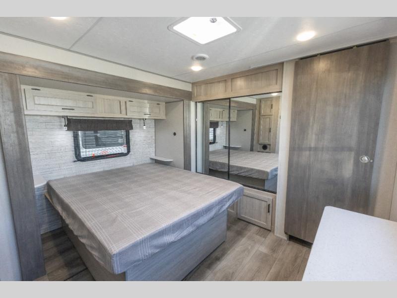 This travel trailer rear kitchen will make you feel like home is on the road, featuring a spacious pantry, residential refrigerator, overhead cabinets, microwave, kitchen island, and sliding desk/table for all your cooking and dining needs. The dining counter and chairs provide the perfect place to enjoy meals with family and friends. The living room boasts a comfortable sectional sofa and TV/entertainment center for relaxing and having fun with your favorite person, whether you're watching your favorite movie, playing games, or simply enjoying quality time with loved ones, this space has everything you need. Moreover, the full bathroom is super complete with a wardrobe, linen closet, and all the amenities you need to freshen up and feel at home. Plus, you and your partner will love this front bedroom, since it is private, featuring a comfortable queen bed, and dresser ideal for keeping your clothes organized, overhead cabinets, closet, and washer/dryer prep for all your laundry needs, making this space the perfect place to rest and recharge after a long day of adventure. Outside, you'll appreciate the two awnings (10' and 13') for shade and protection from the elements, as well as the exterior storage for all your gear and toys.