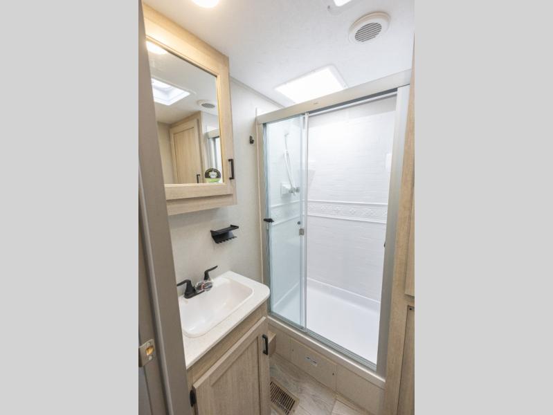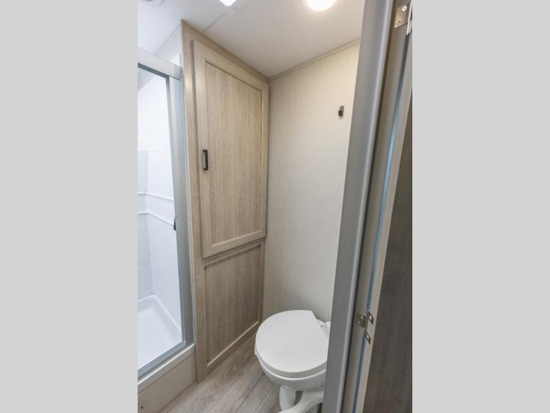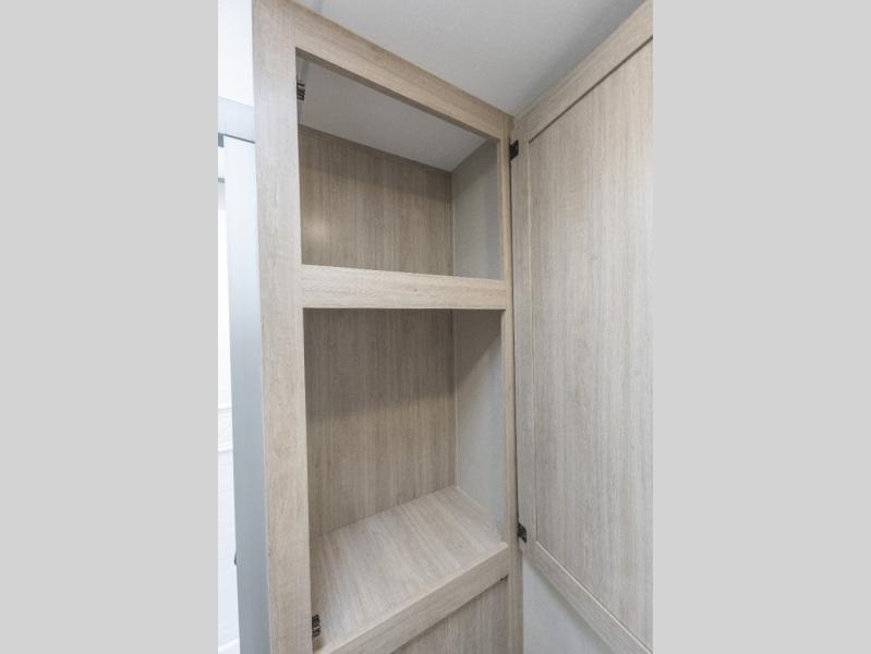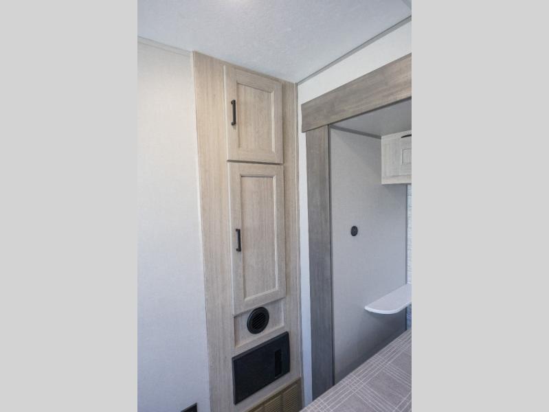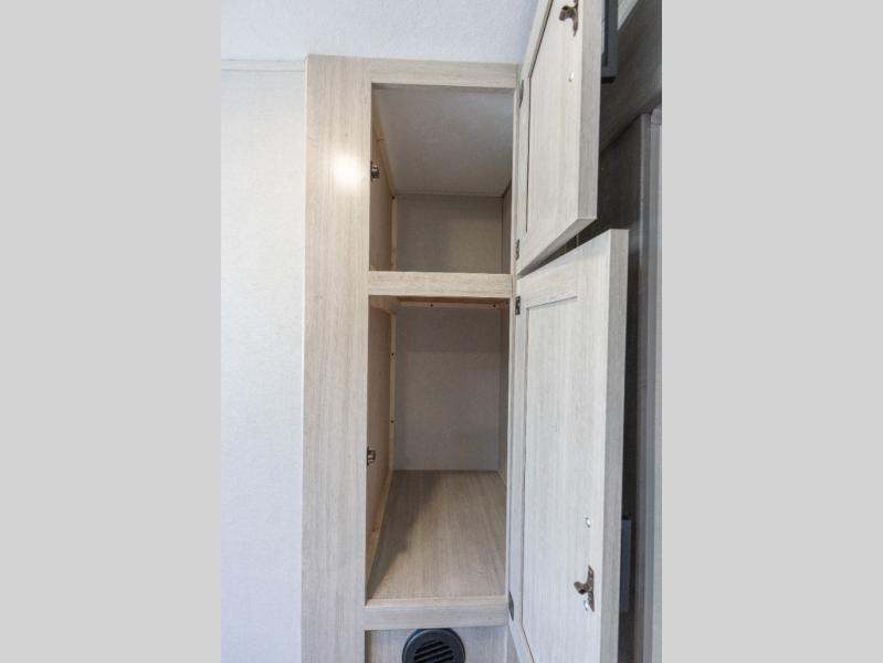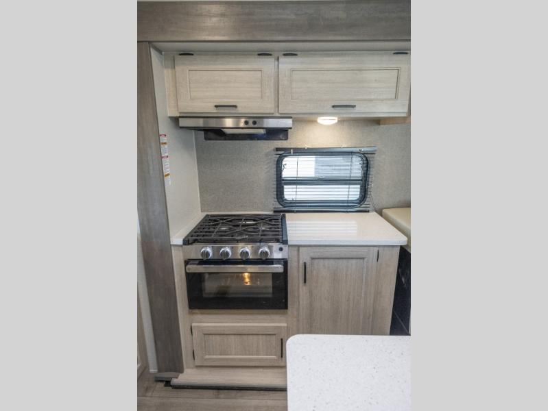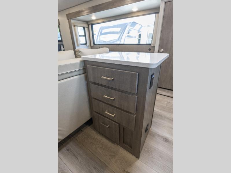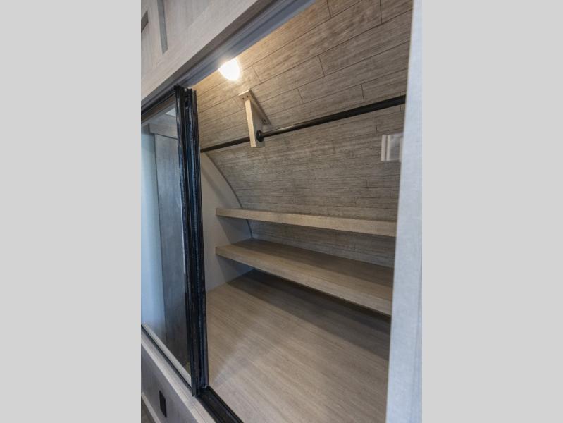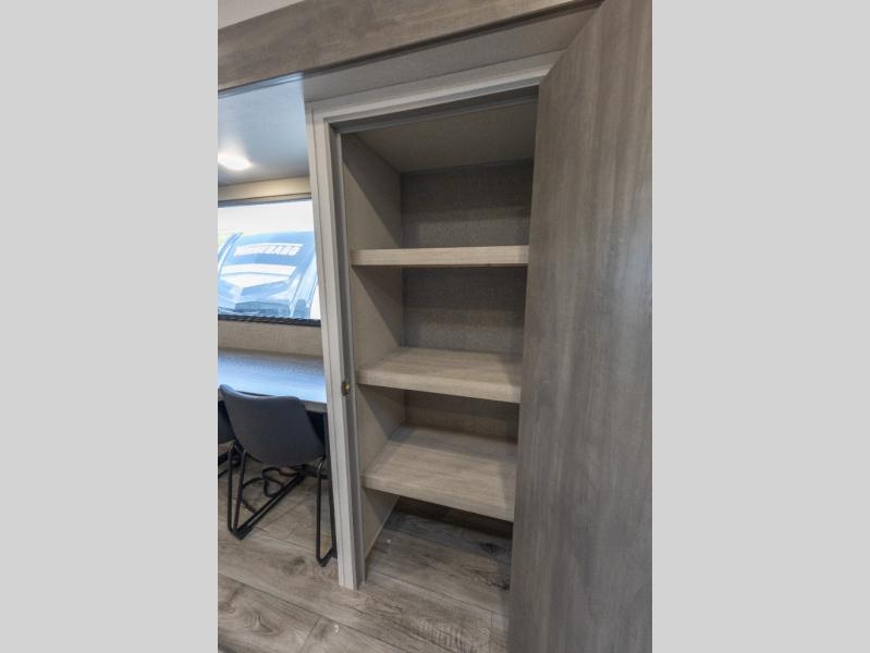 This travel trailer rear kitchen will make you feel like home is on the road, featuring a spacious pantry, residential refrigerator, overhead cabinets, microwave, kitchen island, and sliding desk/table for all your cooking and dining needs. The dining counter and chairs provide the perfect place to enjoy meals with family and friends. The living room boasts a comfortable sectional sofa and TV/entertainment center for relaxing and having fun with your favorite person, whether you're watching your favorite movie, playing games, or simply enjoying quality time with loved ones, this space has everything you need. Moreover, the full bathroom is super complete with a wardrobe, linen closet, and all the amenities you need to freshen up and feel at home. Plus, you and your partner will love this front bedroom, since it is private, featuring a comfortable queen bed, and dresser ideal for keeping your clothes organized, overhead cabinets, closet, and washer/dryer prep for all your laundry needs, making this space the perfect place to rest and recharge after a long day of adventure. Outside, you'll appreciate the two awnings (10' and 13') for shade and protection from the elements, as well as the exterior storage for all your gear and toys.